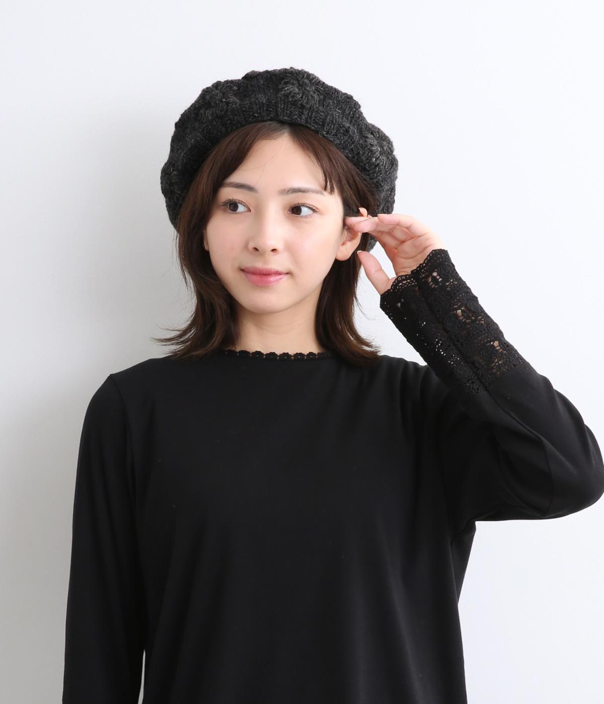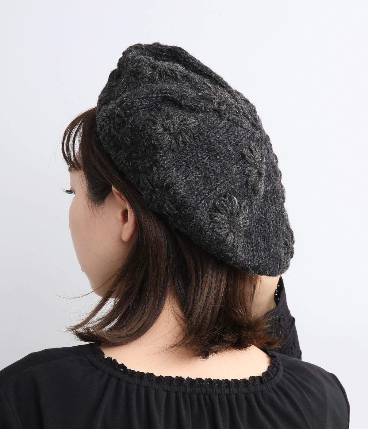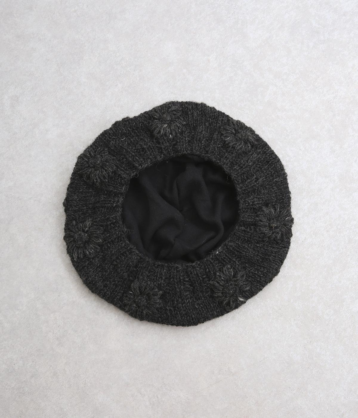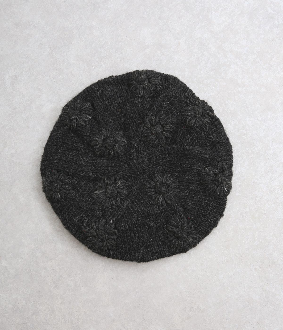 お花のワンポイントのミモザ刺繍を施したシャギーのベレー帽。刺繍は横長の図案を採用し、耳にお花を挿しているようなデザインに仕上げました。素材感が可愛らしく、秋から冬にかけてコーディネートのポイントになるアイテムです。