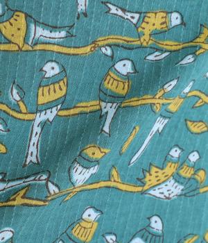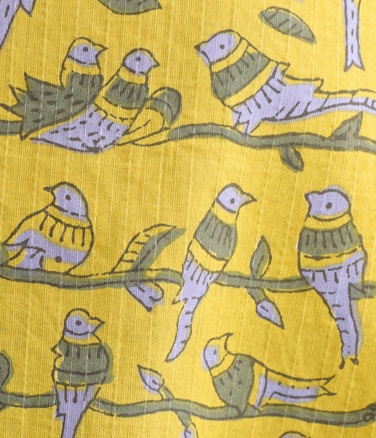 カンタ刺しゅう風のドビー生地にプリントをのせました。ステッチのように見える点々や、限りなくブロックプリントに寄せたスクリーンプリントなど、こだわりの詰まったテキスタイルです。