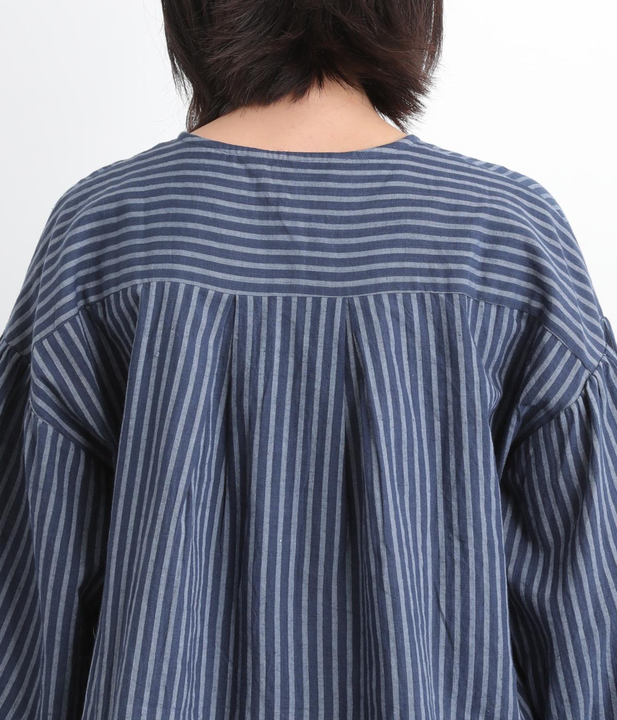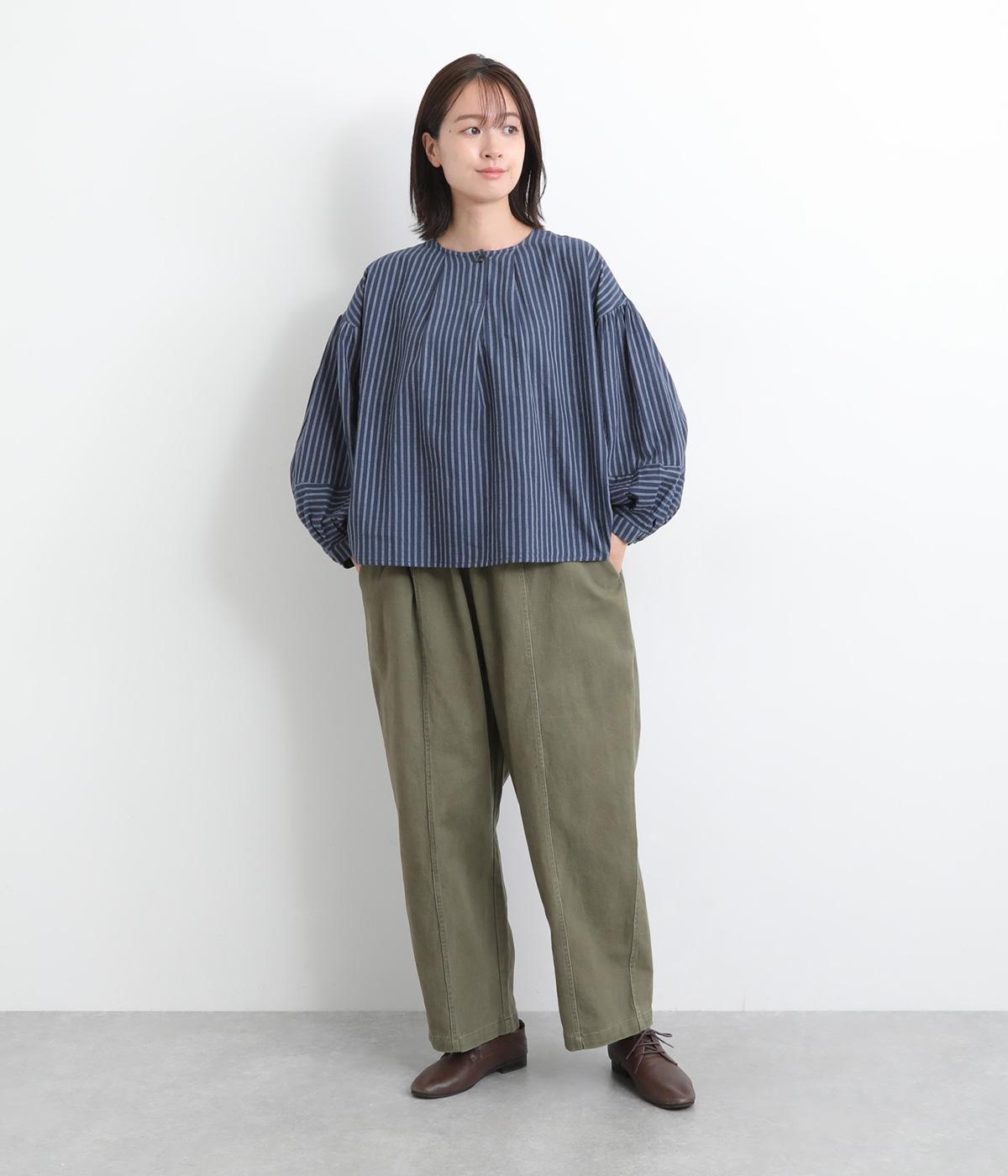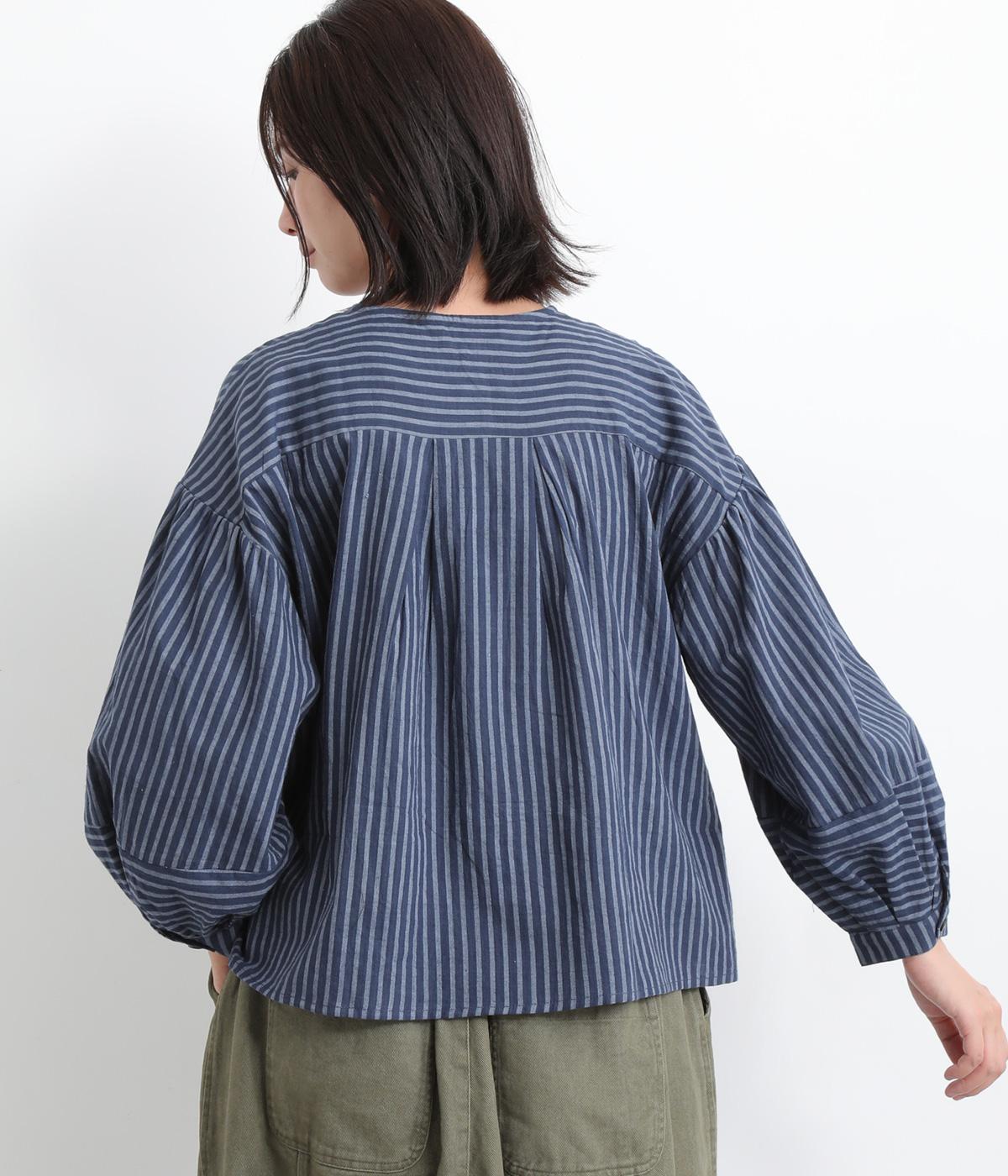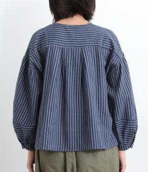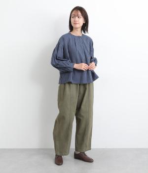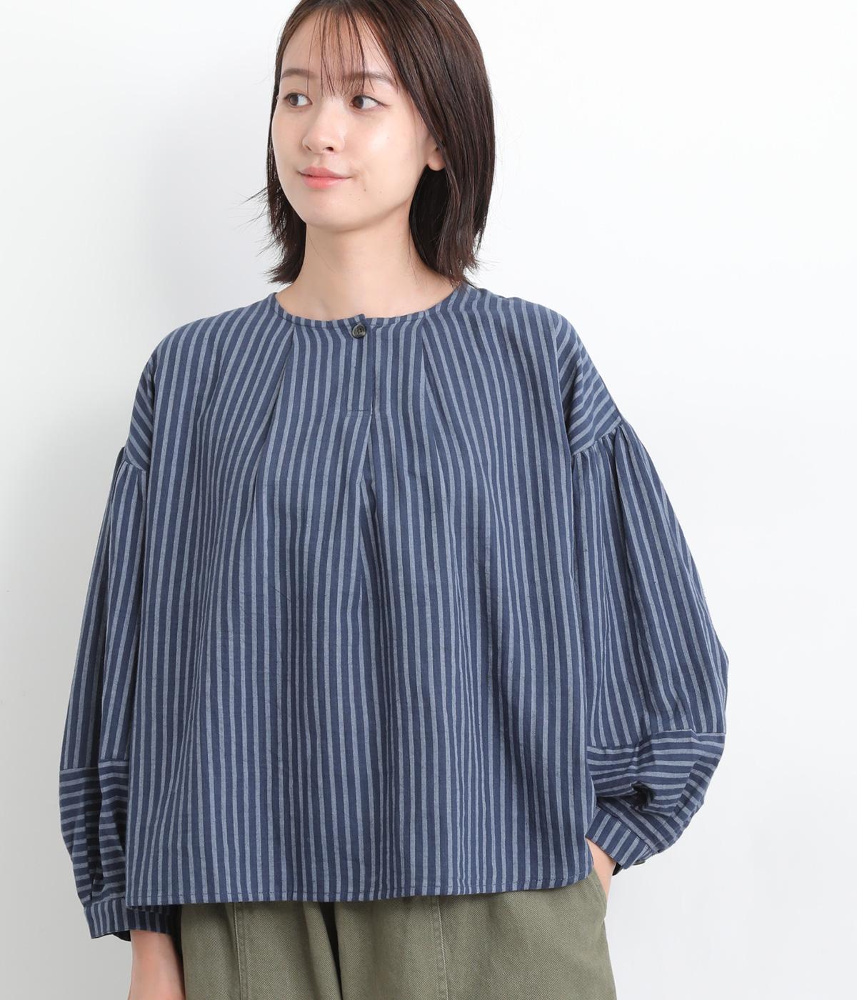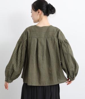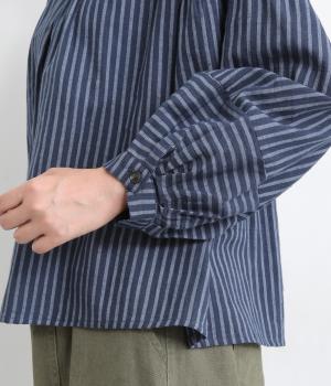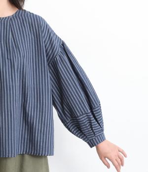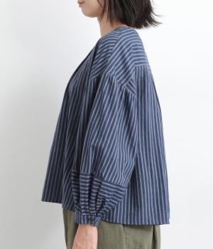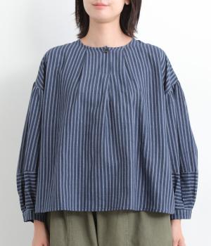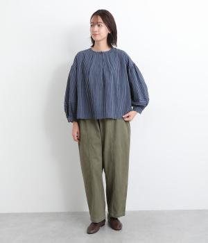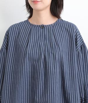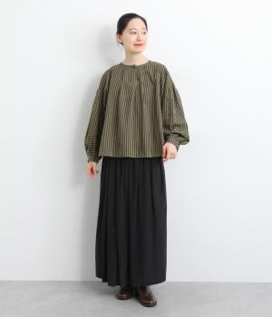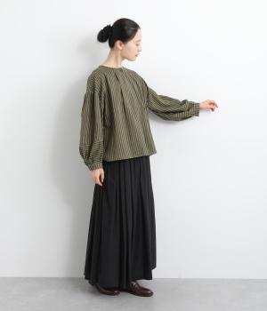 前後にほどこしたタックがふんわりと女性らしいシルエットを描くブラウスです。ほどよい丈感でバランスよく着こなせます。シックなストライプがカジュアルにもきれいめにもマッチ。デイリーに取り入れやすい一枚です。