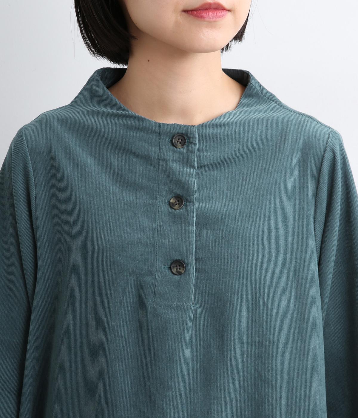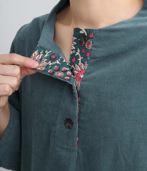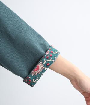 細畝のコットンコーデュロイに、お花のブロックプリントをさりげなく添えました。袖を折り返すとちらりと覗く柄が、大人の遊び心をくすぐります。首元は、ややオフ気味のボトルネックで仕立てました。やさしく立ち上がるラインが、装いに上品さをプラスします。ゆったりとしたシルエットで、重ね着のしやすさも◎。