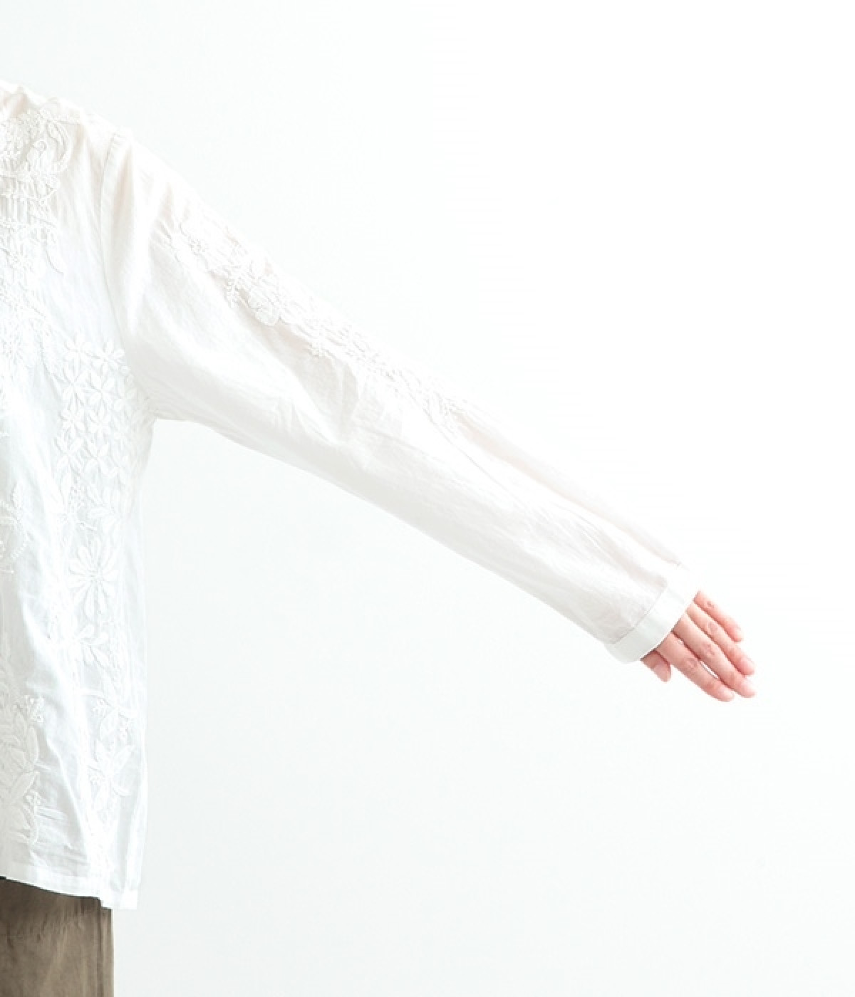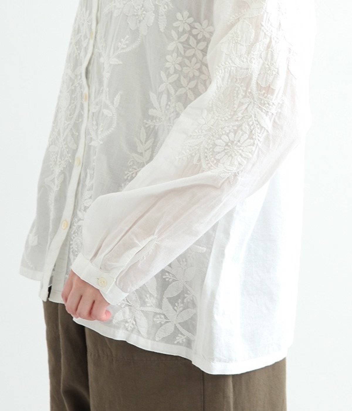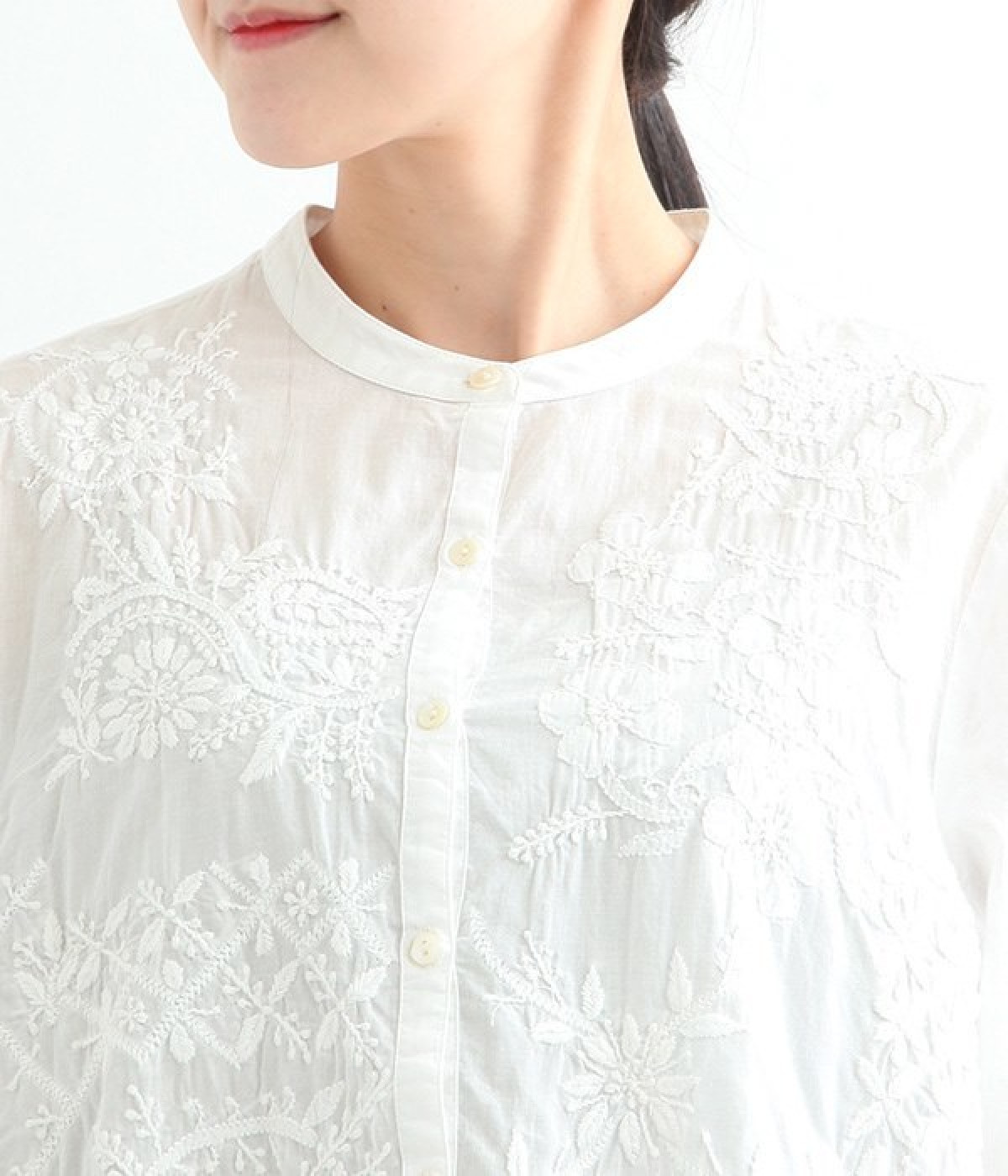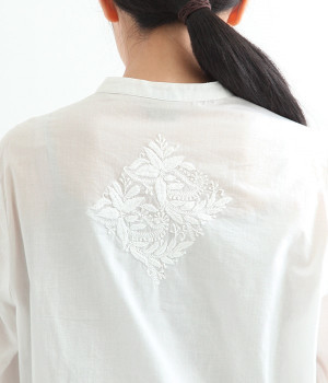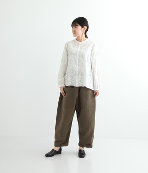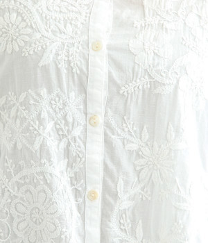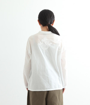 やや薄手でやわらかな風合いのコットンを使用。インド北部に古くから伝わる伝統的なラクノウ刺しゅうをあしらったブラウスです。生地と同色の糸を使うことで落ち着いた雰囲気に仕上がっています。シンプルにボトムと合わせるのはもちろん、ジャケットやサロペットパンツなどのインナーとしても重宝します。