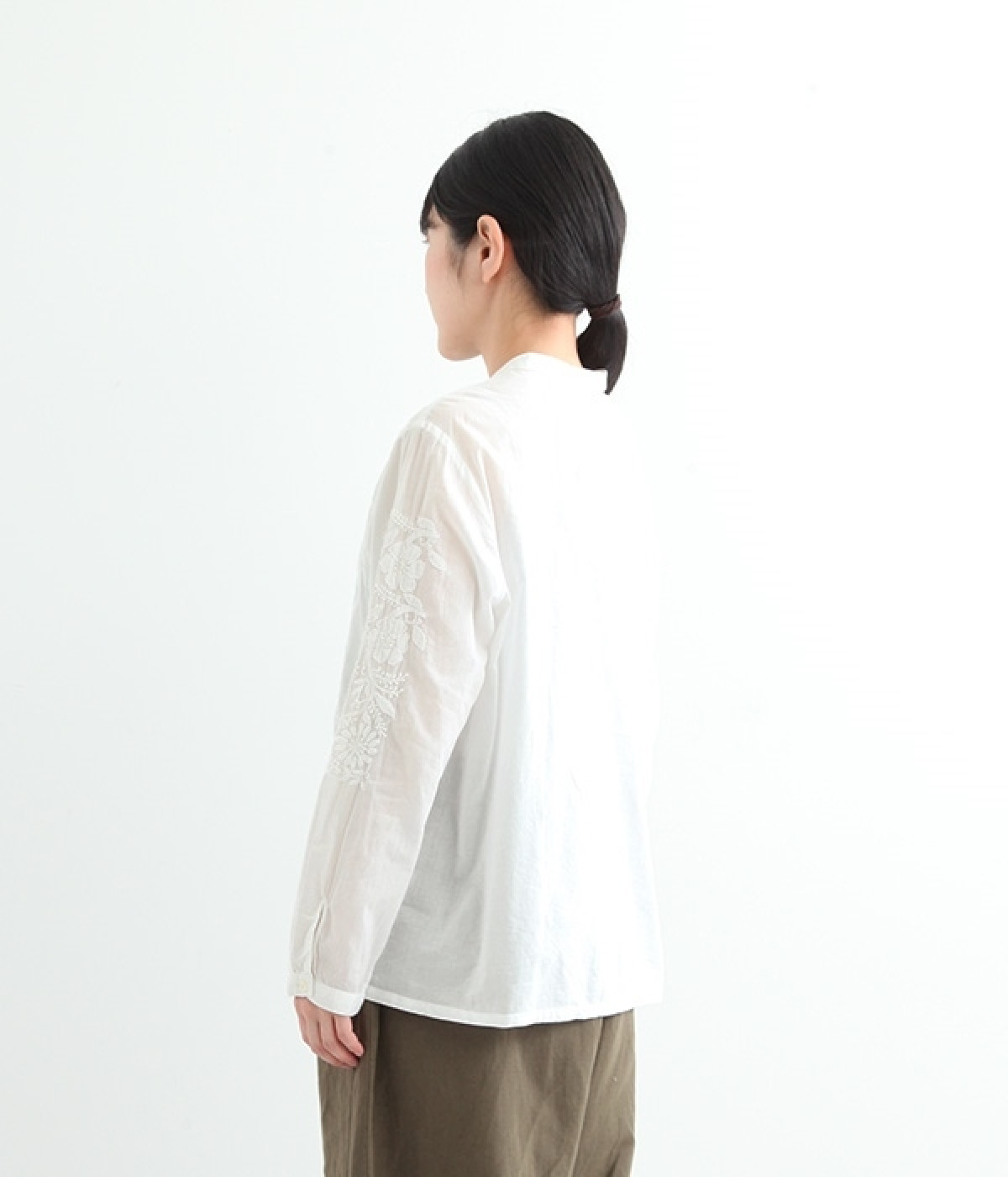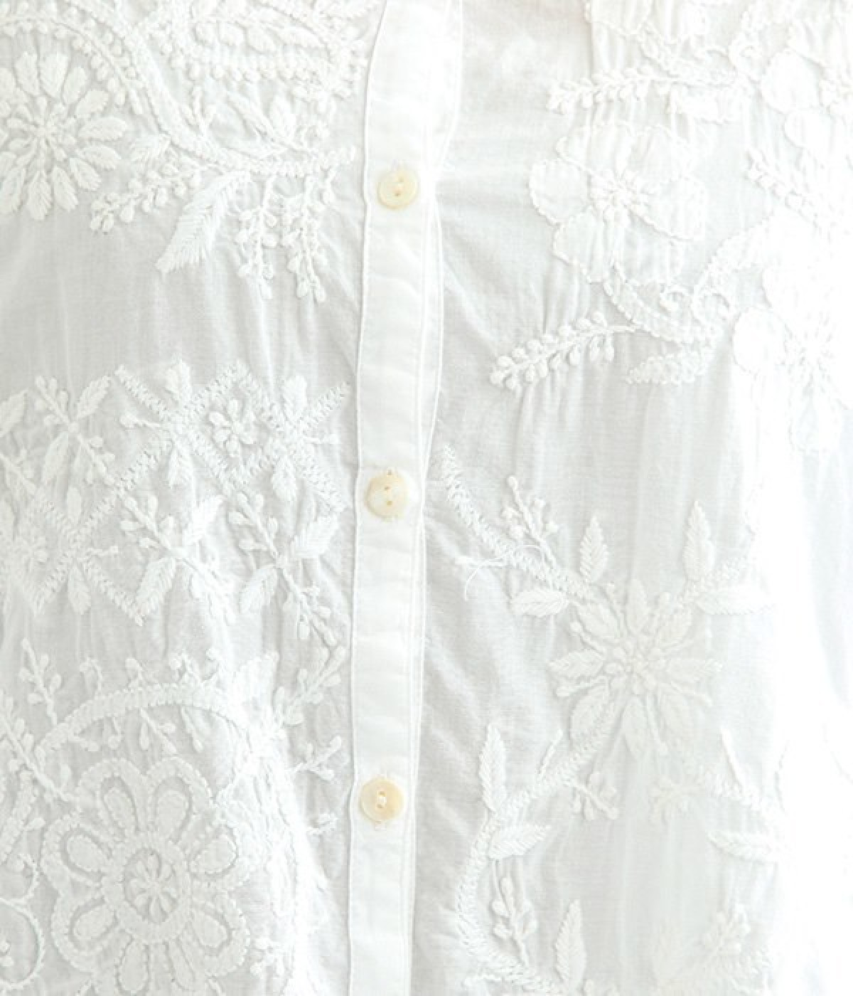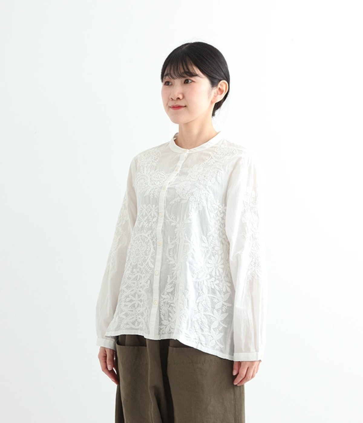 やや薄手でやわらかな風合いのコットンを使用。インド北部に古くから伝わる伝統的なラクノウ刺しゅうをあしらったブラウスです。生地と同色の糸を使うことで落ち着いた雰囲気に仕上がっています。シンプルにボトムと合わせるのはもちろん、ジャケットやサロペットパンツなどのインナーとしても重宝します。