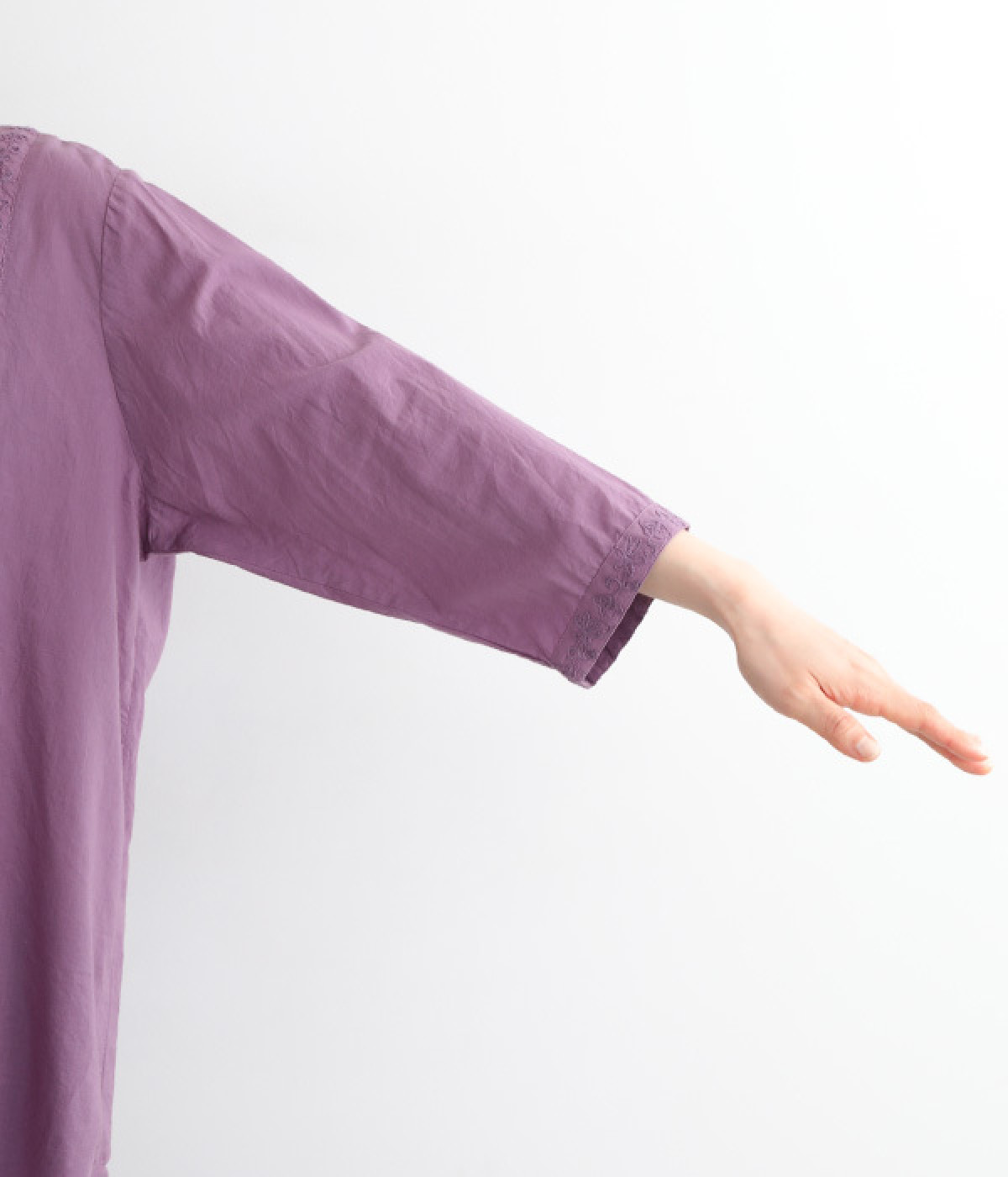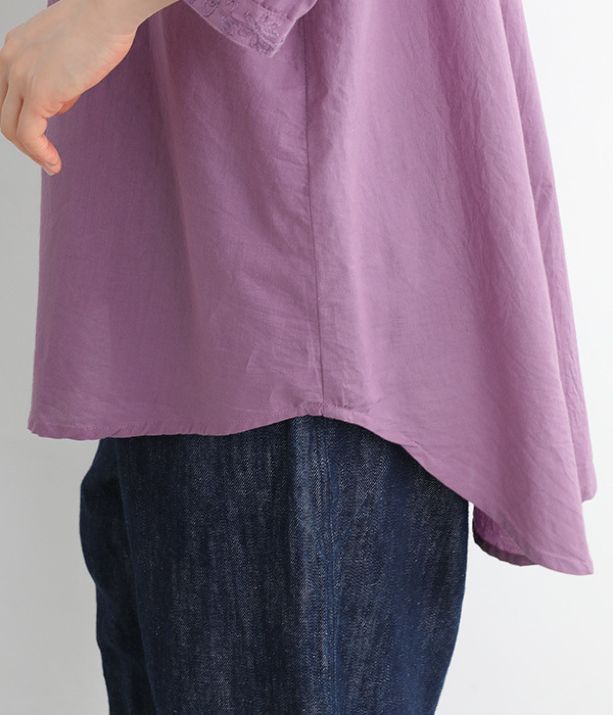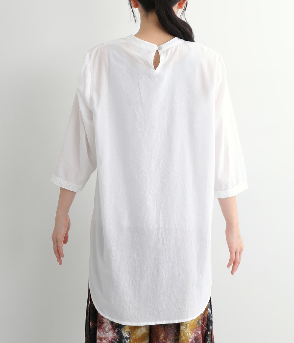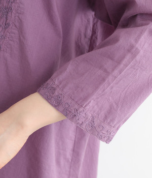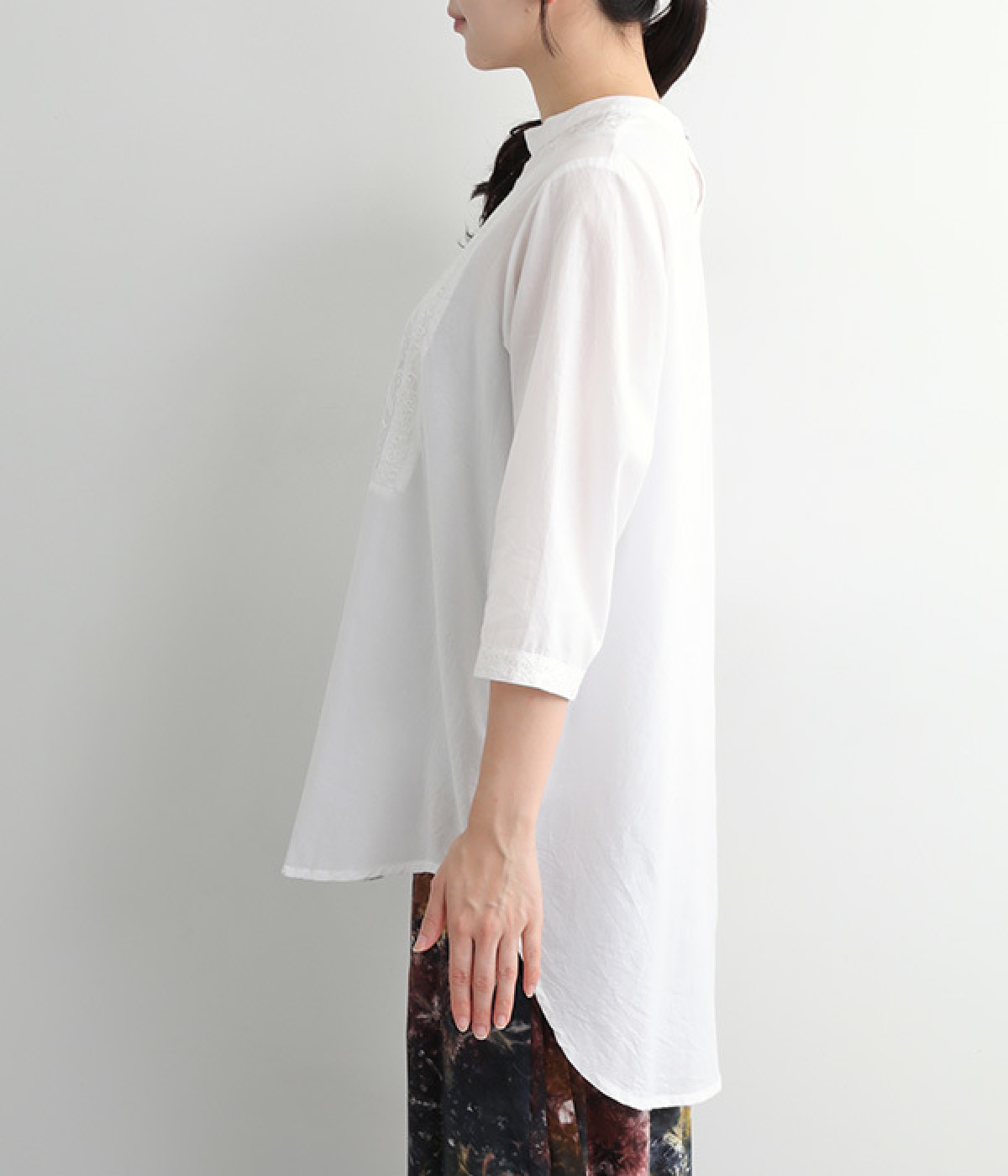 やわらかな肌ざわりのインドコットンで仕立てたブラウス。胸元と袖口には、ロータスの花をモチーフにしたカギ針刺しゅうがほどこされ、職人の繊細な手仕事に目を奪われます。手先をすっきり美しく見せるやや長めの袖は、日よけや温度差対策にも大活躍。腰まわりをカバーするチュニック丈をベースに、後ろの裾をぐっと長くして、風になびくように軽やかなシルエットに仕上げました。アクセサリーなしでも華やぎのある一枚です。