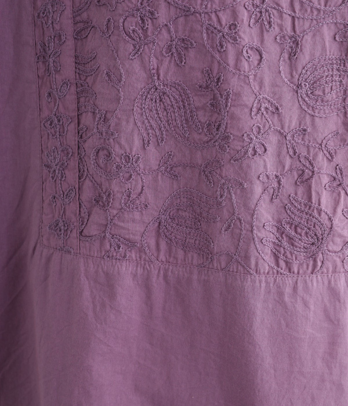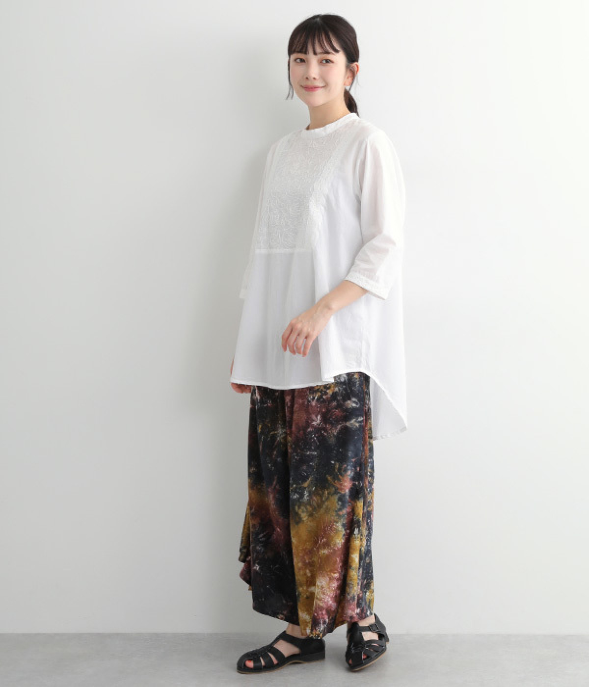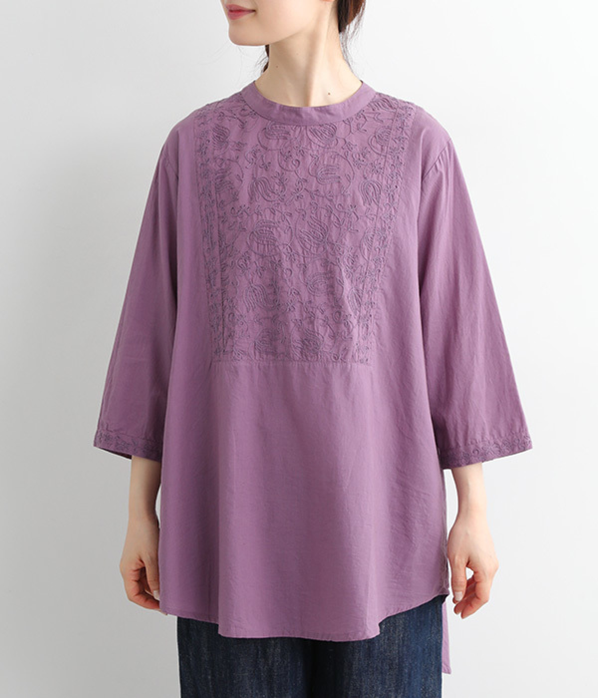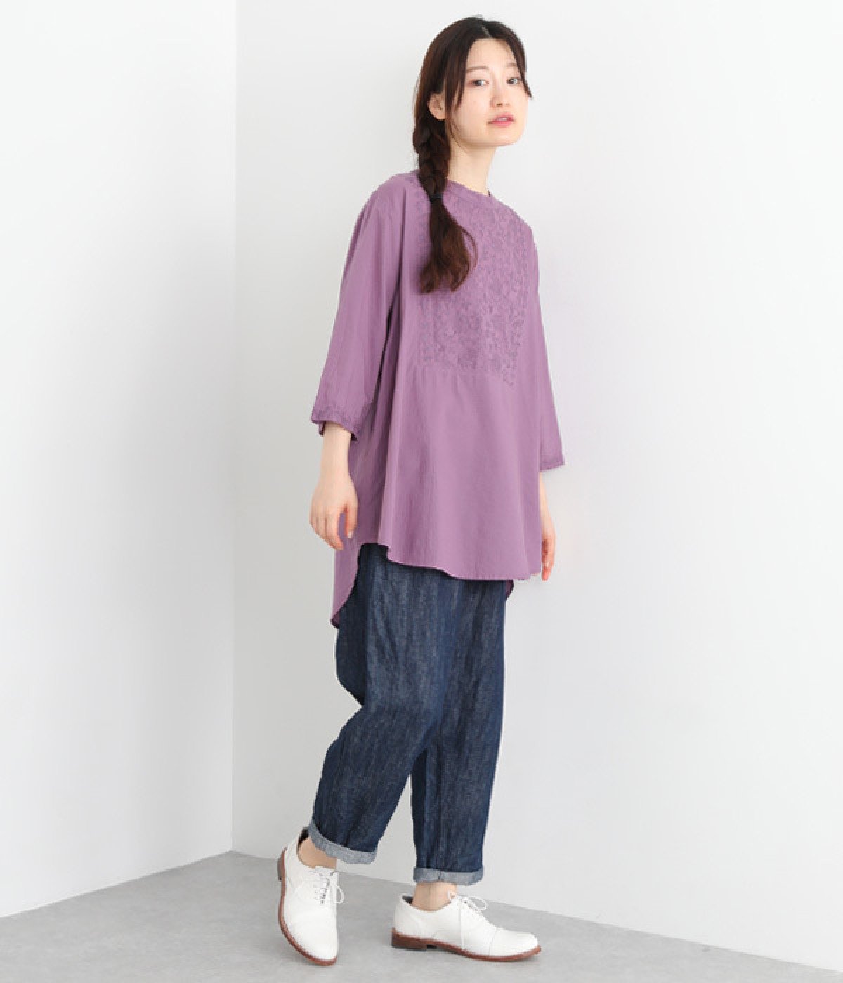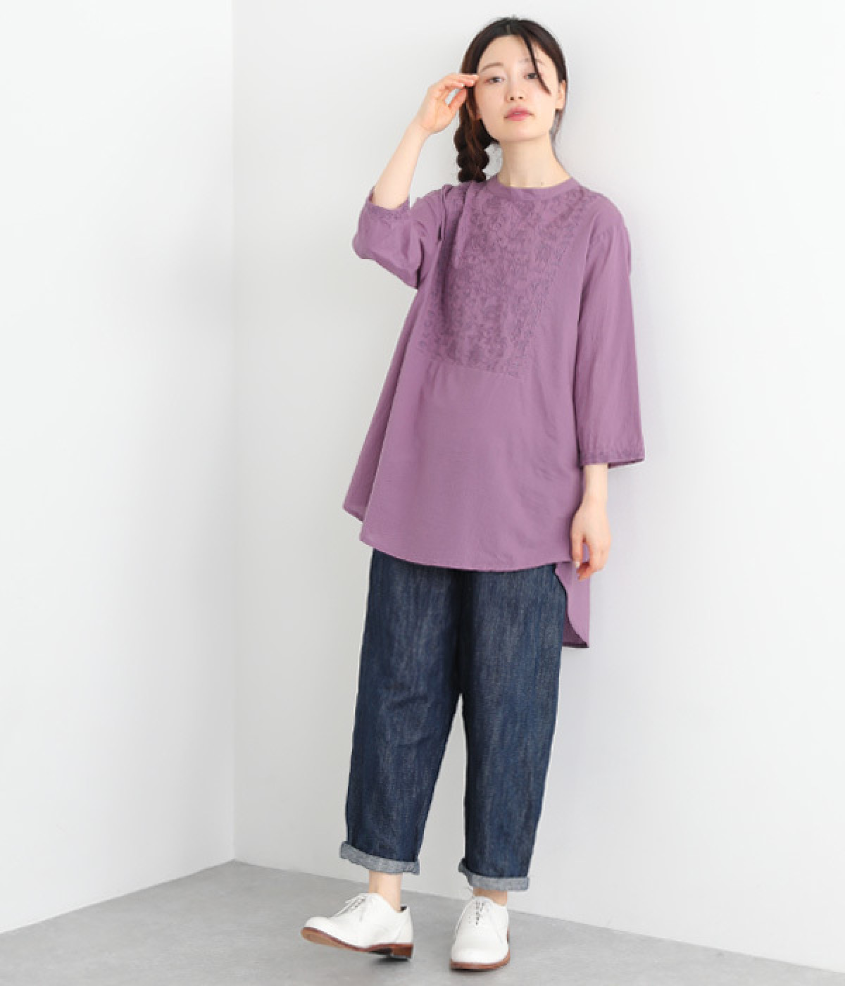 やわらかな肌ざわりのインドコットンで仕立てたブラウス。胸元と袖口には、ロータスの花をモチーフにしたカギ針刺しゅうがほどこされ、職人の繊細な手仕事に目を奪われます。手先をすっきり美しく見せるやや長めの袖は、日よけや温度差対策にも大活躍。腰まわりをカバーするチュニック丈をベースに、後ろの裾をぐっと長くして、風になびくように軽やかなシルエットに仕上げました。アクセサリーなしでも華やぎのある一枚です。