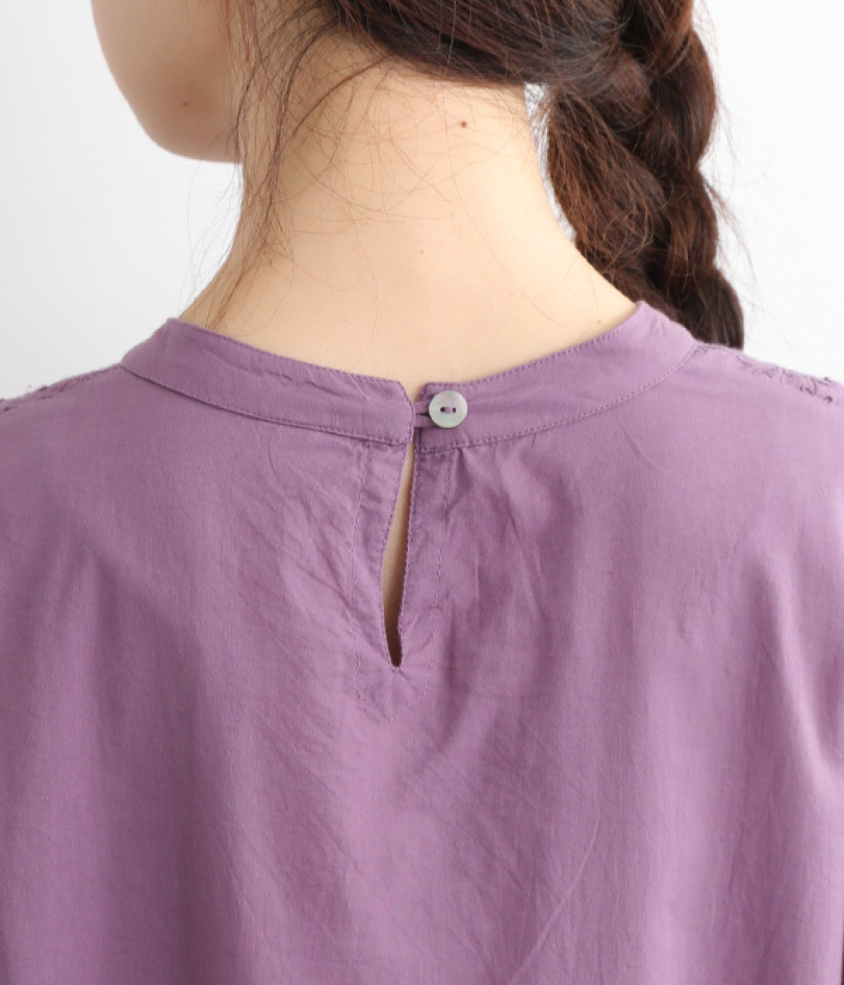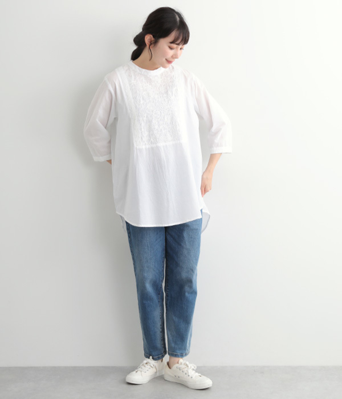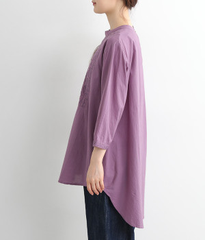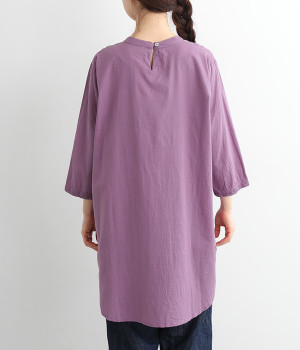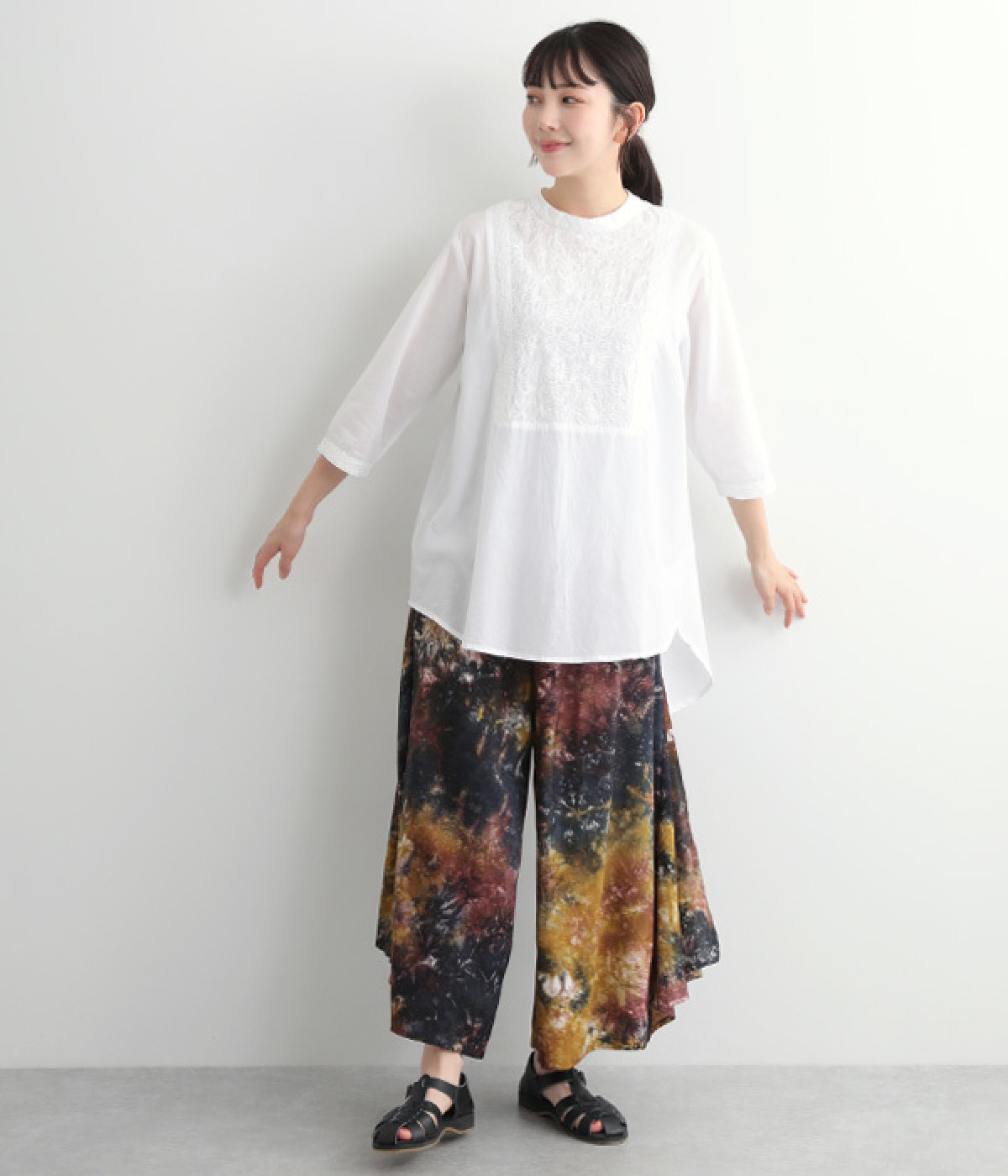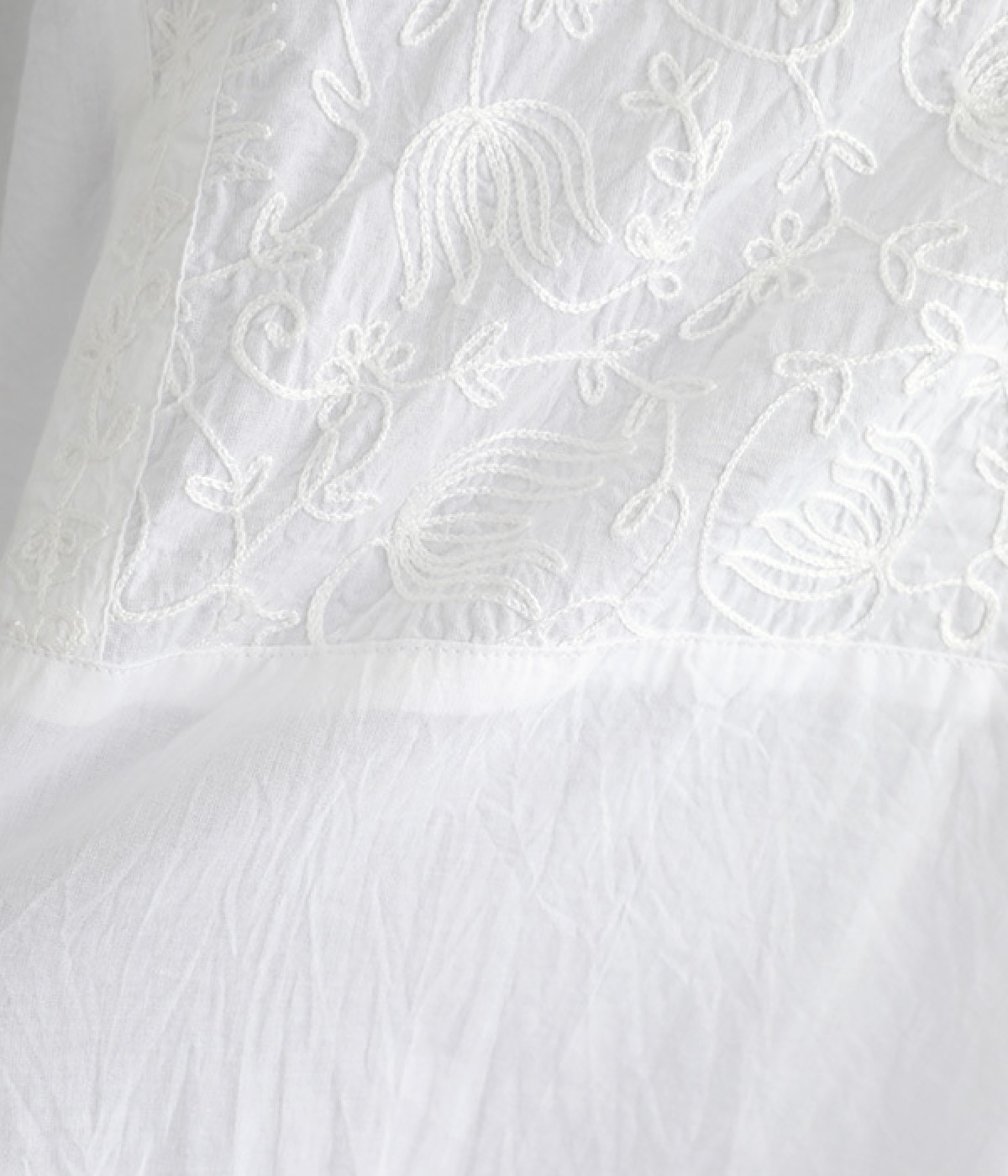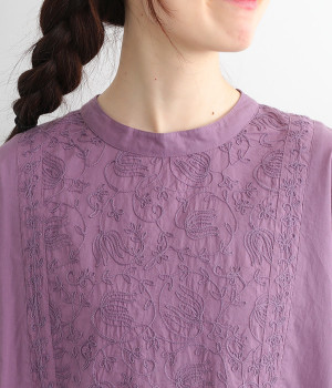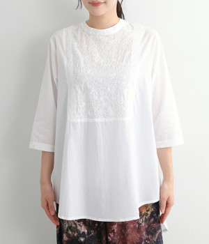 やわらかな肌ざわりのインドコットンで仕立てたブラウス。胸元と袖口には、ロータスの花をモチーフにしたカギ針刺しゅうがほどこされ、職人の繊細な手仕事に目を奪われます。手先をすっきり美しく見せるやや長めの袖は、日よけや温度差対策にも大活躍。腰まわりをカバーするチュニック丈をベースに、後ろの裾をぐっと長くして、風になびくように軽やかなシルエットに仕上げました。アクセサリーなしでも華やぎのある一枚です。