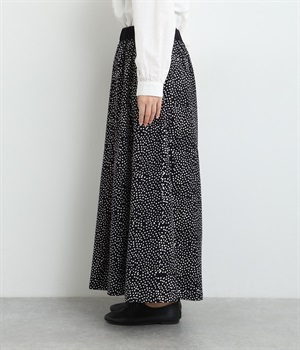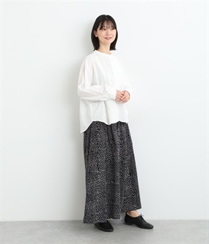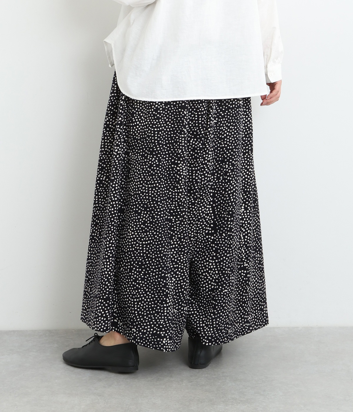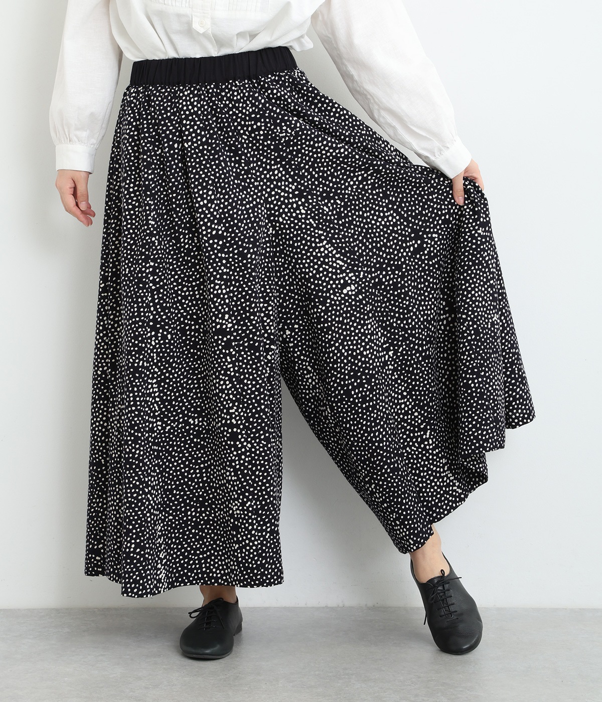 たっぷりとしたワイドシルエットが大人っぽいパンツ。動くたびにやわらかく揺れてエレガントな印象を与えてくれます。ウエスト部分は無地で切り替えアクセントに。きれいめな雰囲気ながらも、ウエスト総ゴムのイージータイプで、はき心地抜群。