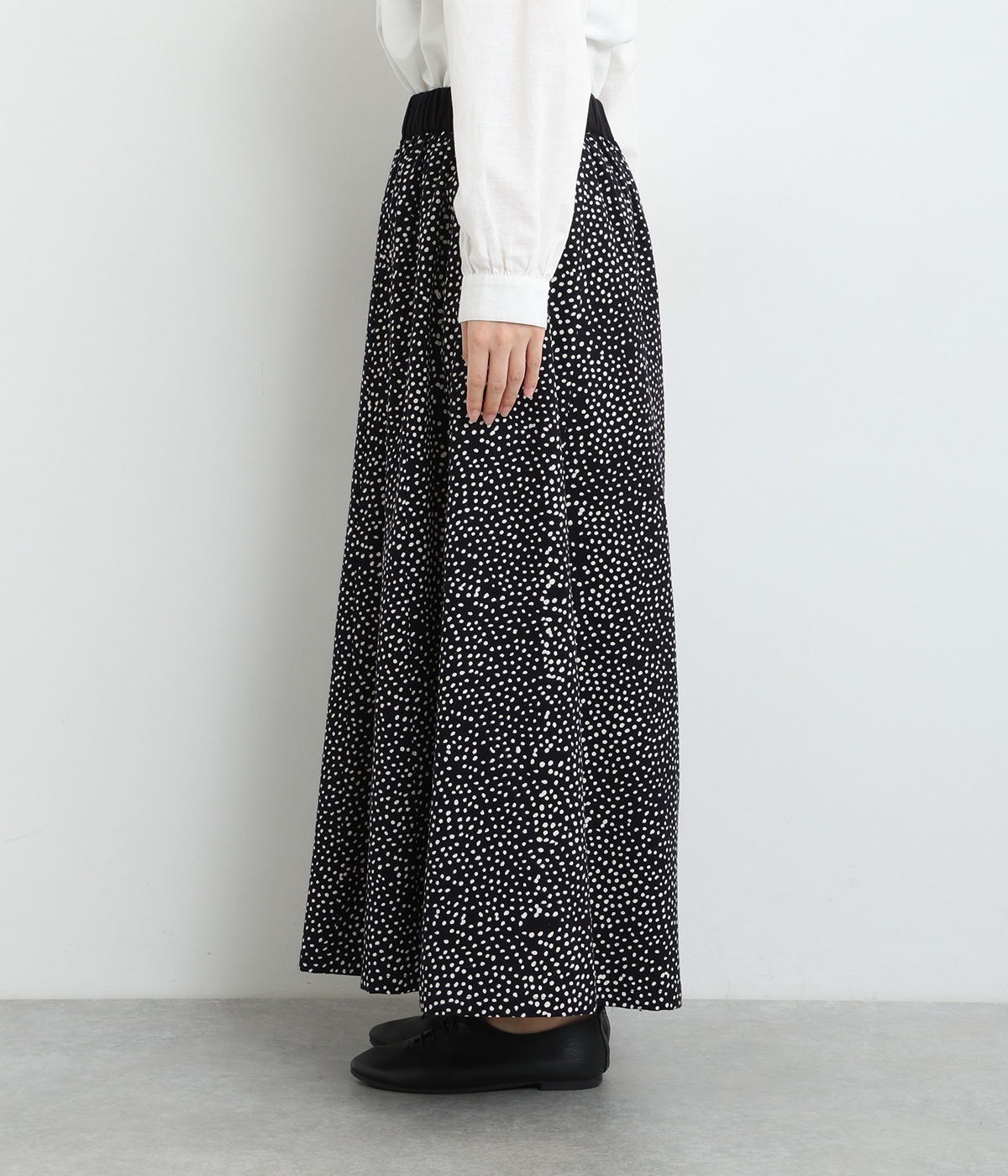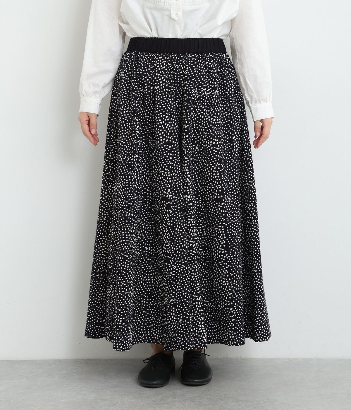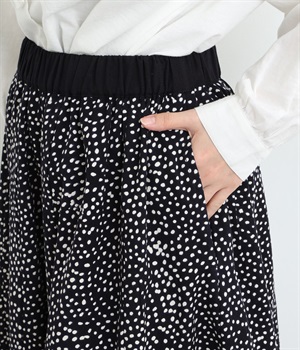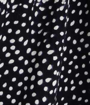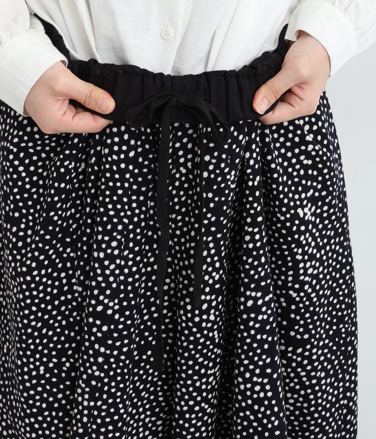肌なじみのいいやわらかなコットンに、手書き風のランダムドットをプリント。ひざ上部分にはコットン素材の裏地付きで、肌触りにも配慮しています。