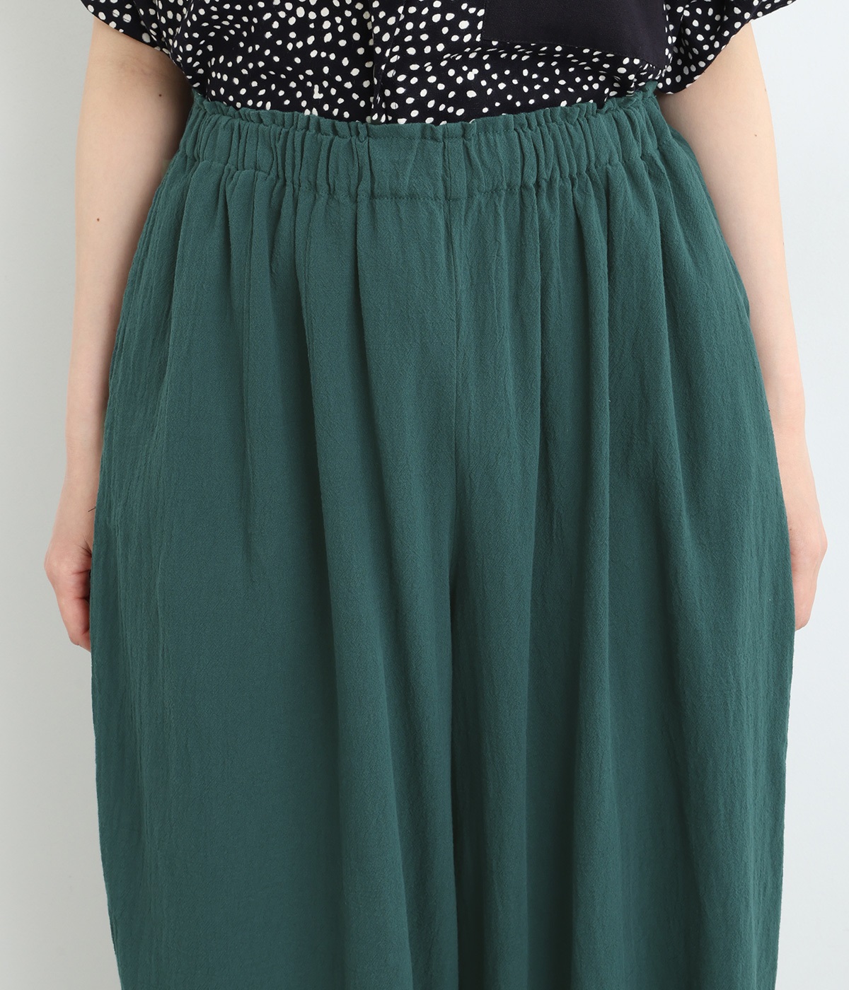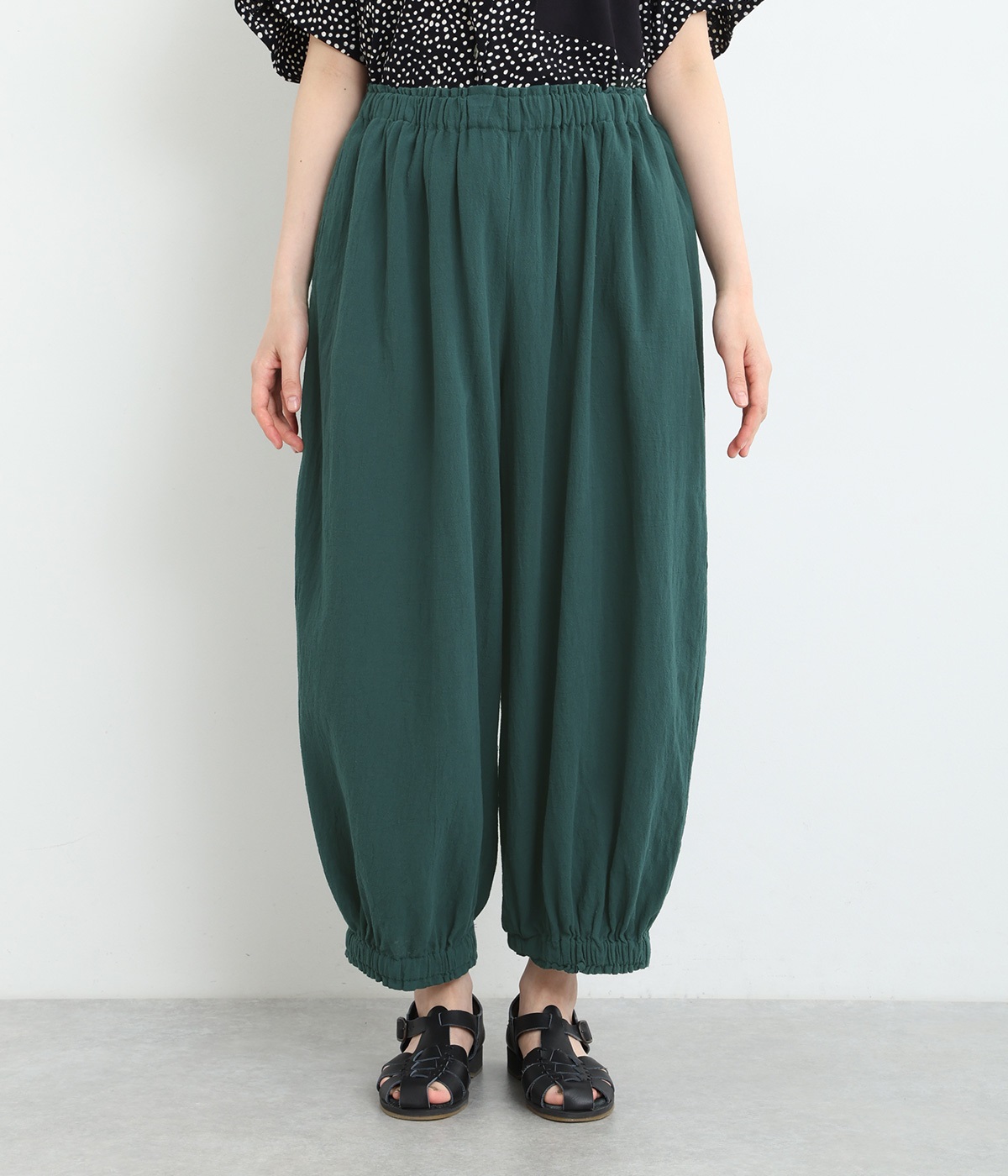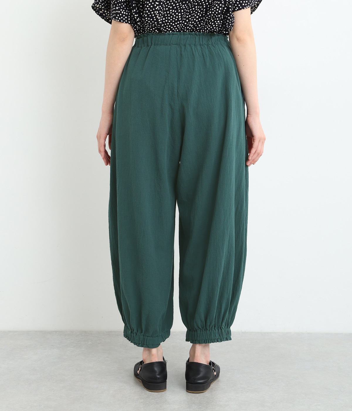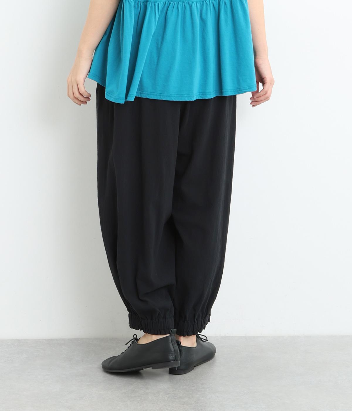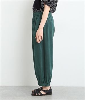 裾にゴムを入れて、ふんわりとしたシルエットに仕上げたパンツです。ウエストゴムの幅が広いためお腹まわりが膨らみにくく、心地よさとすっきりとした印象を両立。ワンピースのインナーパンツにもおすすめです。