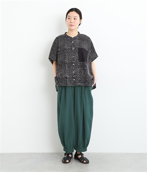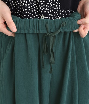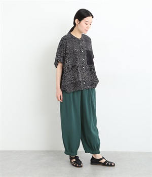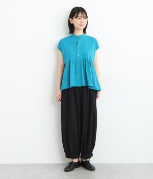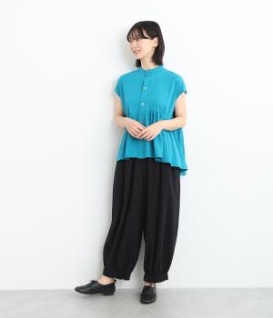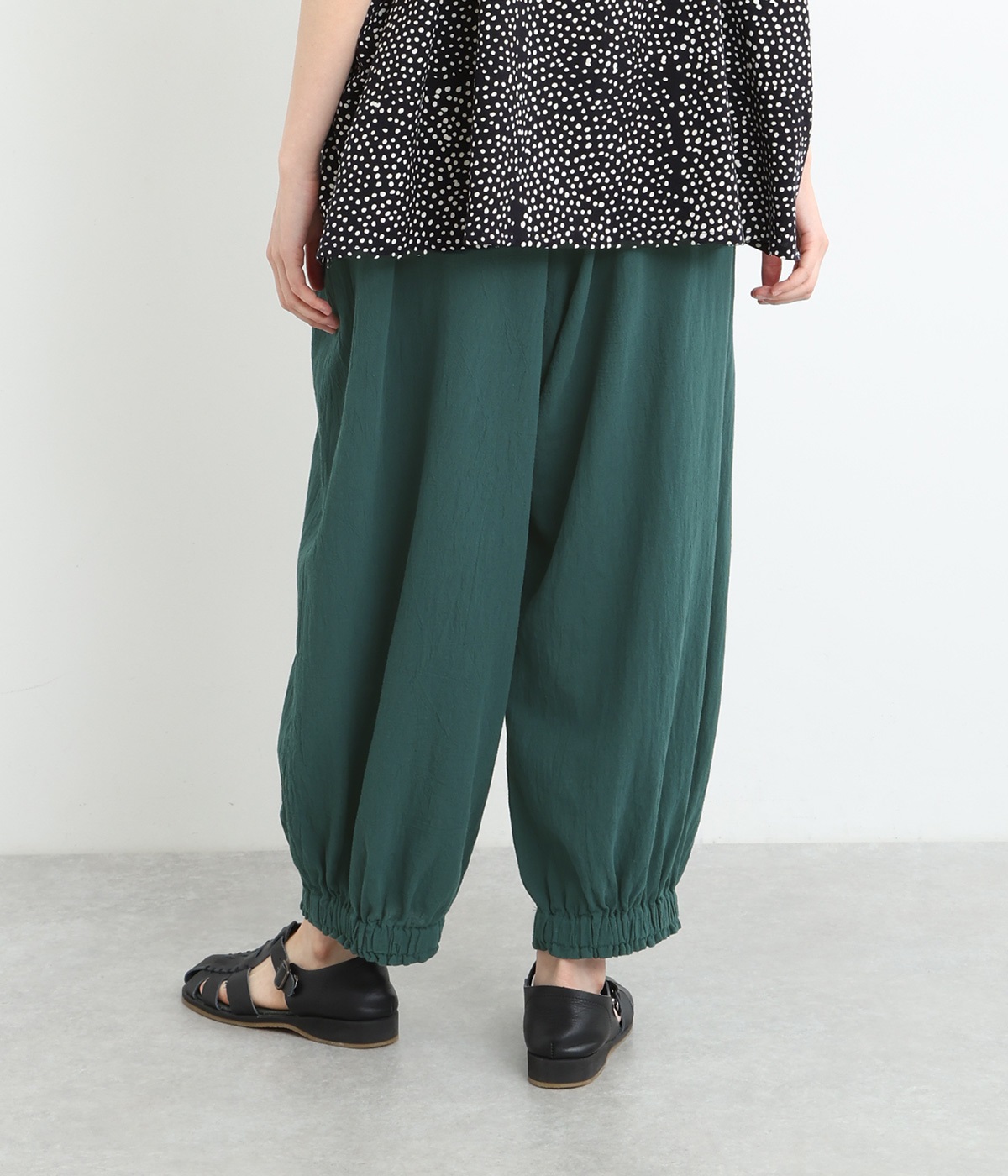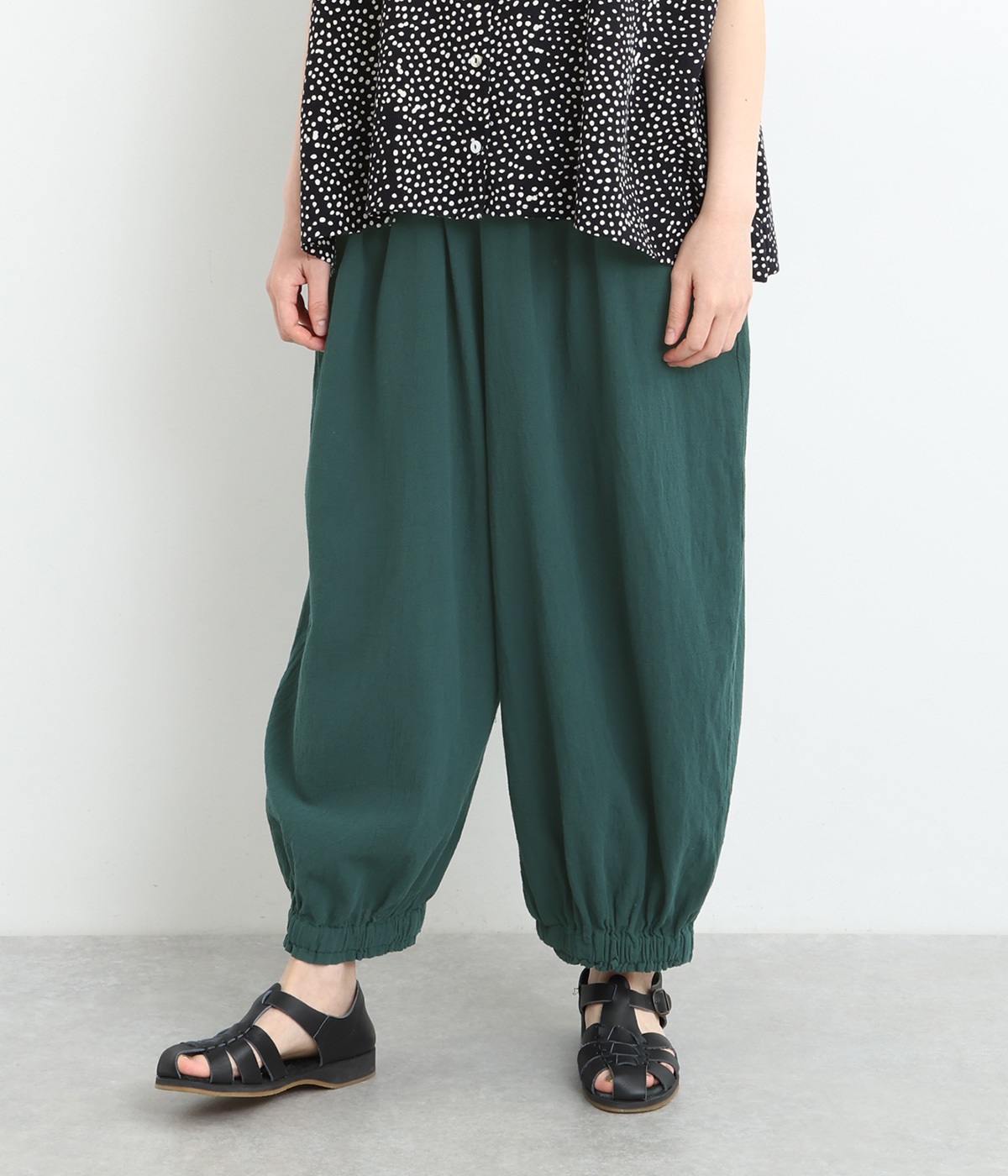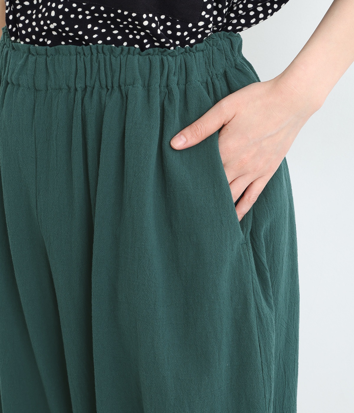 裾にゴムを入れて、ふんわりとしたシルエットに仕上げたパンツです。ウエストゴムの幅が広いためお腹まわりが膨らみにくく、心地よさとすっきりとした印象を両立。ワンピースのインナーパンツにもおすすめです。