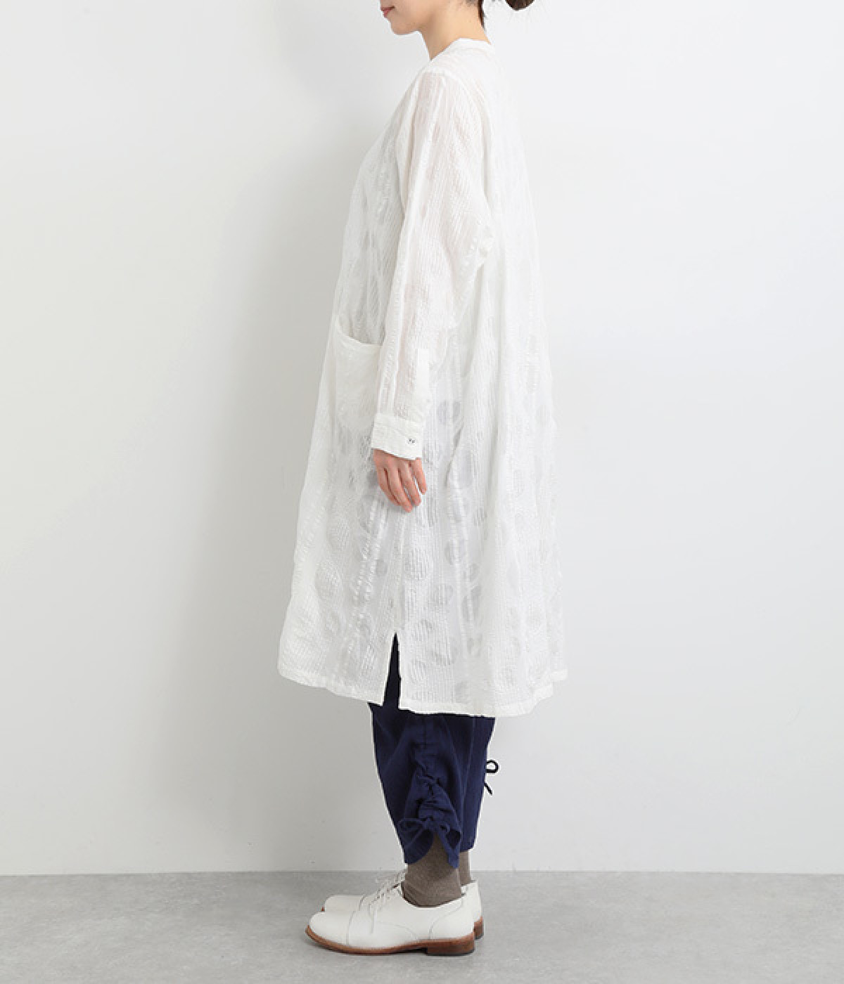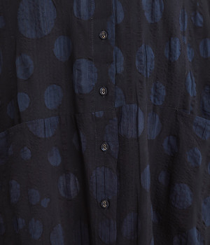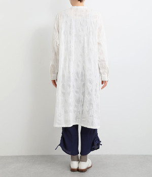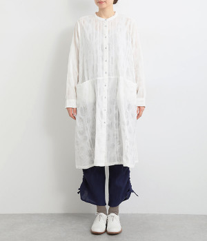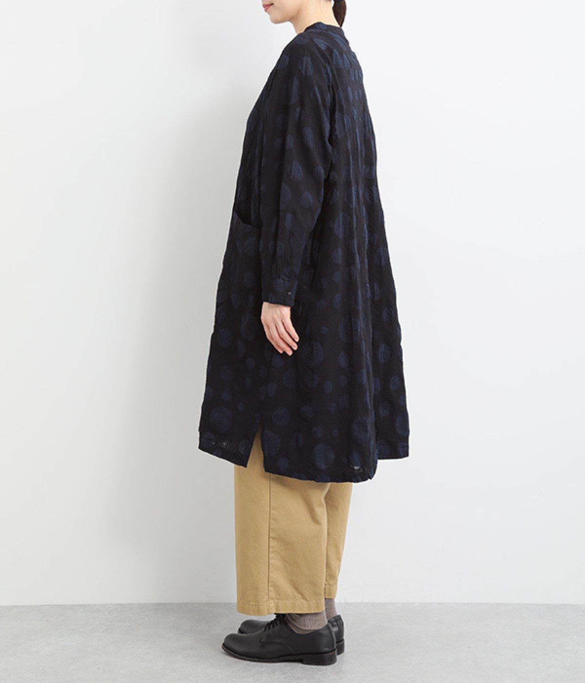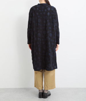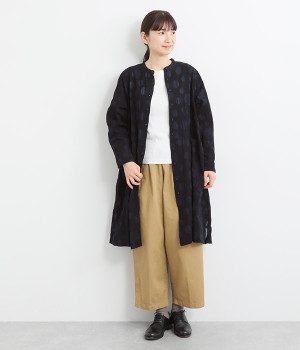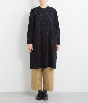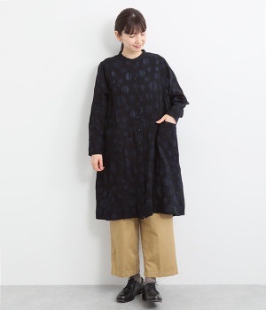 共布のクルミボタンがアクセントになったシンプルなデザインで、個性的な生地の魅力を引き立てます。前あき仕様で羽織りとしても活躍。ウエストの切り替え部分にシームポケットをあしらい、実用性も兼ね備えています。