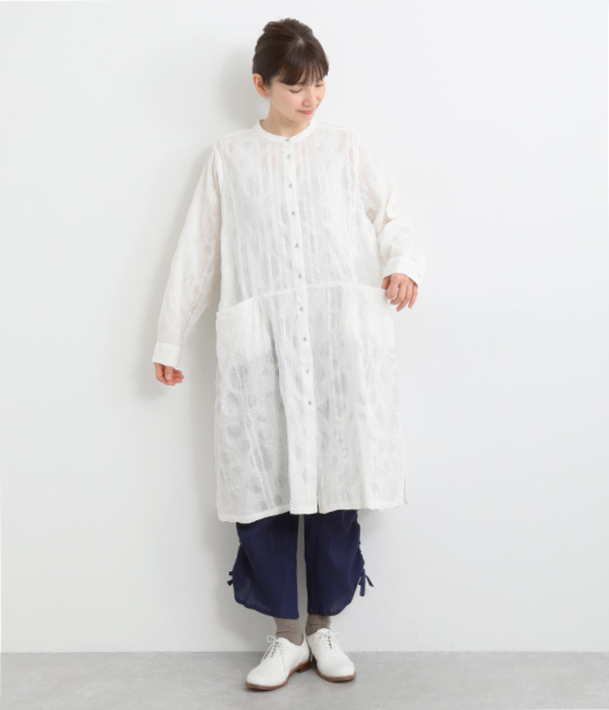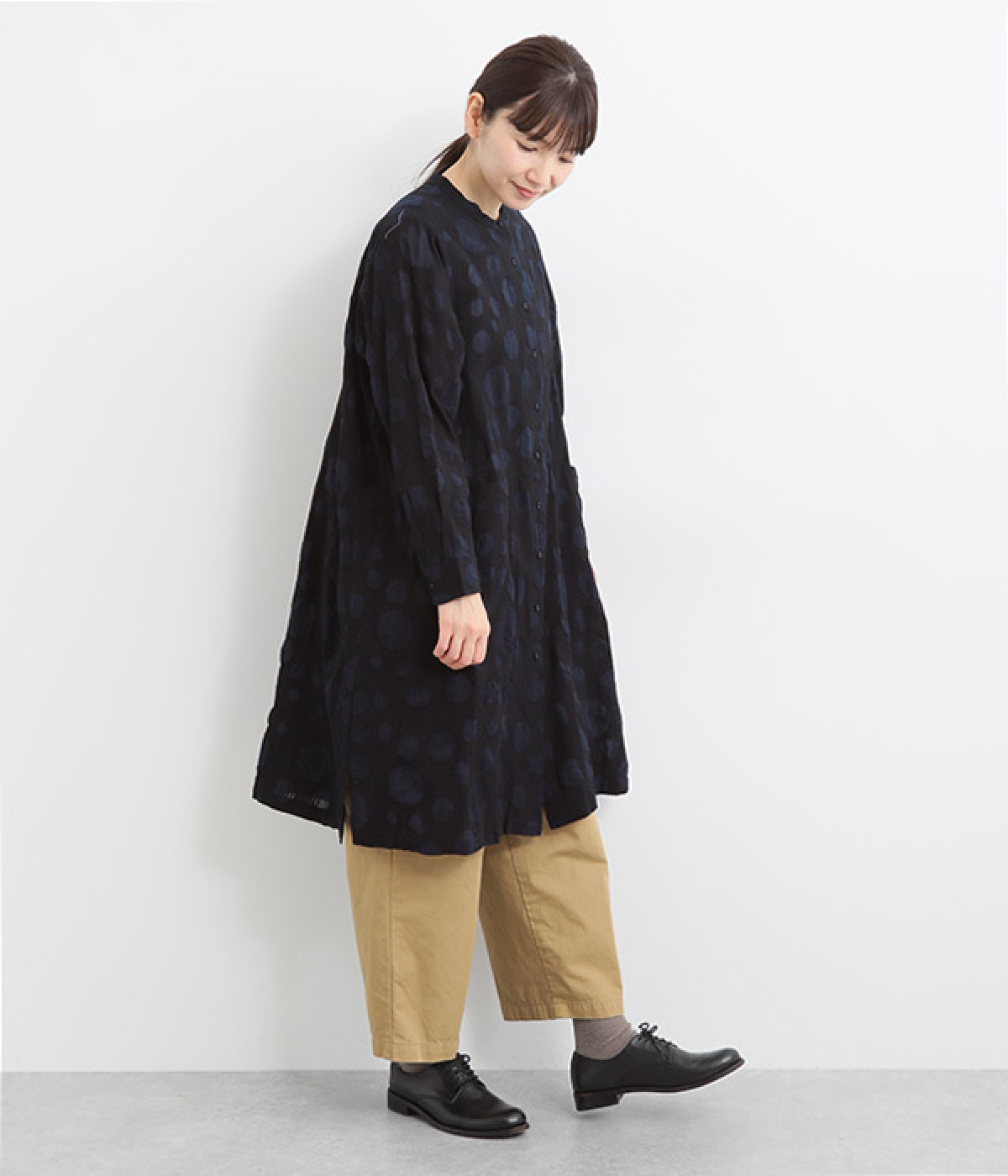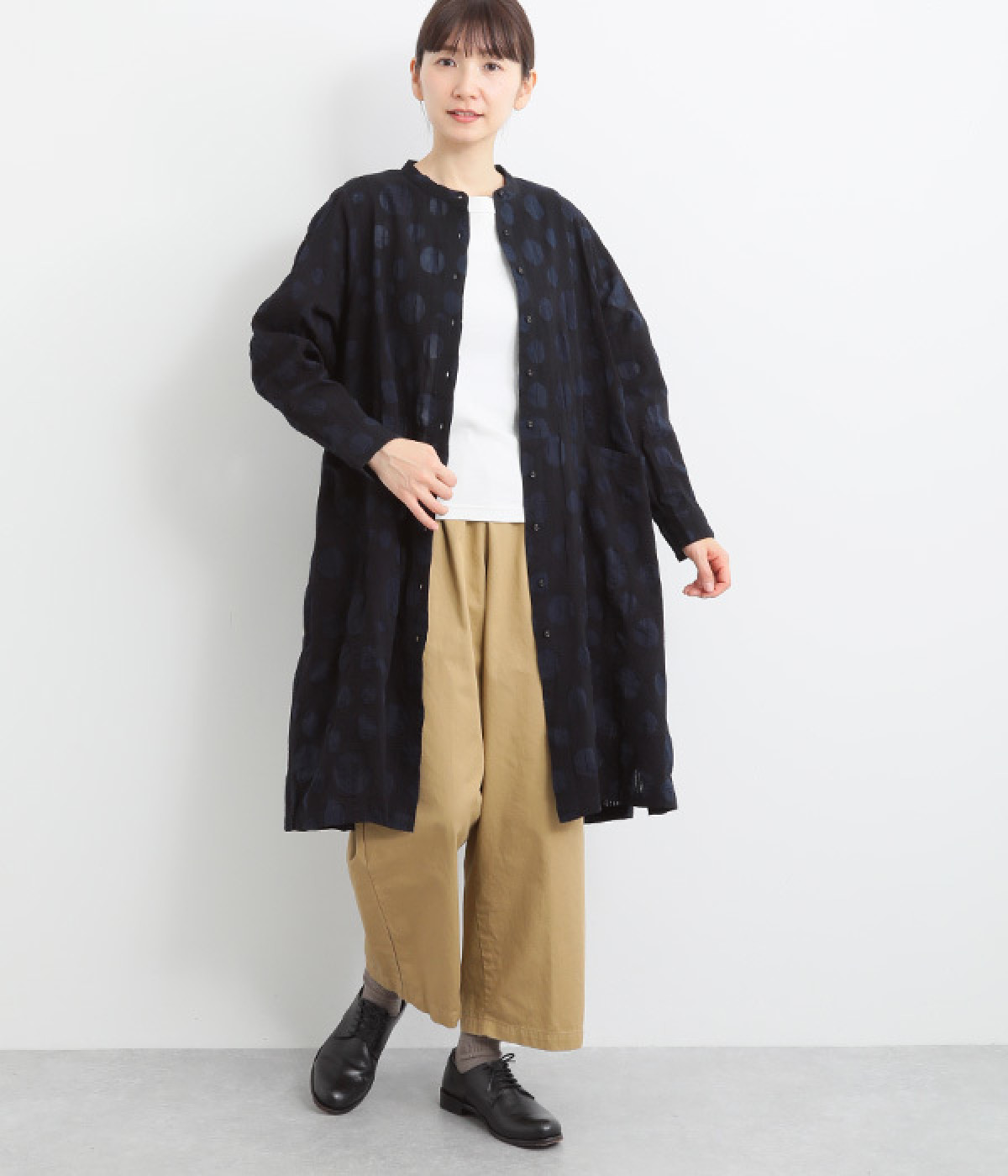 共布のクルミボタンがアクセントになったシンプルなデザインで、個性的な生地の魅力を引き立てます。前あき仕様で羽織りとしても活躍。ウエストの切り替え部分にシームポケットをあしらい、実用性も兼ね備えています。