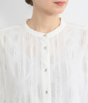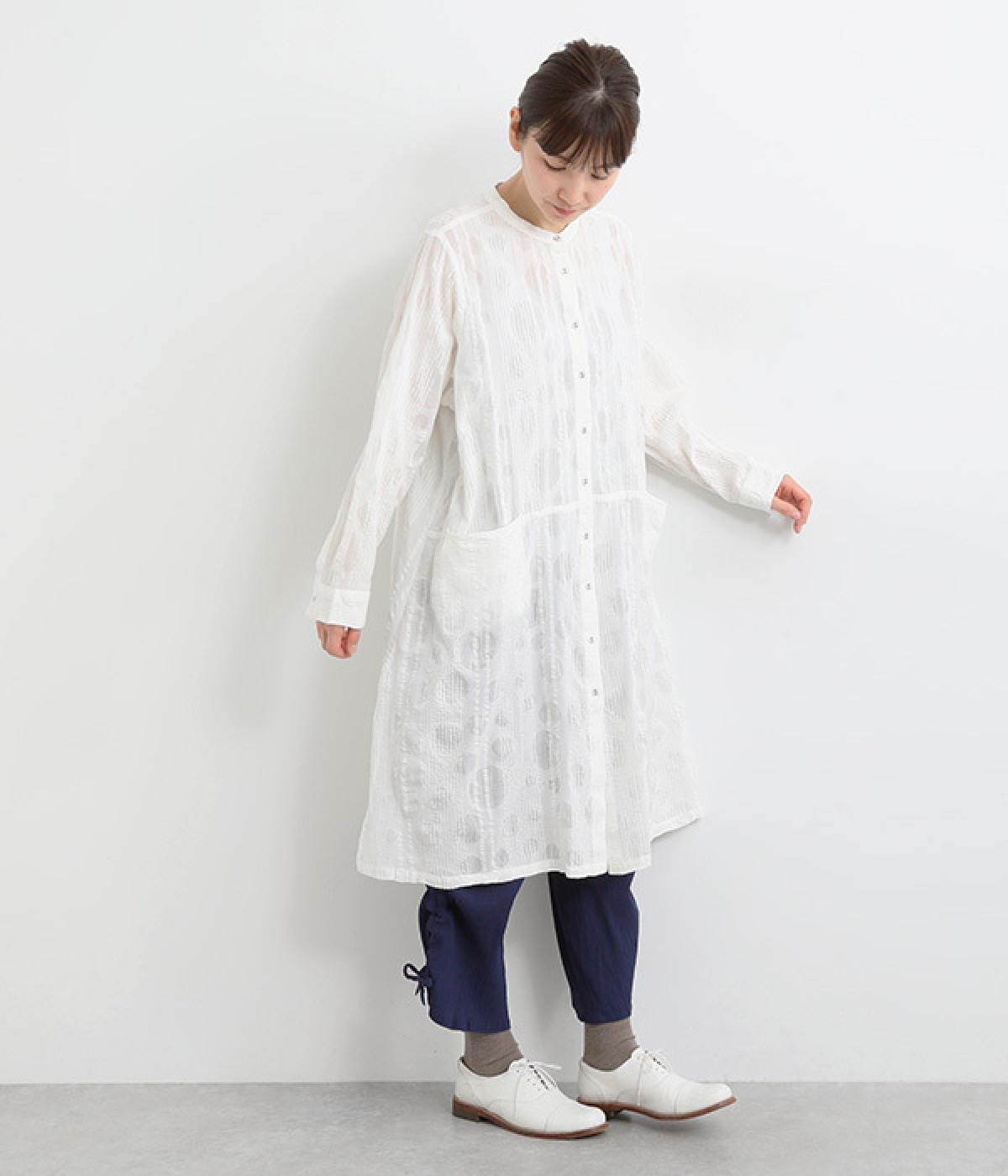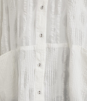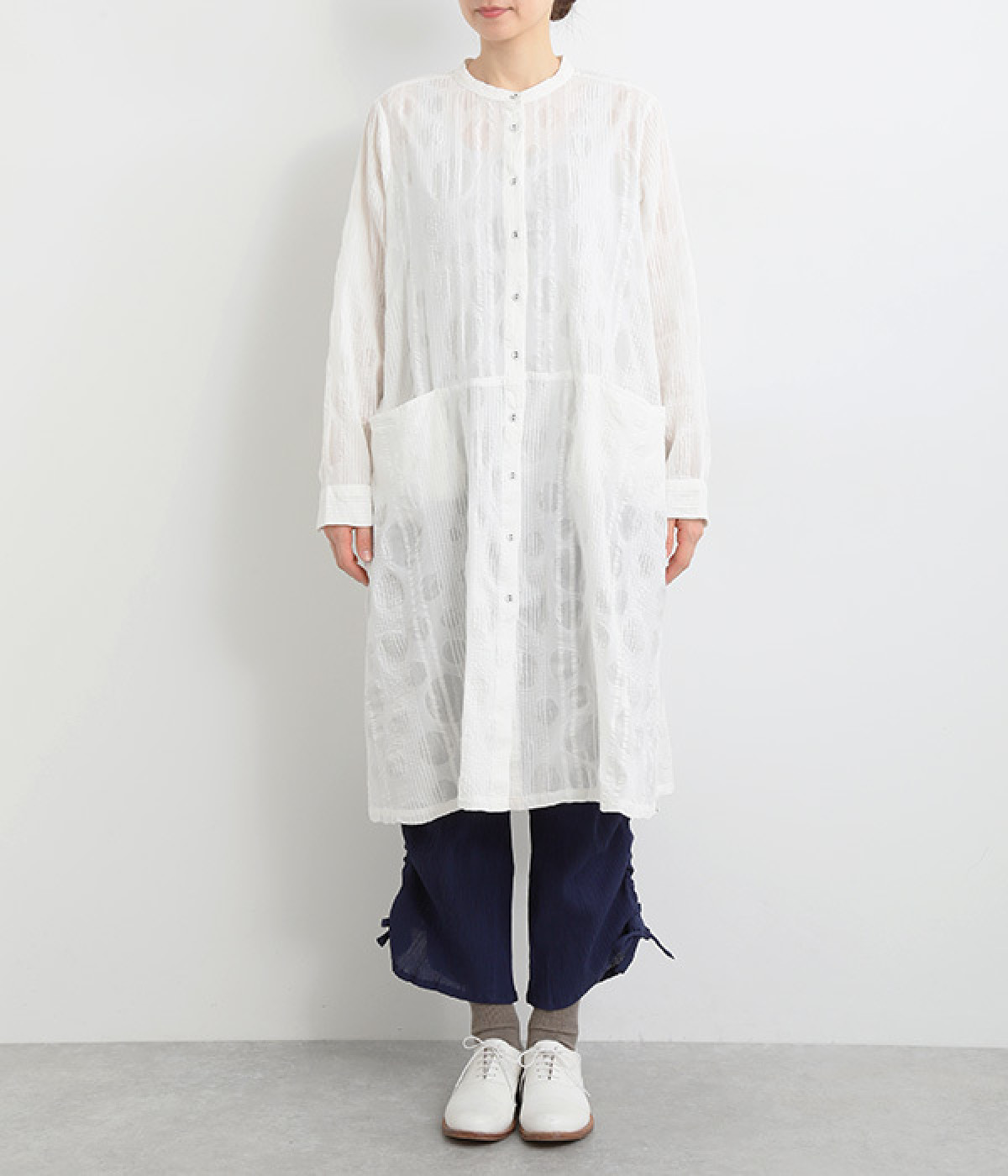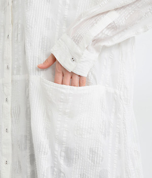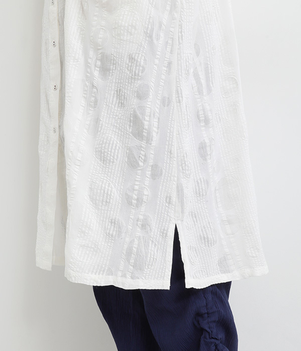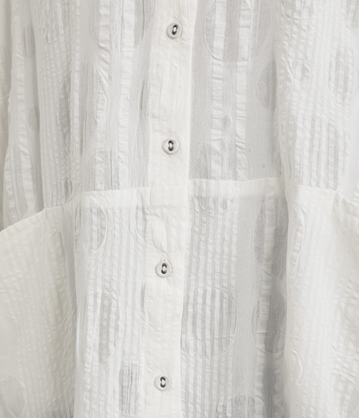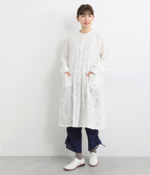 ストライプ織りのサッカー生地に、ドットのエンボス加工をほどこした表情豊かな素材で仕立てました。コットン特有の素朴でやわらかな風合いが、肌に心地よく馴染みます。
