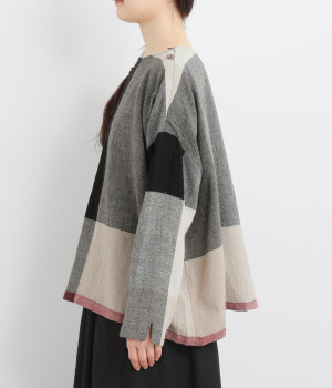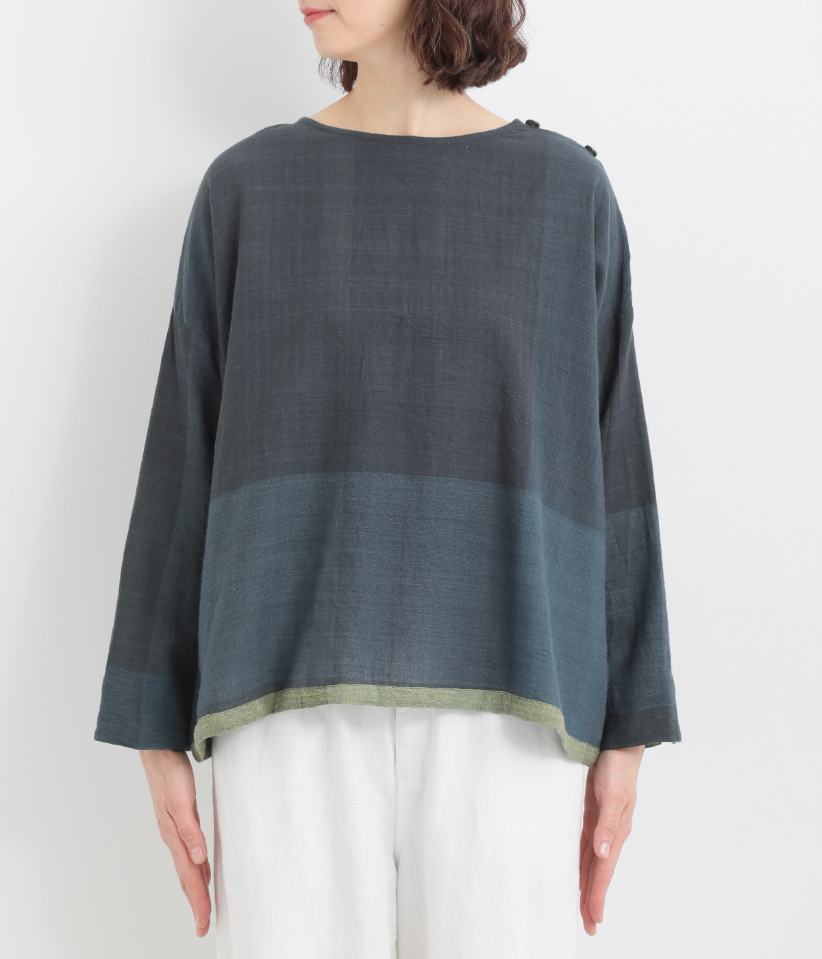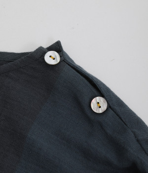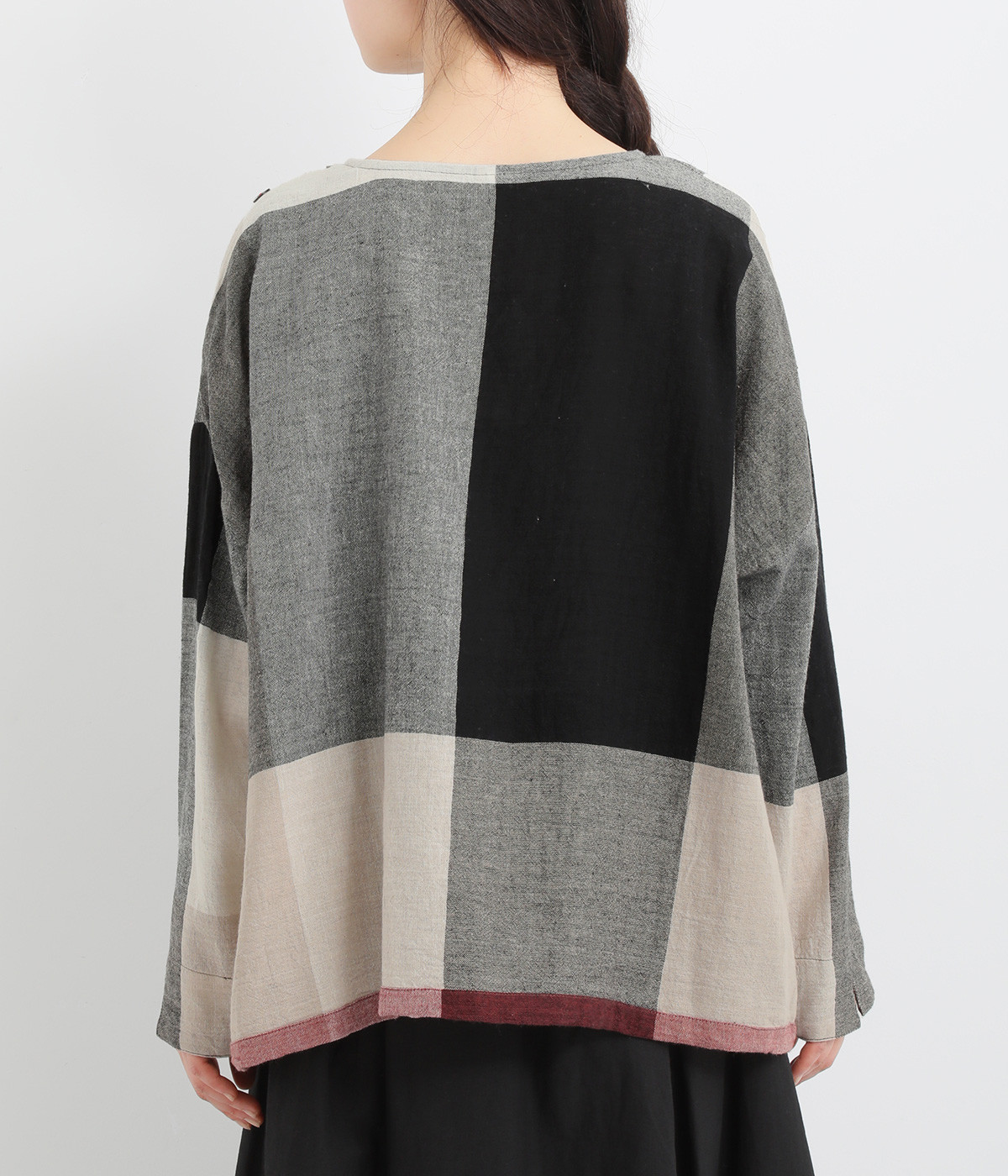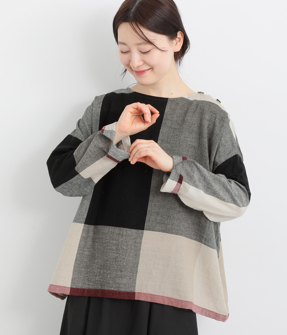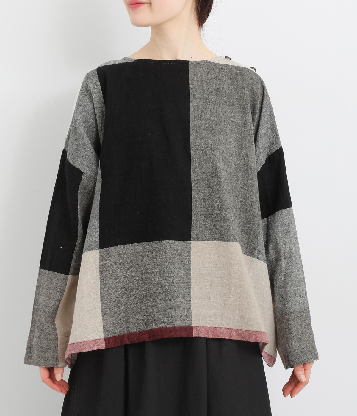 生地の持つ風合いやビッグチェック柄を活かしたゆとりのあるシンプルな仕立てです。裾の無地配色や肩のボタンあきでさり気なくデザイン性を追加。すっきりとしたクルーネックでバランスよく抜け感を作っています。
