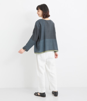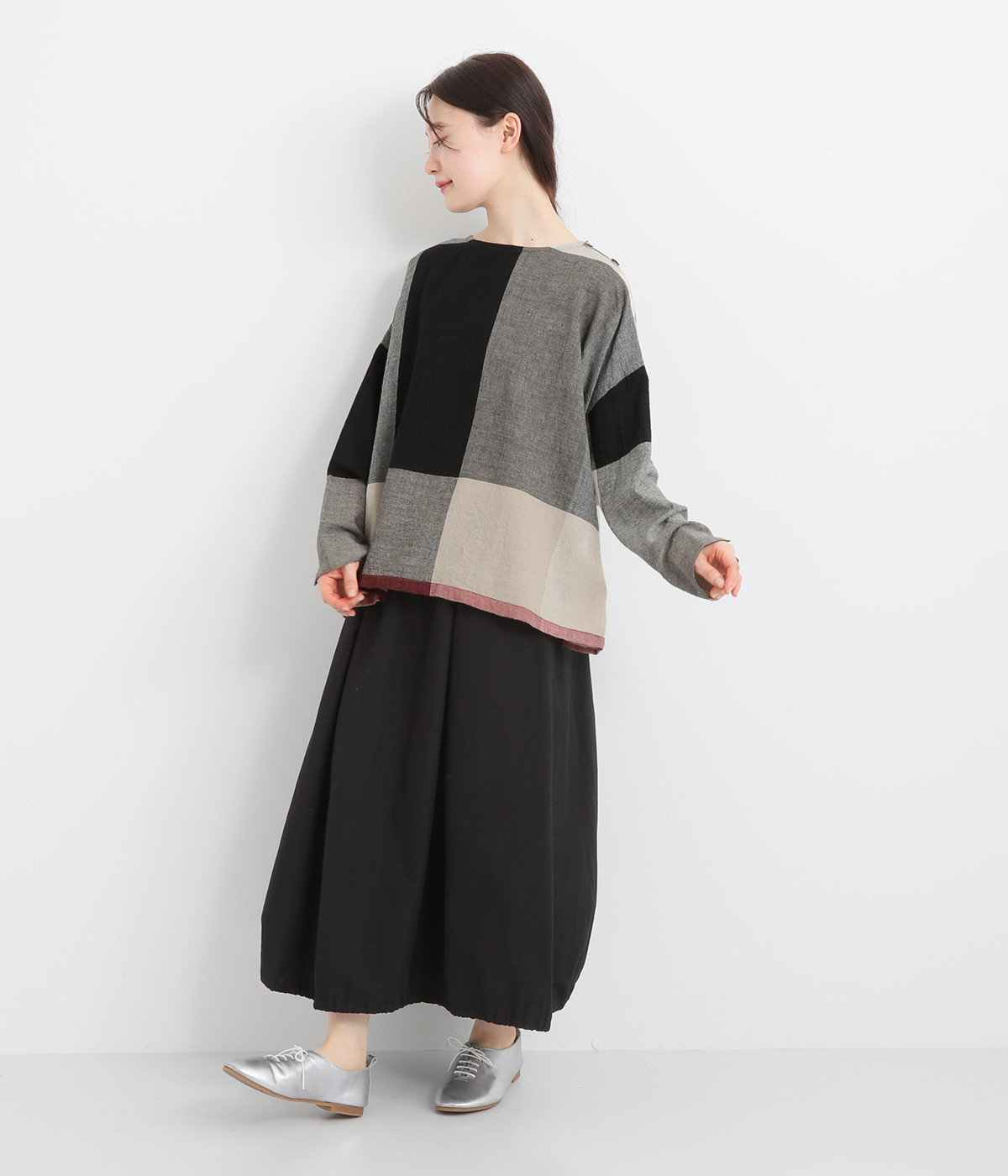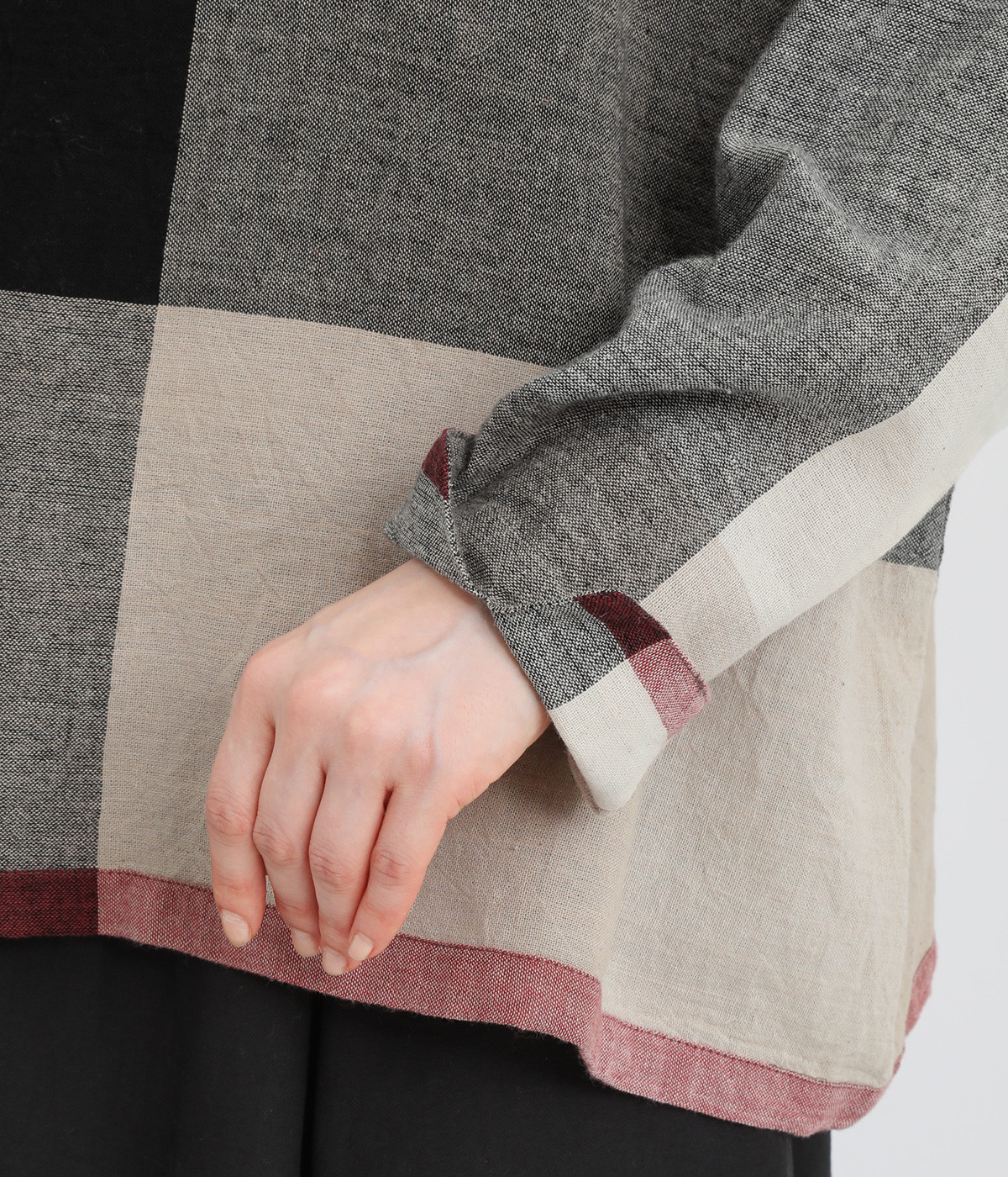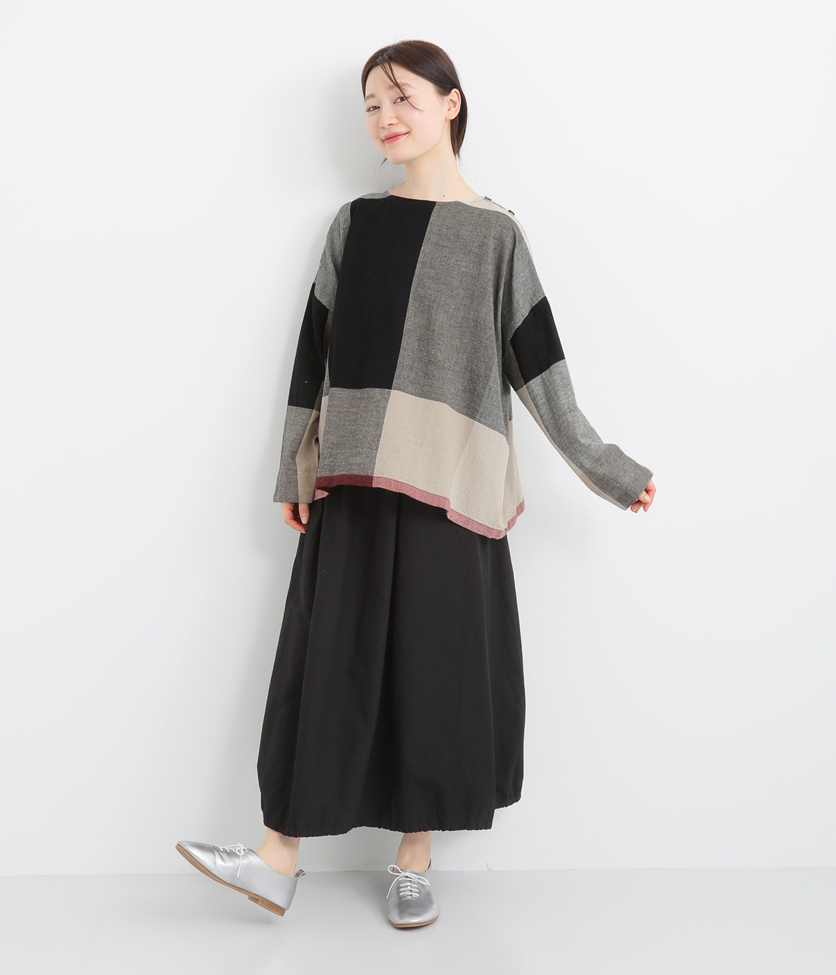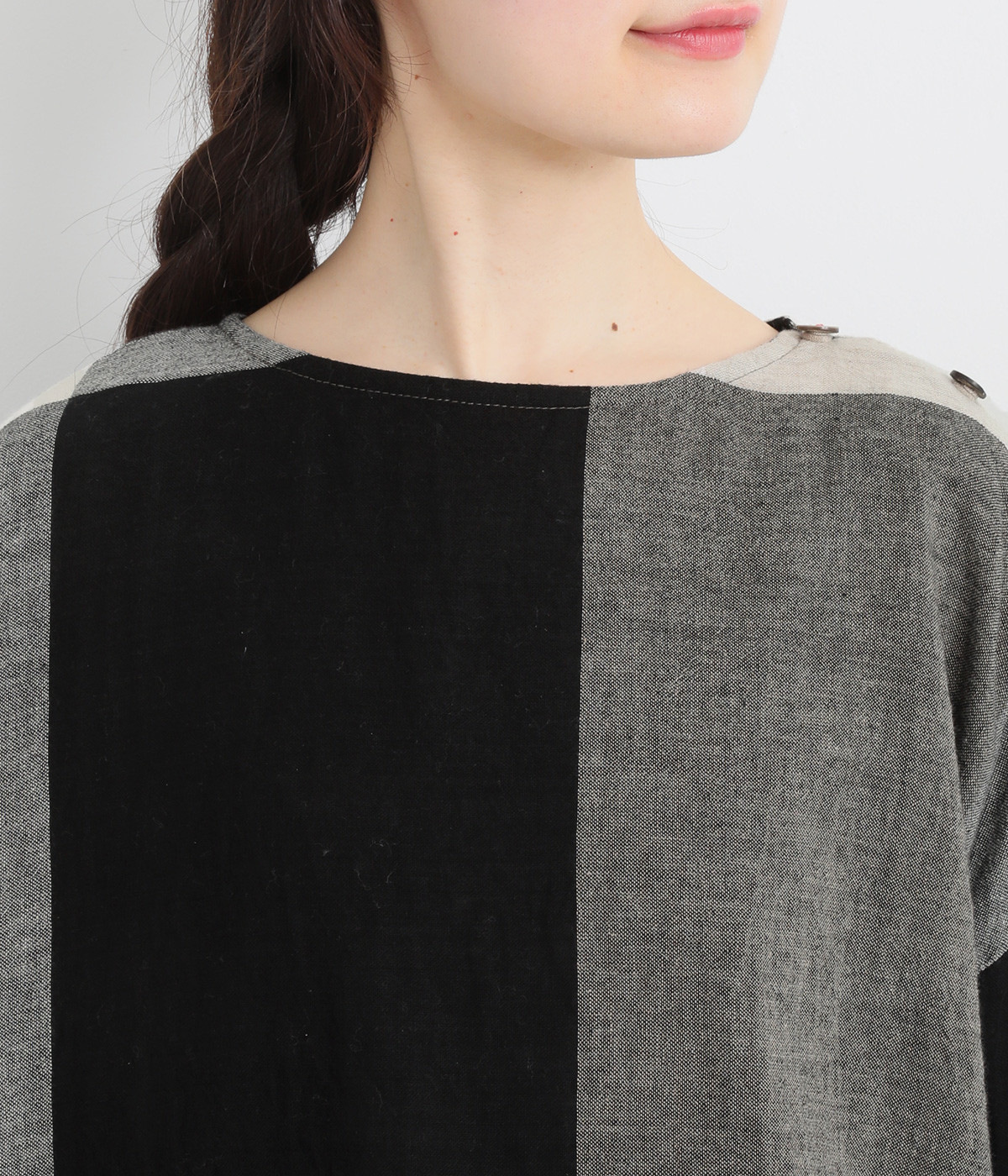 生地の持つ風合いやビッグチェック柄を活かしたゆとりのあるシンプルな仕立てです。裾の無地配色や肩のボタンあきでさり気なくデザイン性を追加。すっきりとしたクルーネックでバランスよく抜け感を作っています。