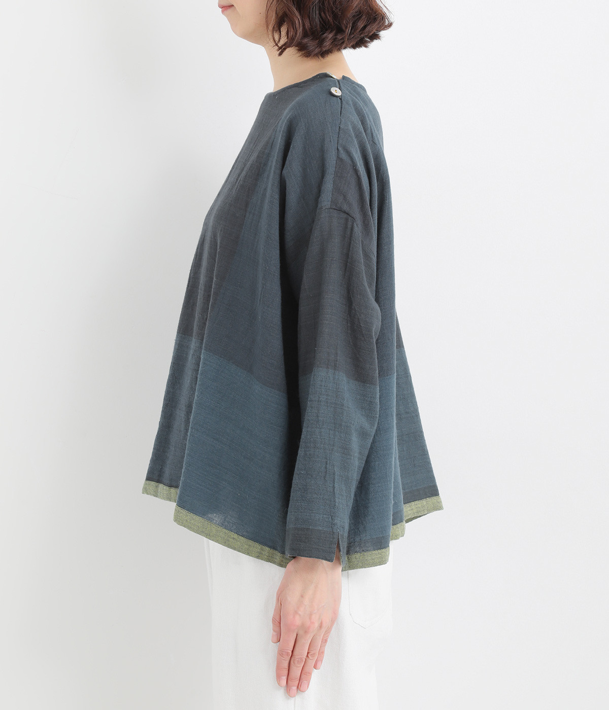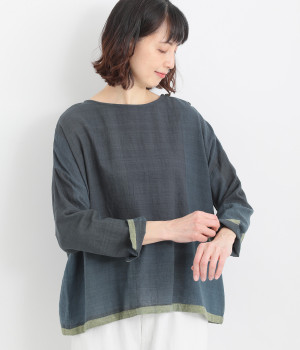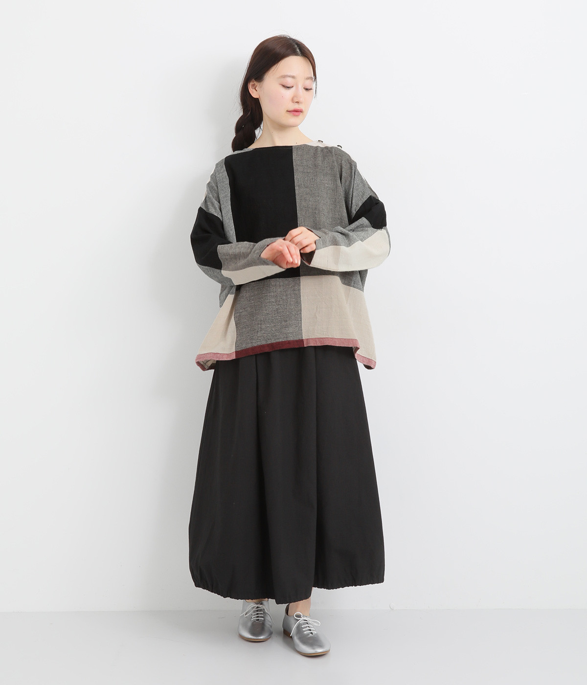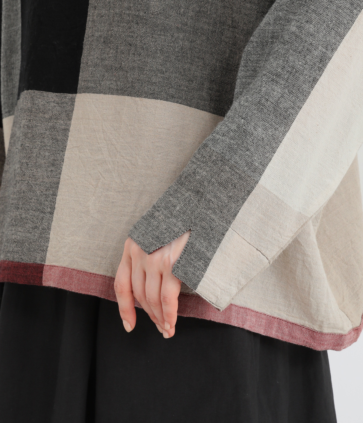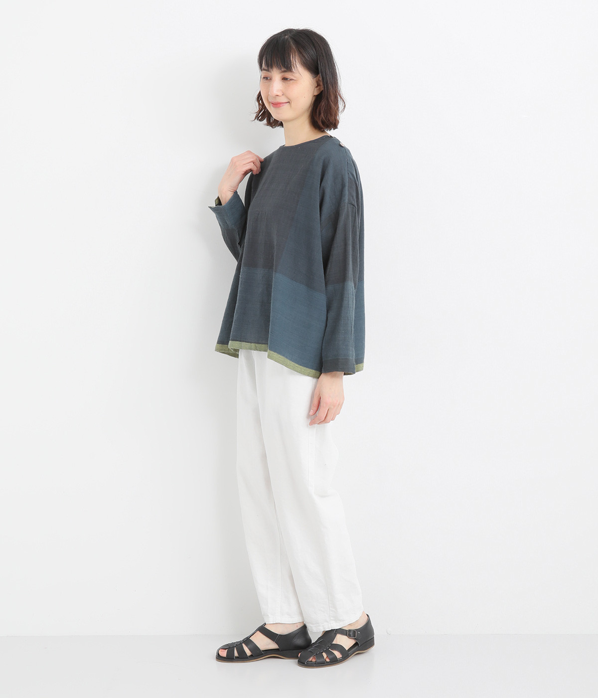 生地の持つ風合いやビッグチェック柄を活かしたゆとりのあるシンプルな仕立てです。裾の無地配色や肩のボタンあきでさり気なくデザイン性を追加。すっきりとしたクルーネックでバランスよく抜け感を作っています。