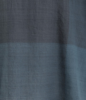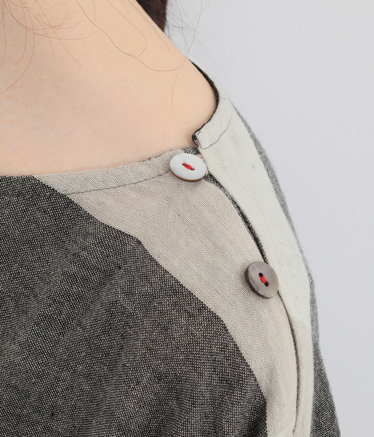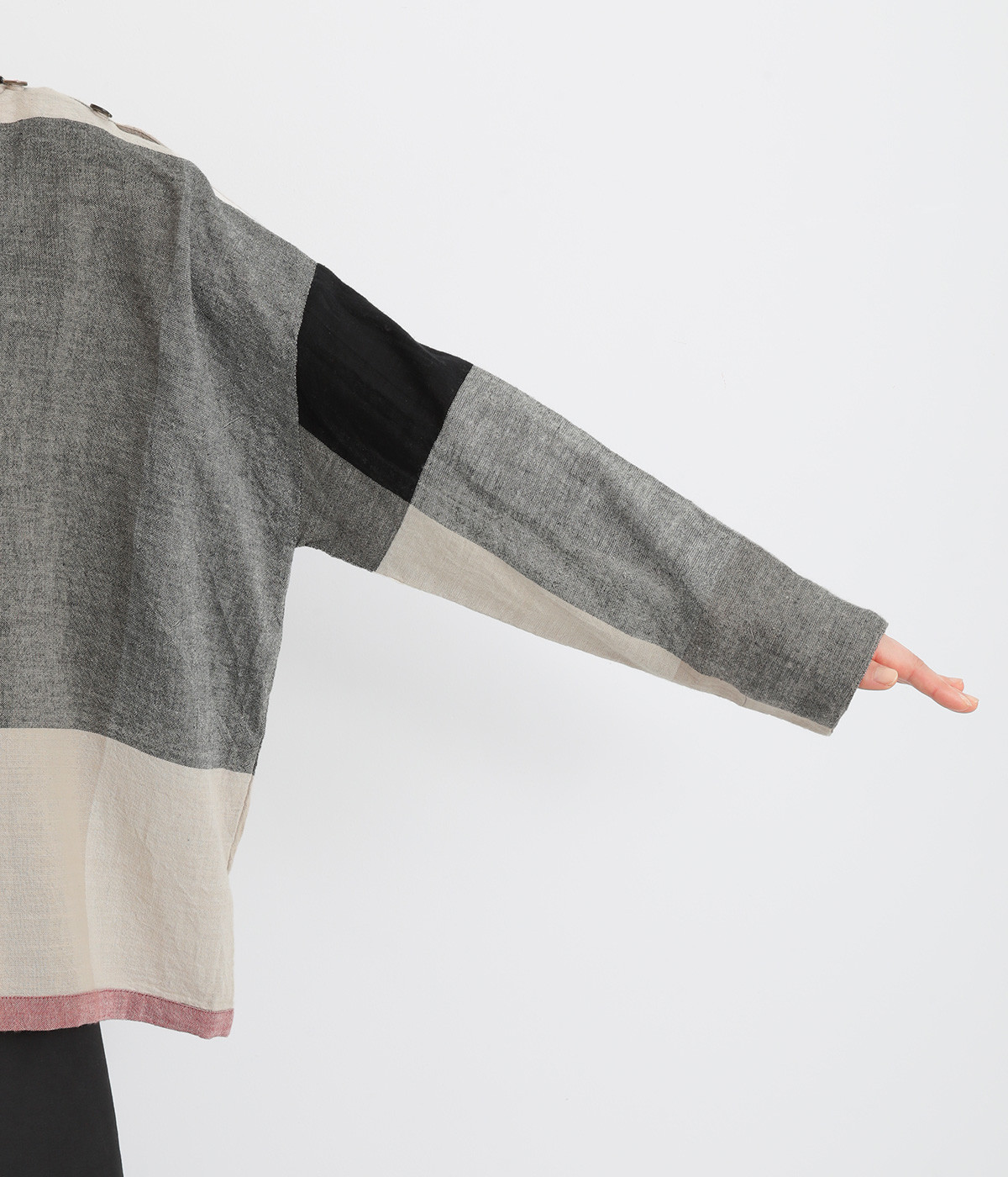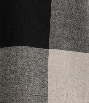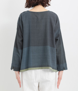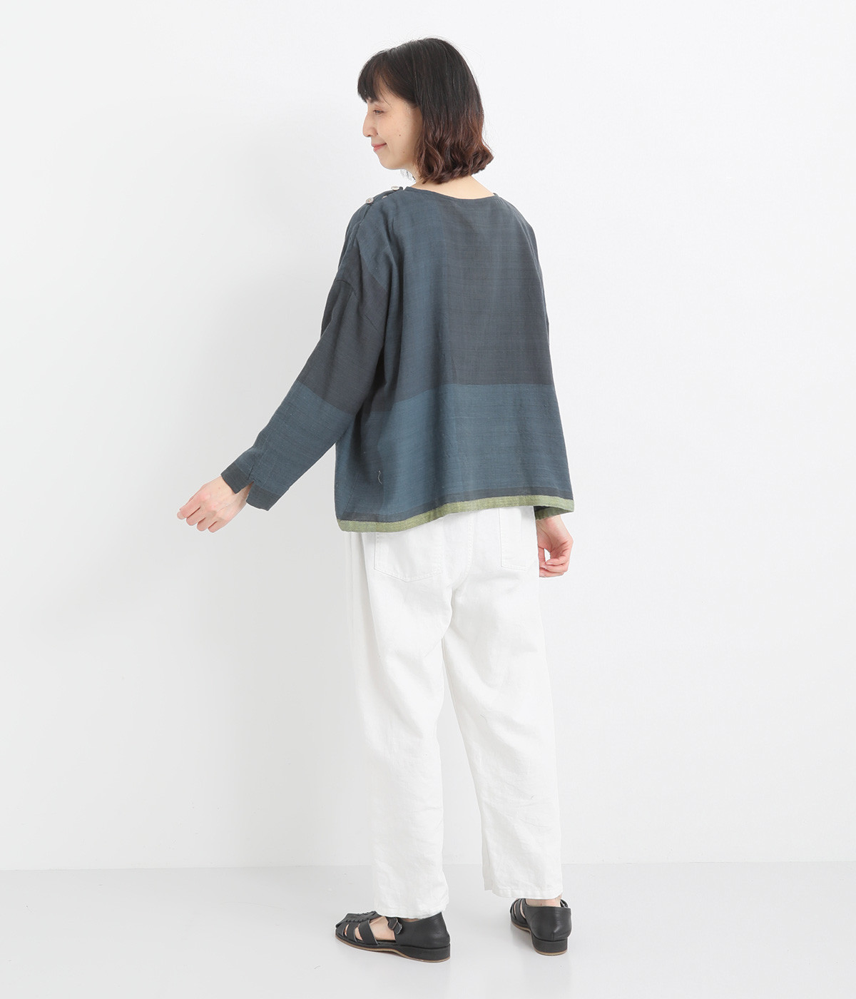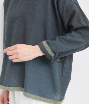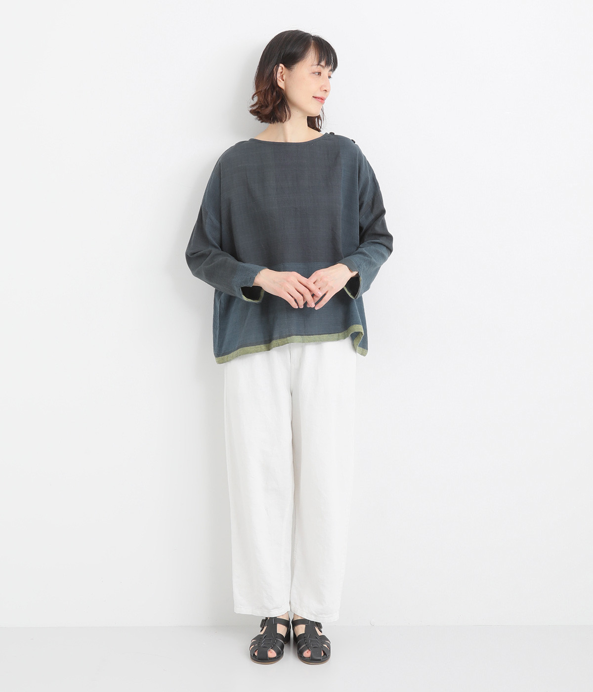 生地の持つ風合いやビッグチェック柄を活かしたゆとりのあるシンプルな仕立てです。裾の無地配色や肩のボタンあきでさり気なくデザイン性を追加。すっきりとしたクルーネックでバランスよく抜け感を作っています。