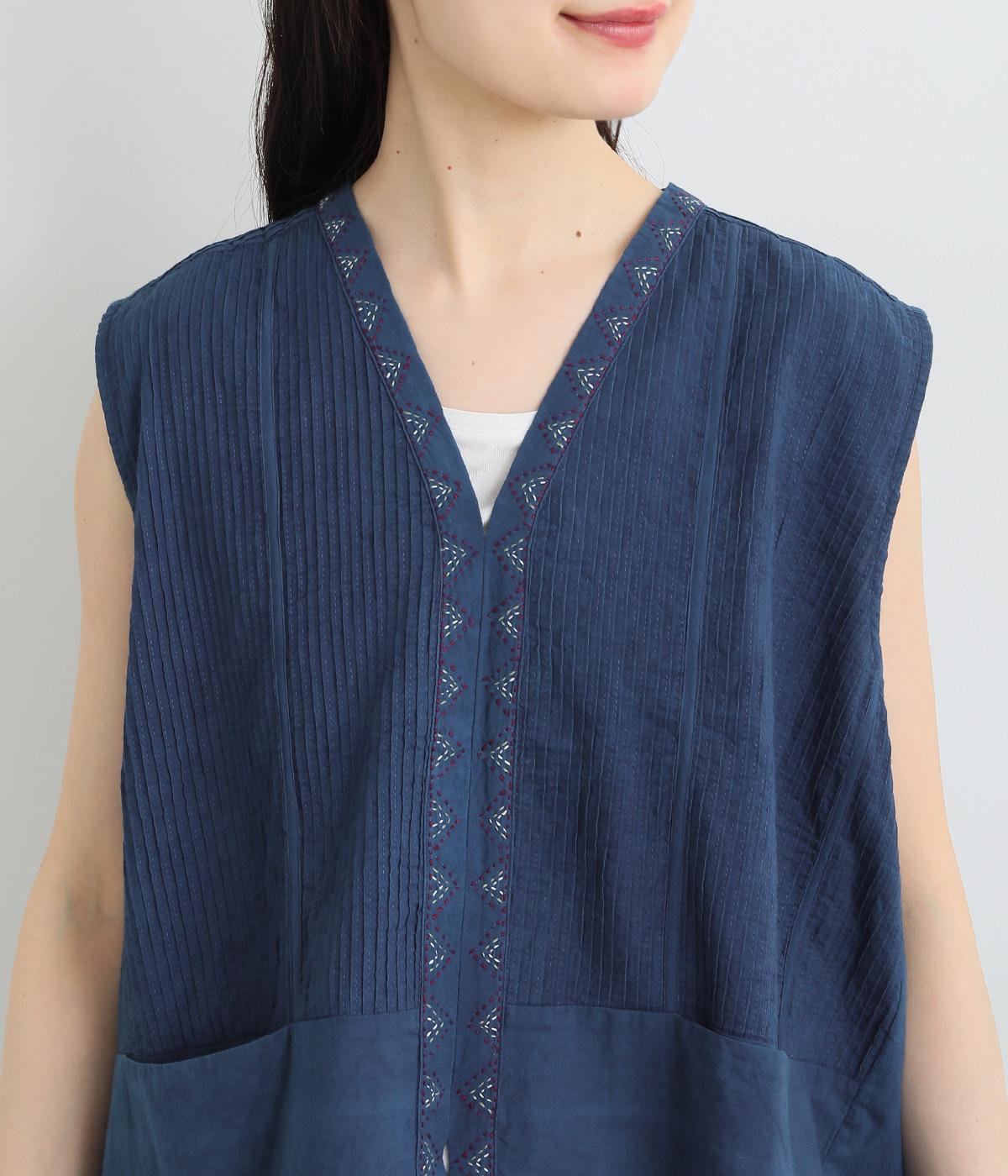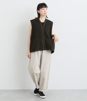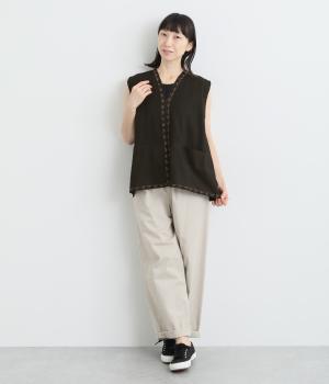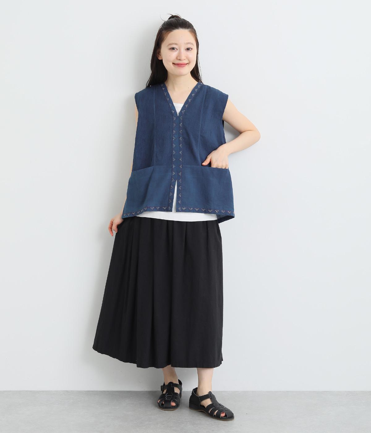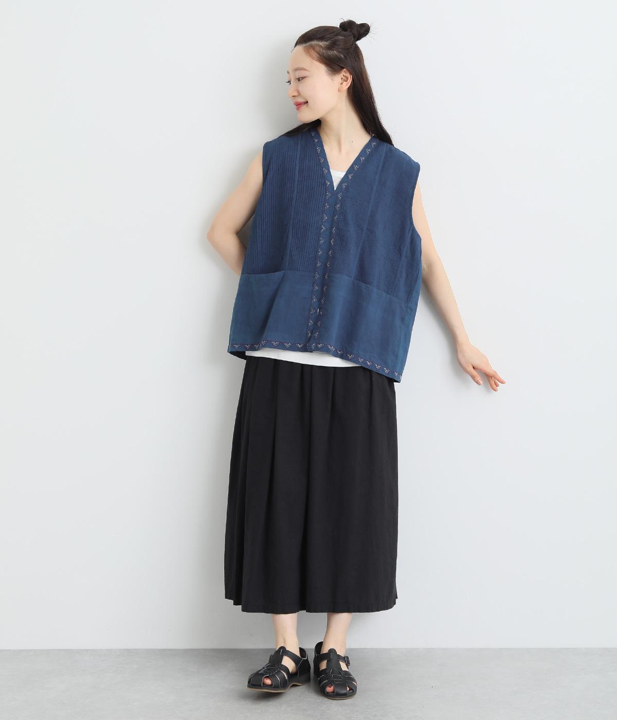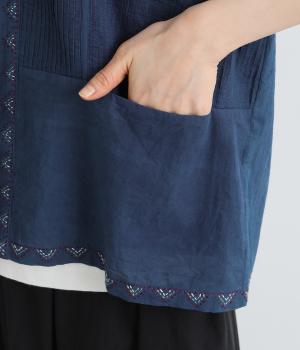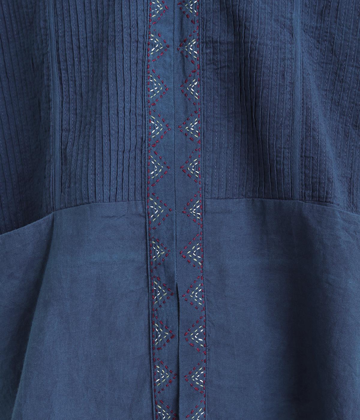 ピンタックと無地の切り替えや、前立て・裾のハンドステッチなど細部までこだわりを感じる一品。ほどよくすっきりとしたシルエットで、ボリュームのあるボトムともバランスが取りやすいです。前身頃にポケットつきなのもうれしいポイント。