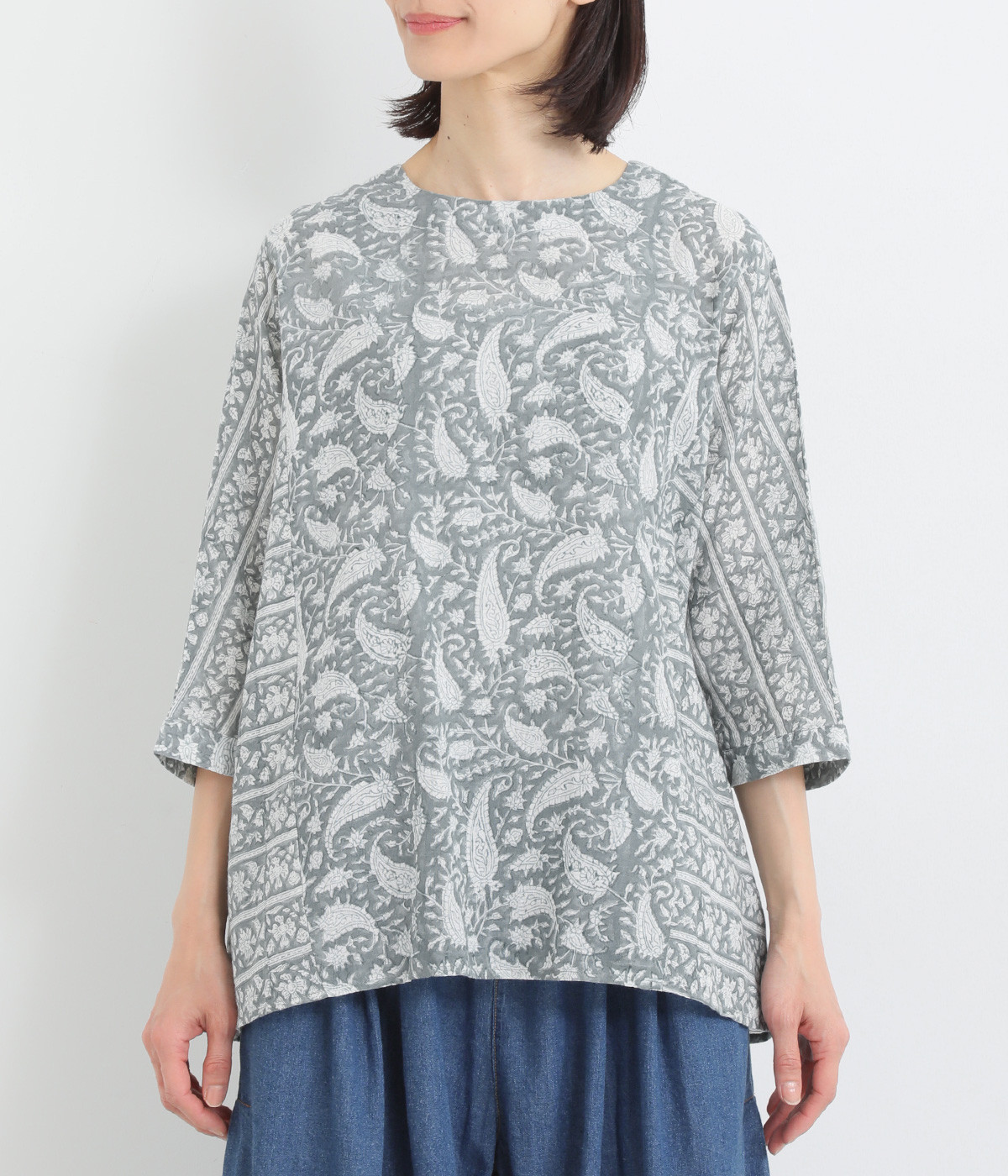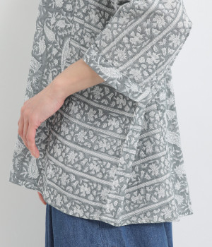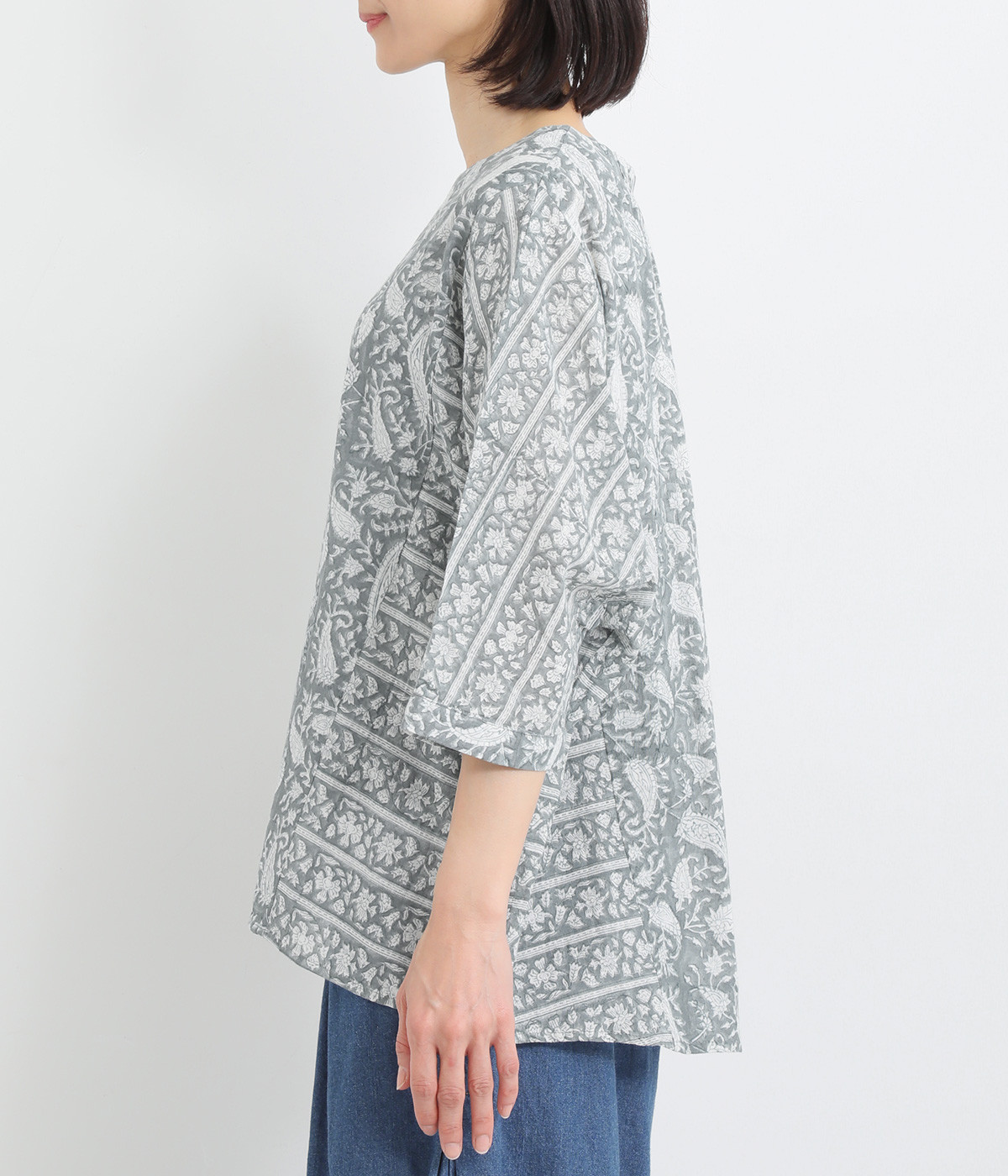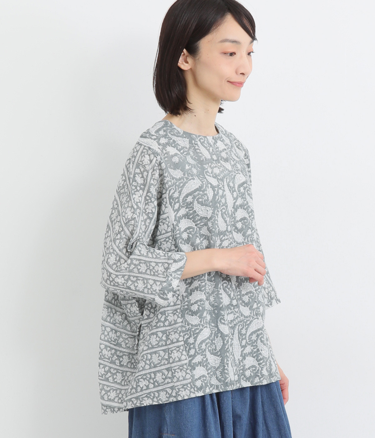 インドの伝統技法、ブロックプリントで仕立てたプルオーバー。2種類の柄を切り替え、表情豊かに仕上げました。後ろネックにはゴムを仕込み、着脱もスムーズに。ゆったりとしたワイドシルエットと、ひじを覆う長めの袖丈でリラックス感漂う一枚に。