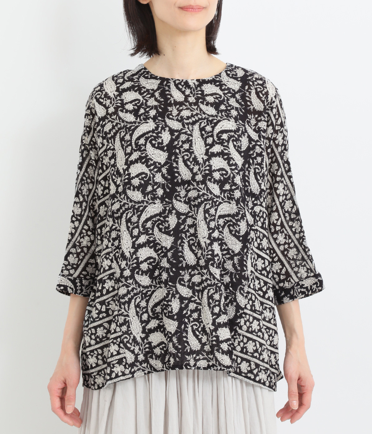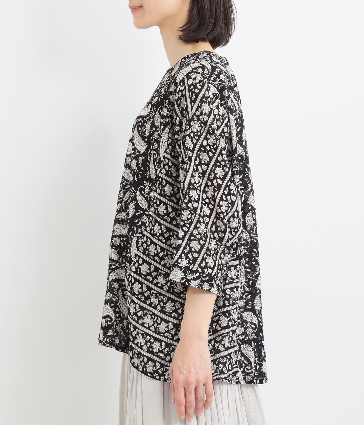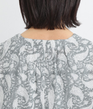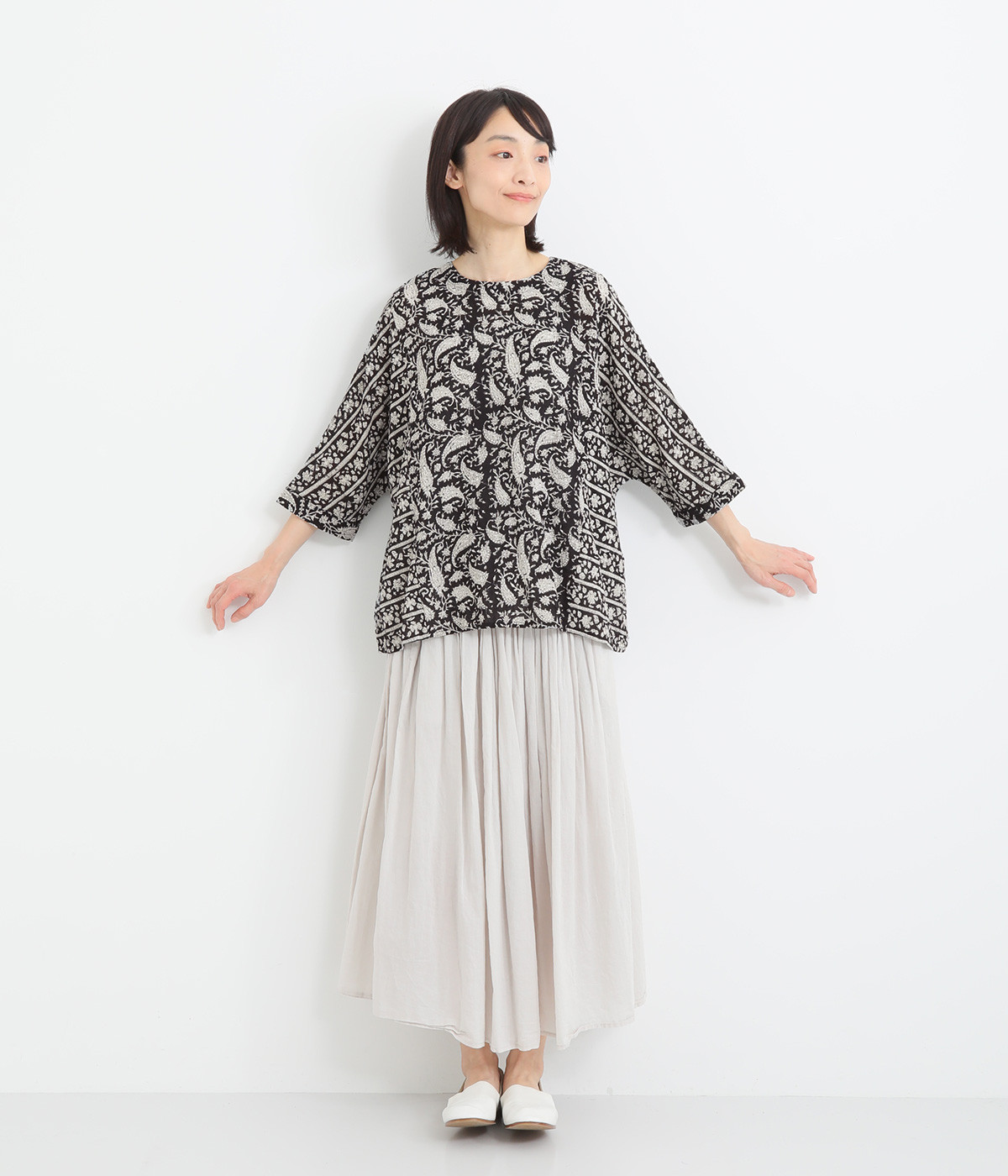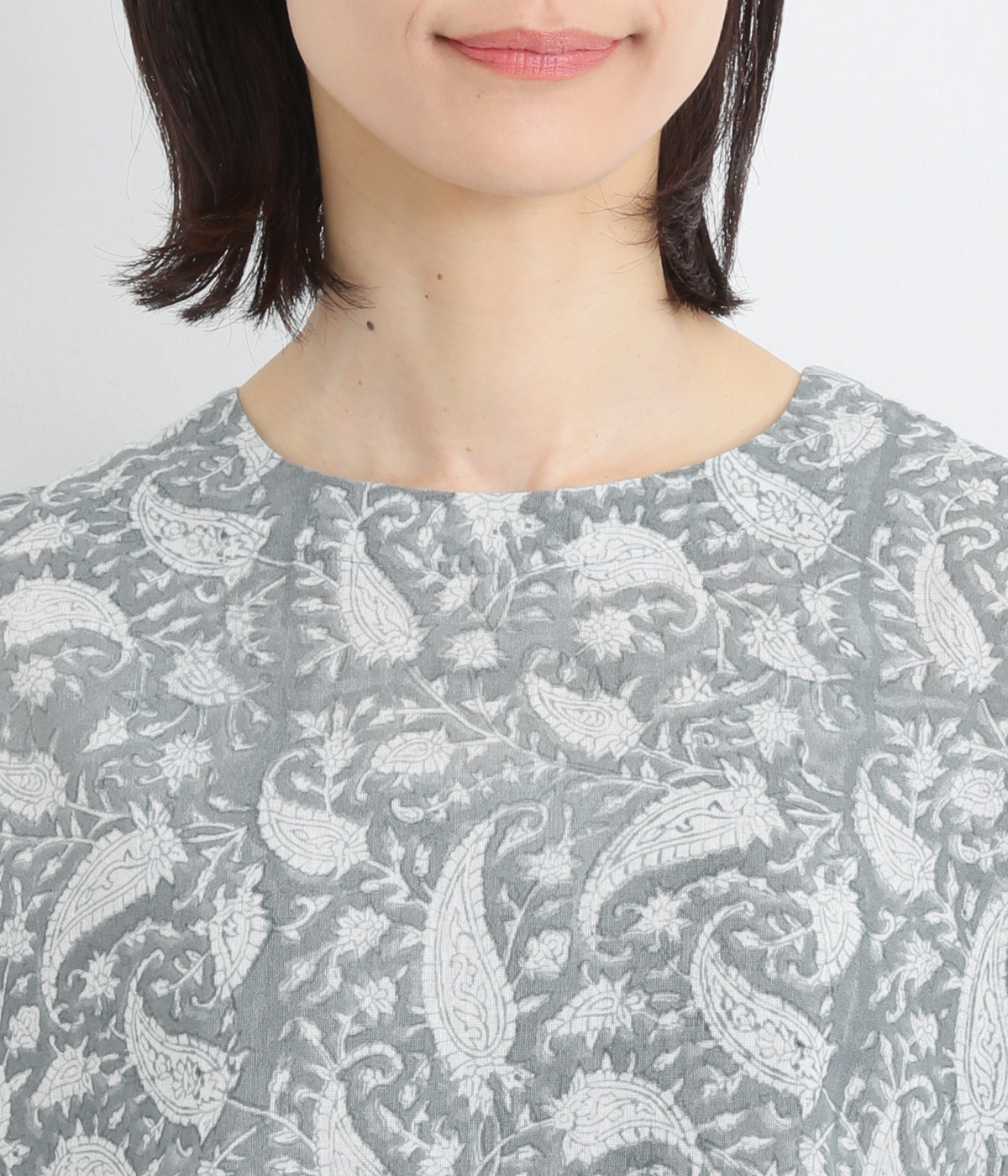 インドの伝統技法、ブロックプリントで仕立てたプルオーバー。2種類の柄を切り替え、表情豊かに仕上げました。後ろネックにはゴムを仕込み、着脱もスムーズに。ゆったりとしたワイドシルエットと、ひじを覆う長めの袖丈でリラックス感漂う一枚に。