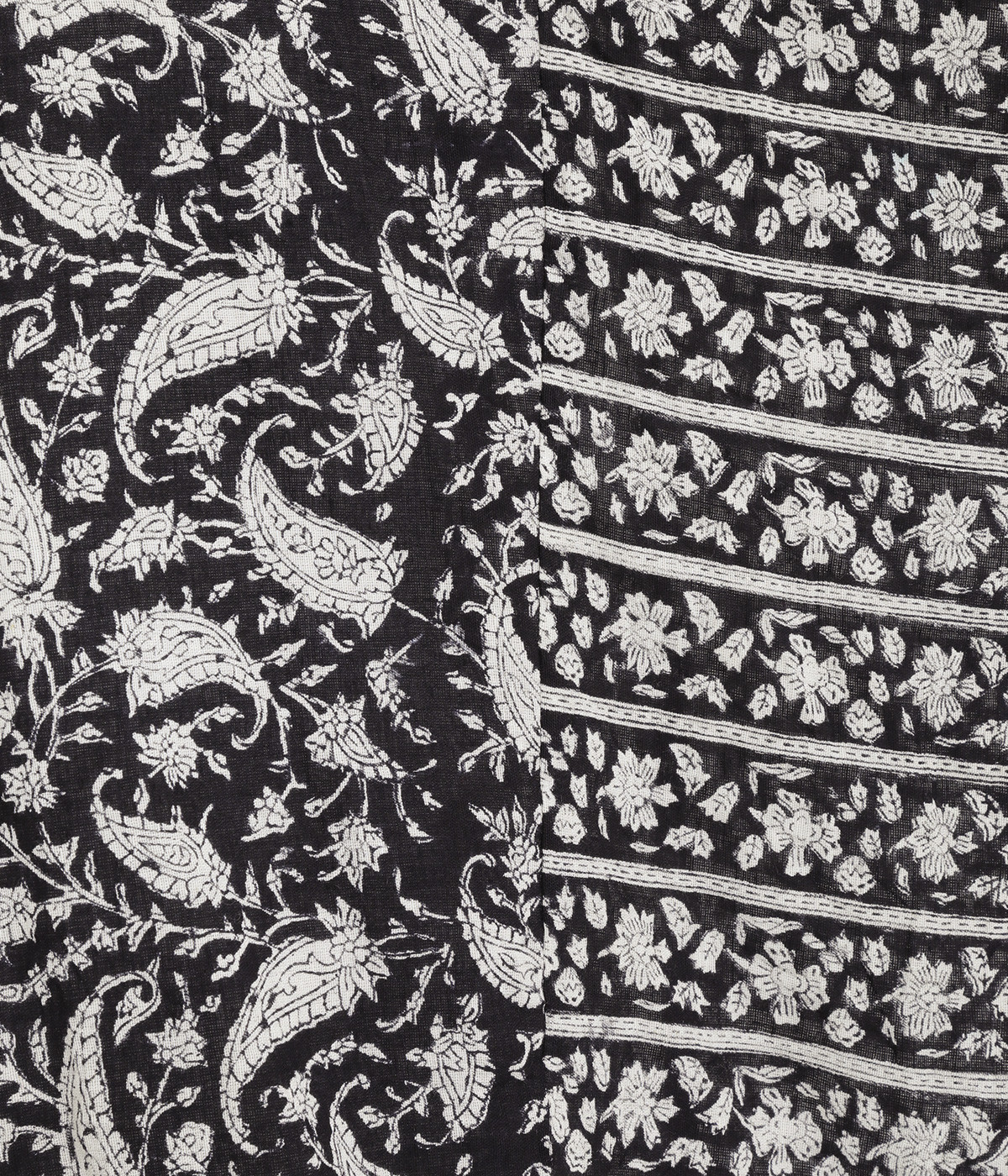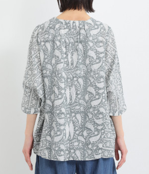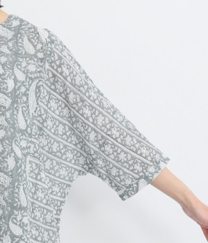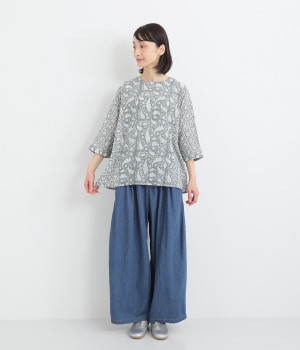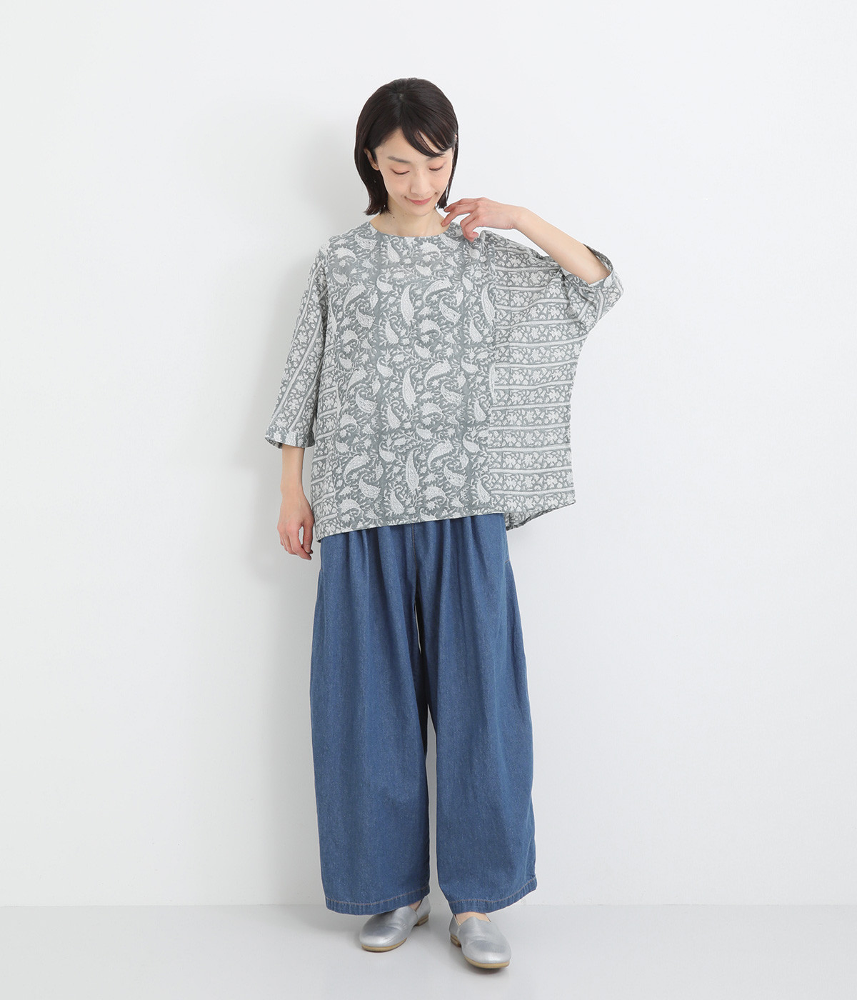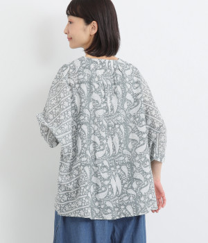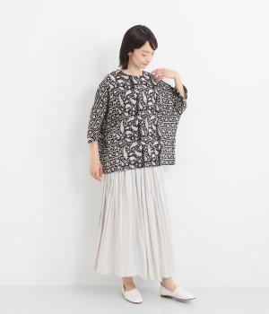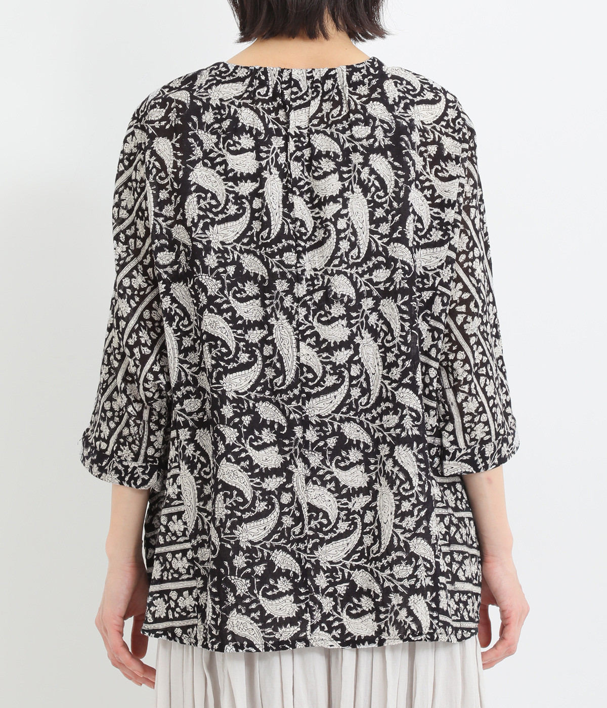 インドの伝統技法、ブロックプリントで仕立てたプルオーバー。2種類の柄を切り替え、表情豊かに仕上げました。後ろネックにはゴムを仕込み、着脱もスムーズに。ゆったりとしたワイドシルエットと、ひじを覆う長めの袖丈でリラックス感漂う一枚に。
