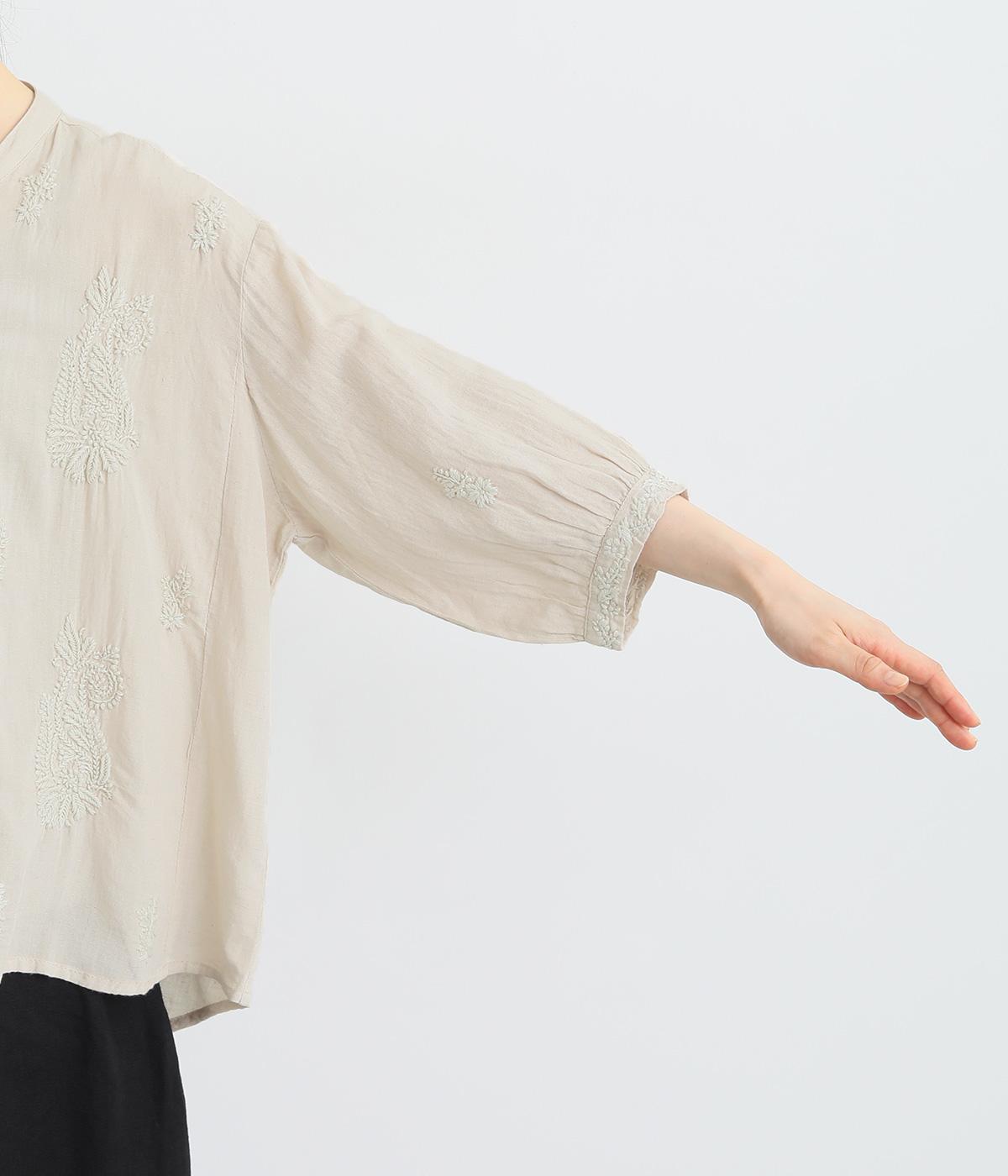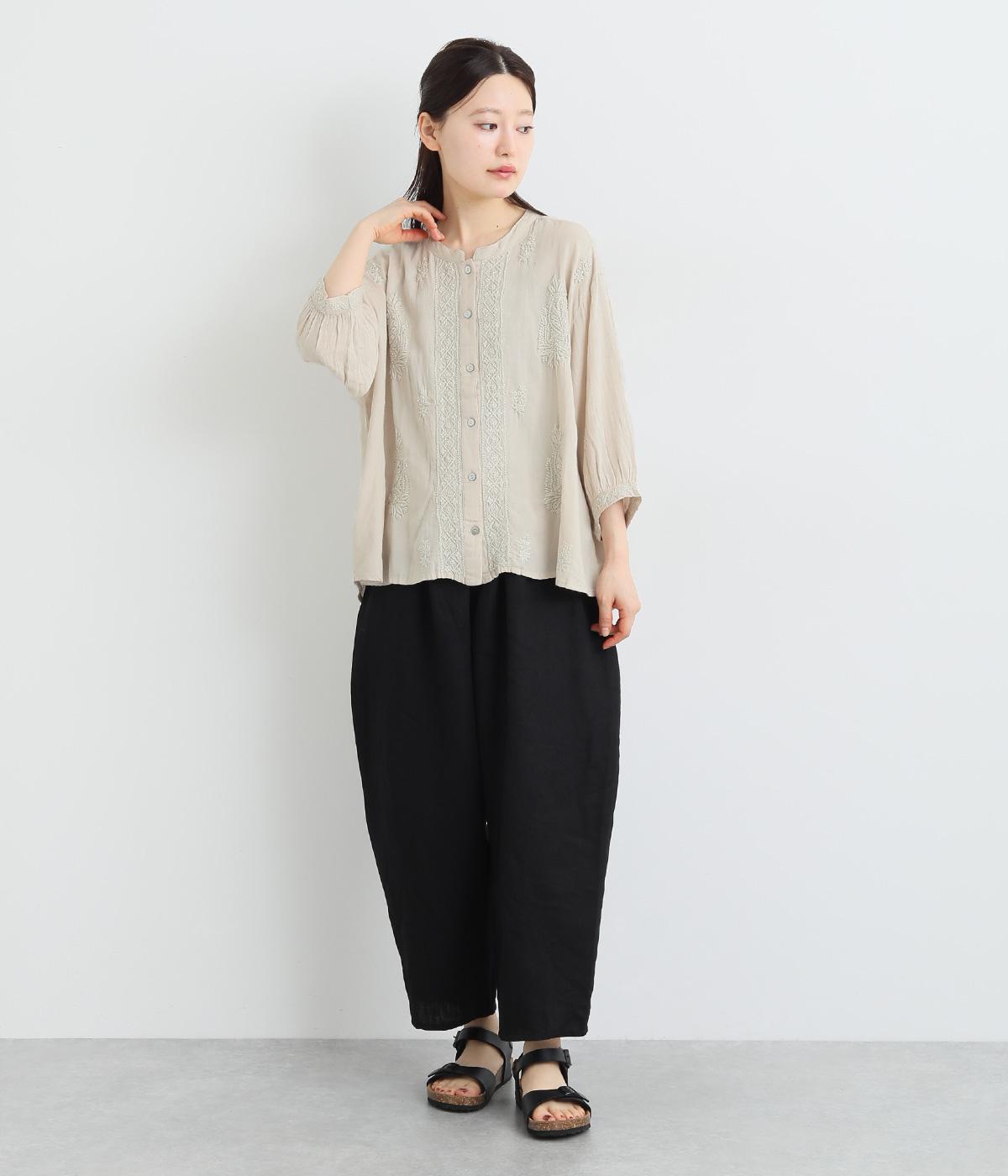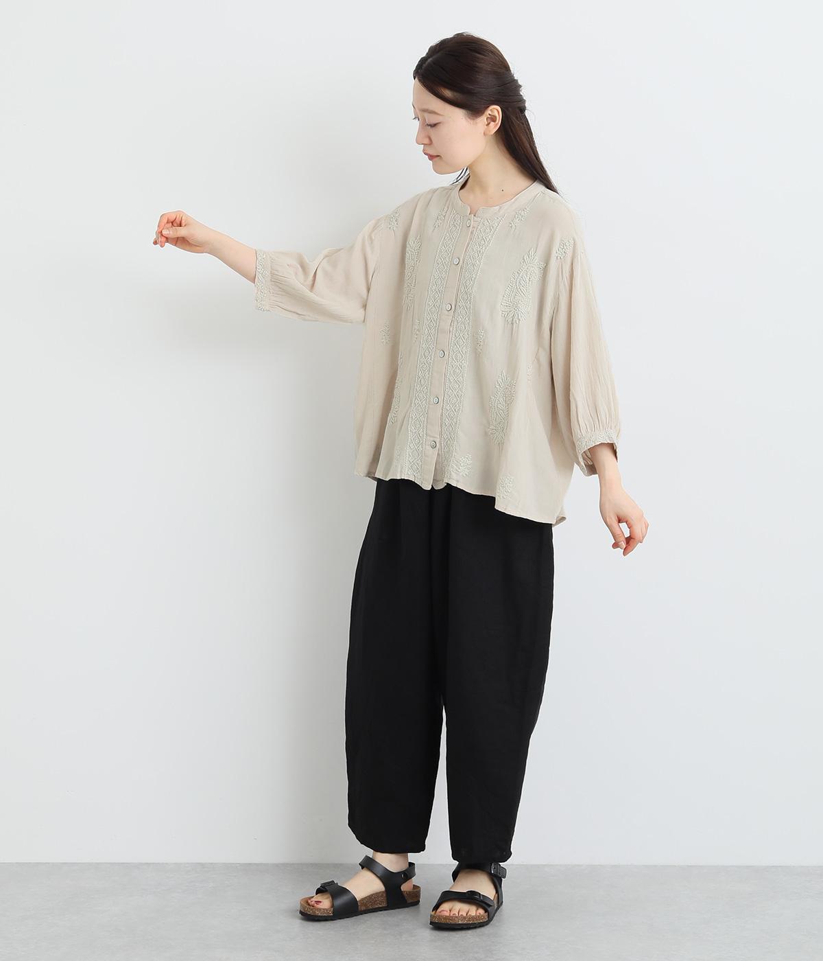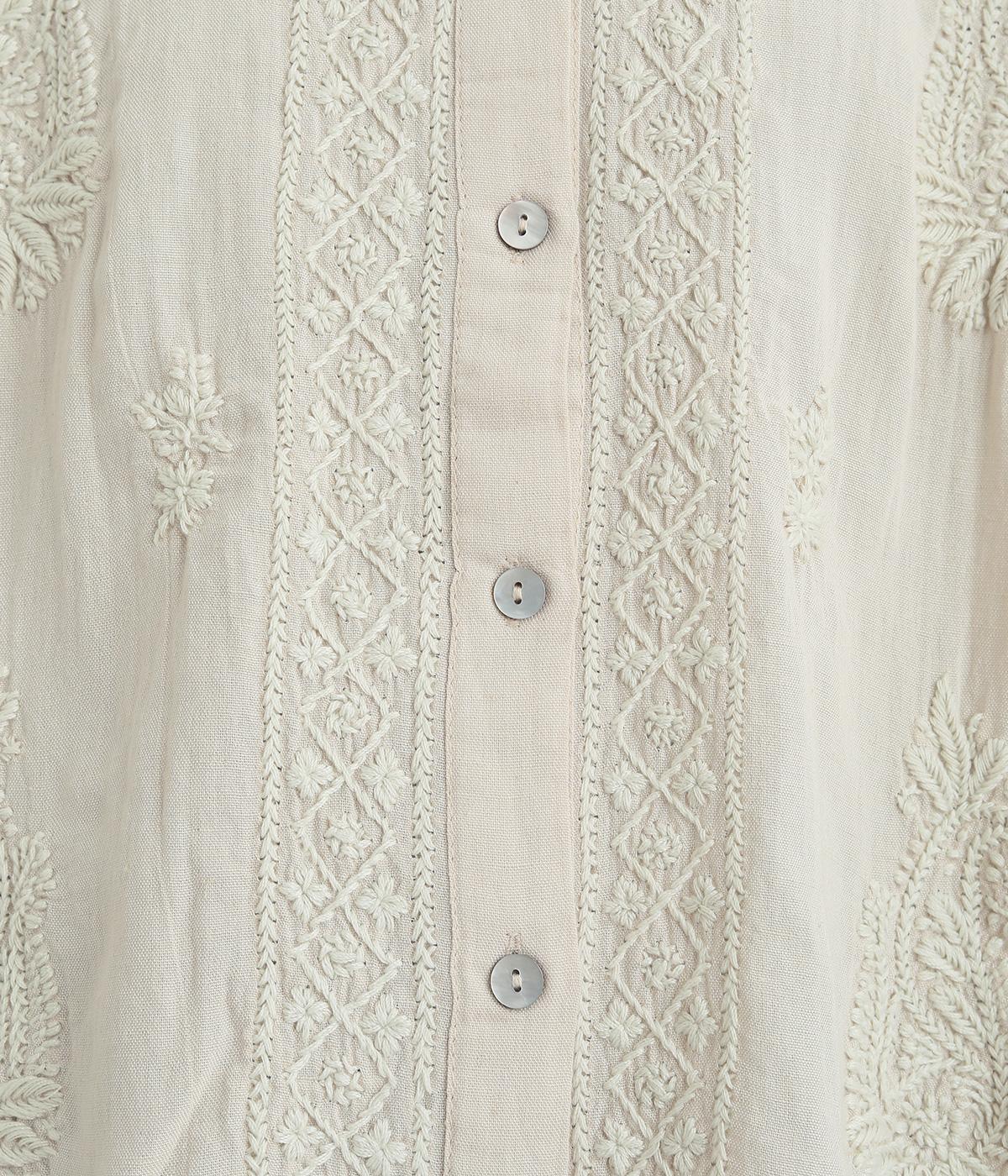 白糸を使用し、細かい模様を布地に刺繍するラクノウ刺しゅうを贅沢に施したブラウス。長すぎず短すぎない丈感で、幅広いボトムに合わせられます。前開きなので軽いはおりとしても使え、ロングシーズン活躍します。