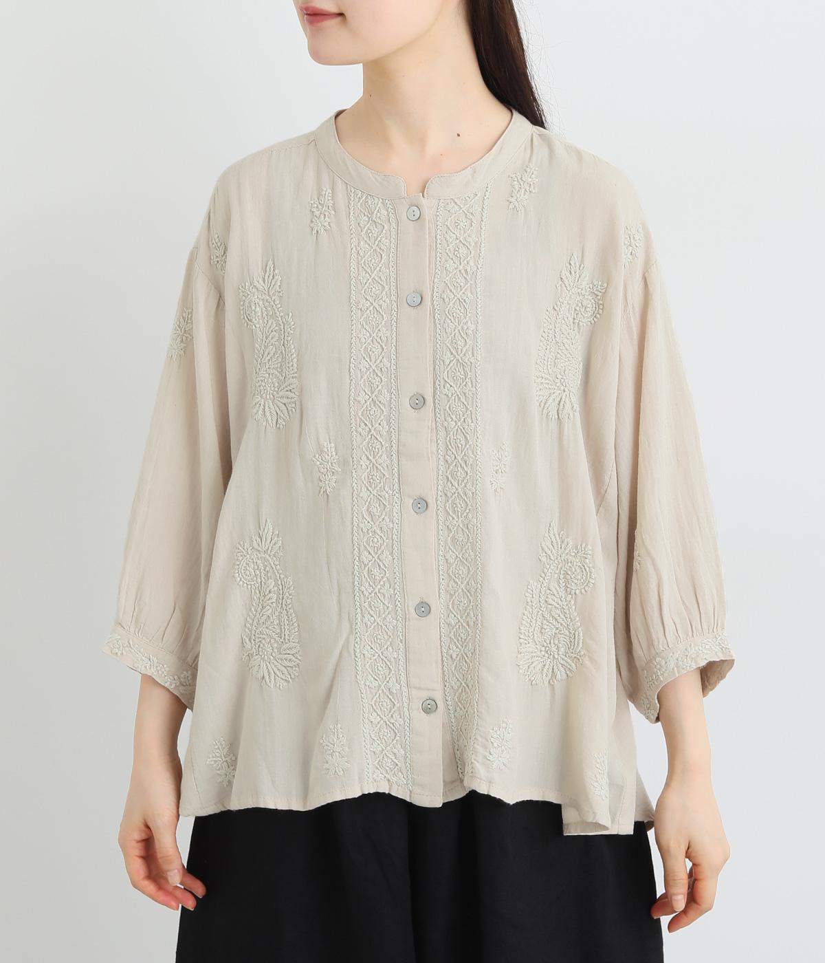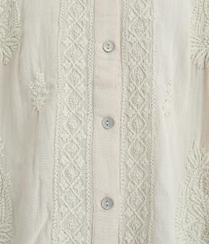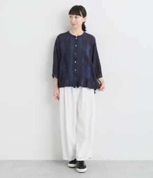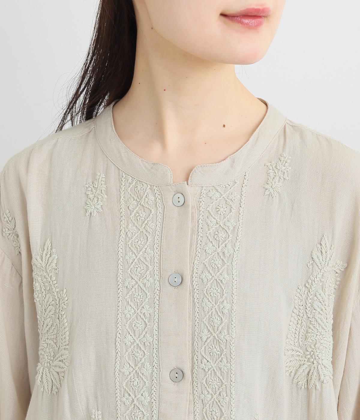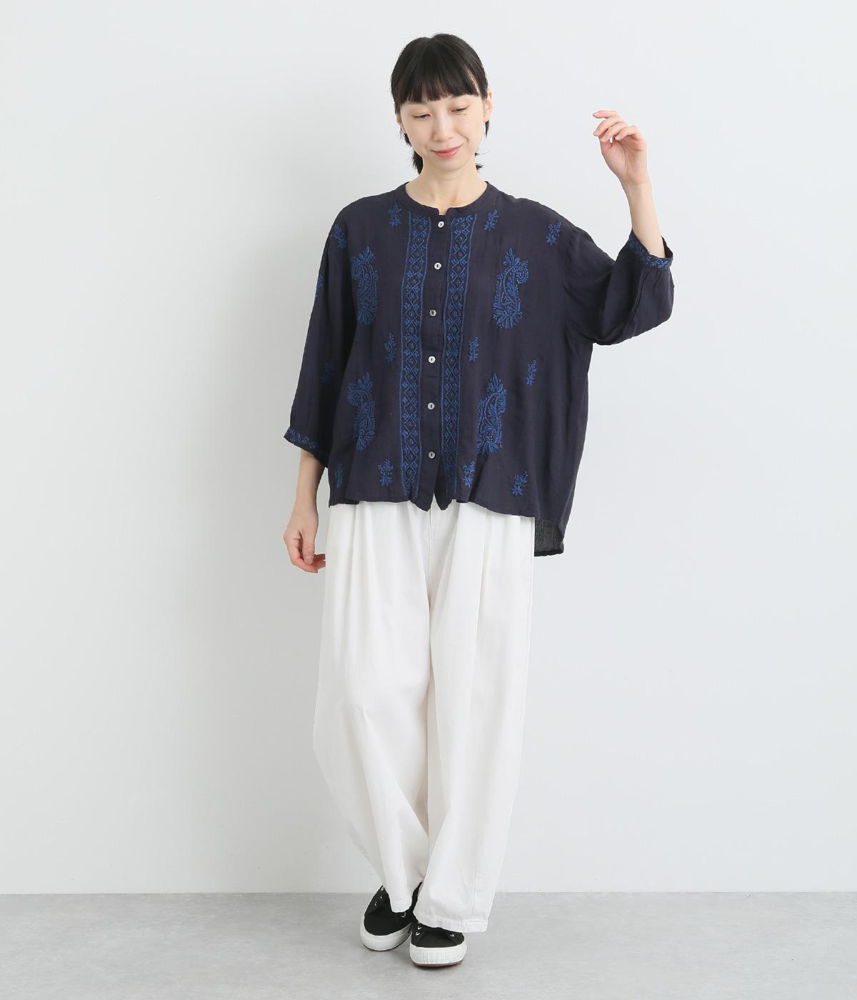 白糸を使用し、細かい模様を布地に刺繍するラクノウ刺しゅうを贅沢に施したブラウス。長すぎず短すぎない丈感で、幅広いボトムに合わせられます。前開きなので軽いはおりとしても使え、ロングシーズン活躍します。