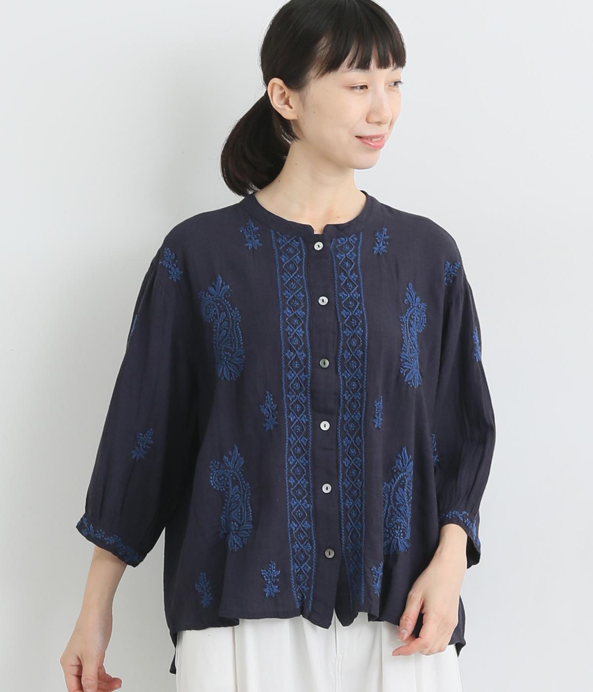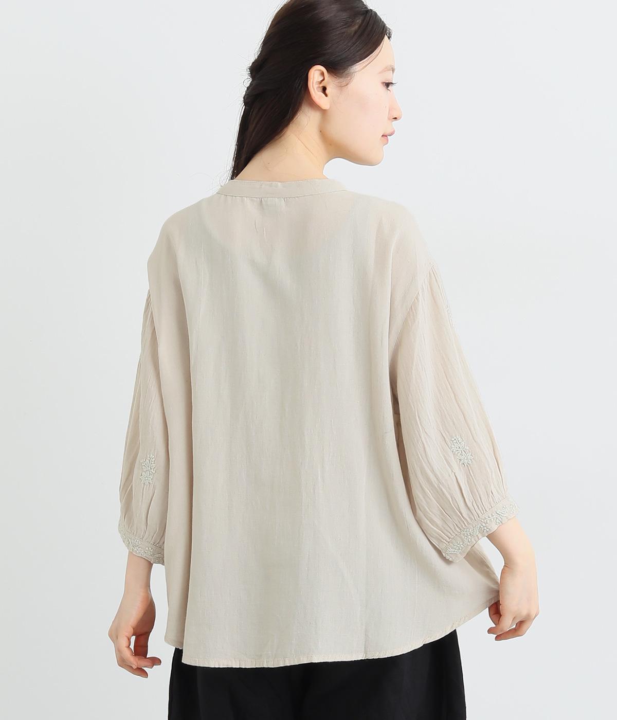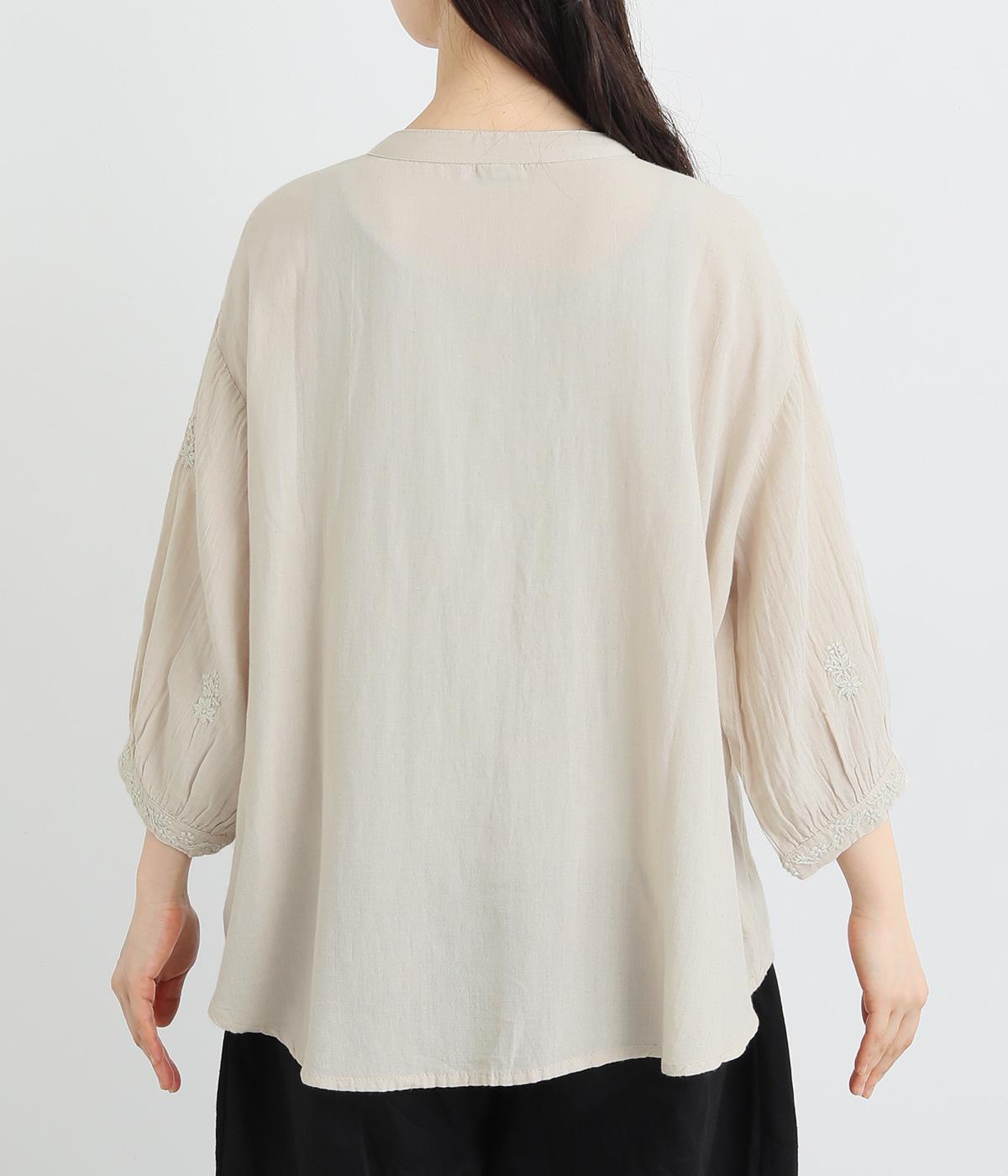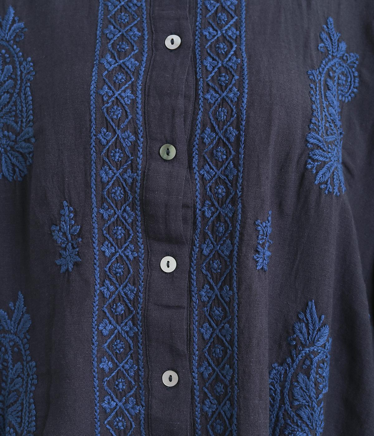 白糸を使用し、細かい模様を布地に刺繍するラクノウ刺しゅうを贅沢に施したブラウス。長すぎず短すぎない丈感で、幅広いボトムに合わせられます。前開きなので軽いはおりとしても使え、ロングシーズン活躍します。