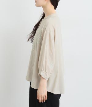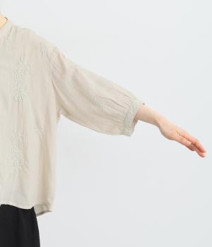 綿、レーヨン、麻の混紡生地で、ナチュラルな風合いが特徴。やわらかく涼しいので、着心地も快適です。身頃の刺しゅうは全て手刺しゅうで、ぷっくりとした立体感が魅力。