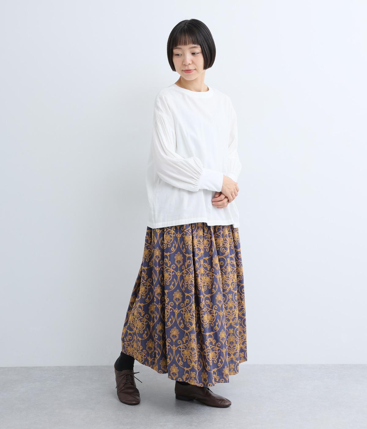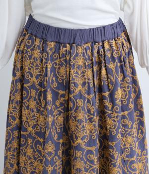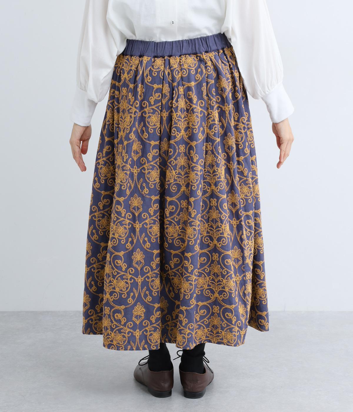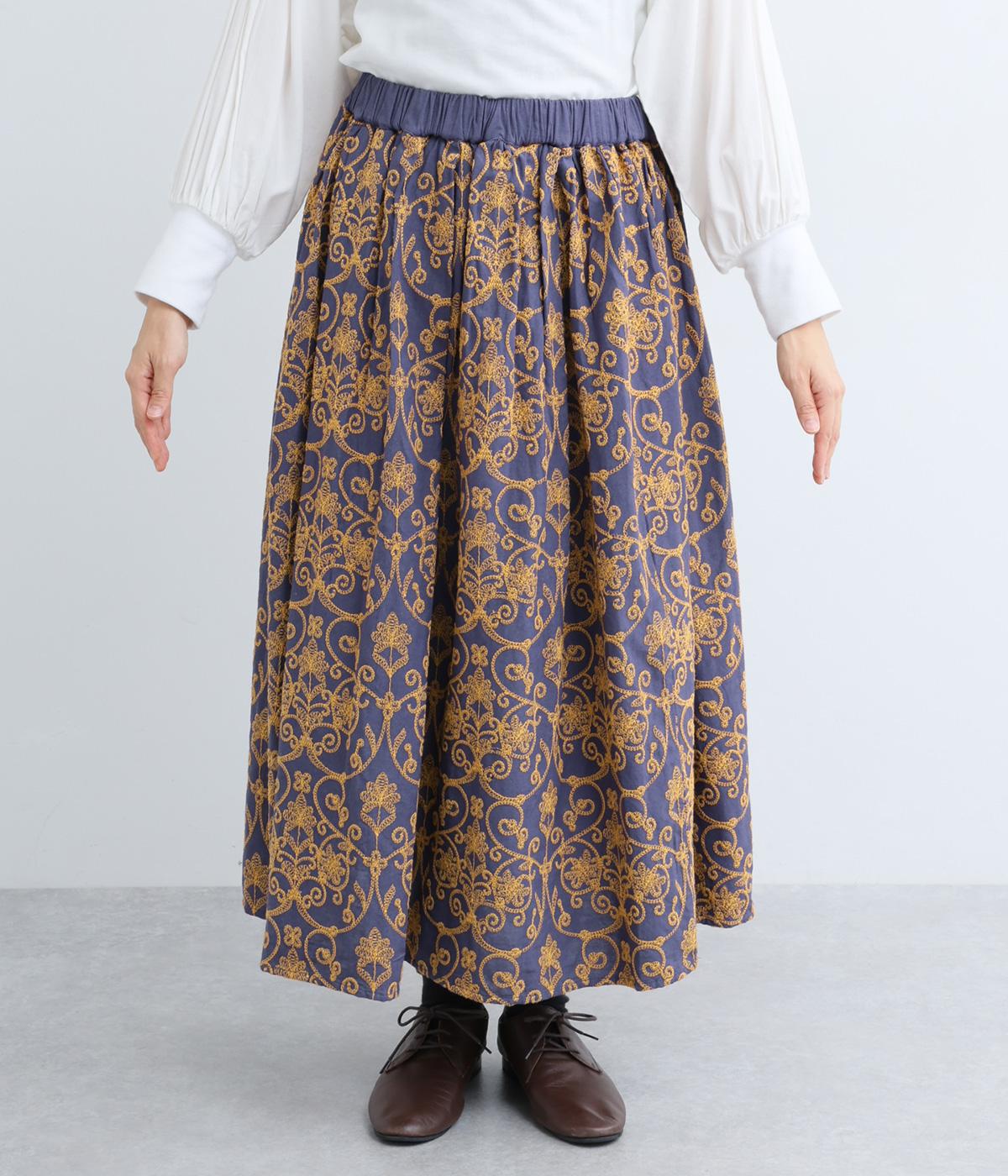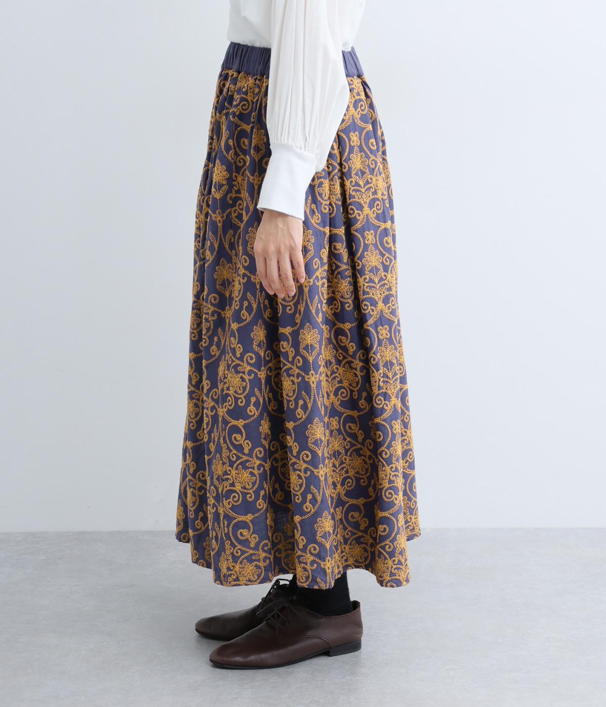 ウエストラインのギャザーで立体的なフォルムが美しいスカートです。女性らしいまるみのあるシルエットが刺しゅうの美しさを際立てます。しなやかなAラインで体型を選ばず着用できるのも◎。ちょっとだけ特別な日にも頼れる一着です。