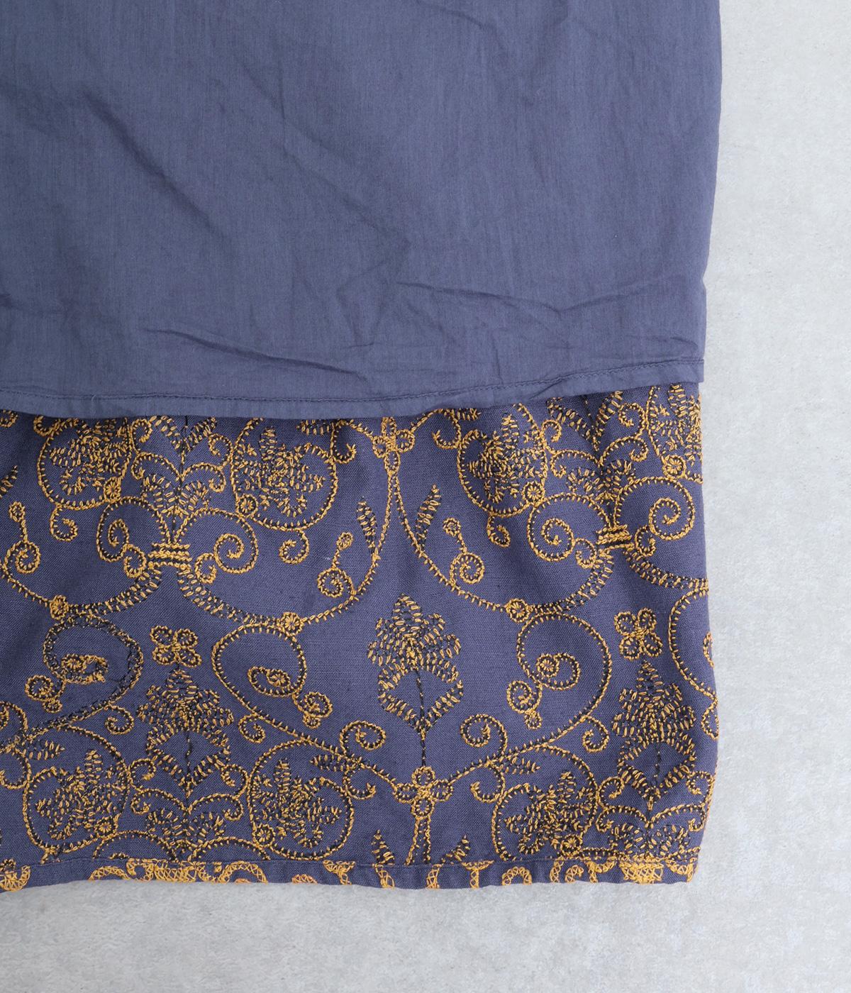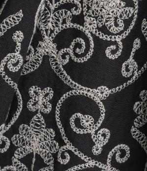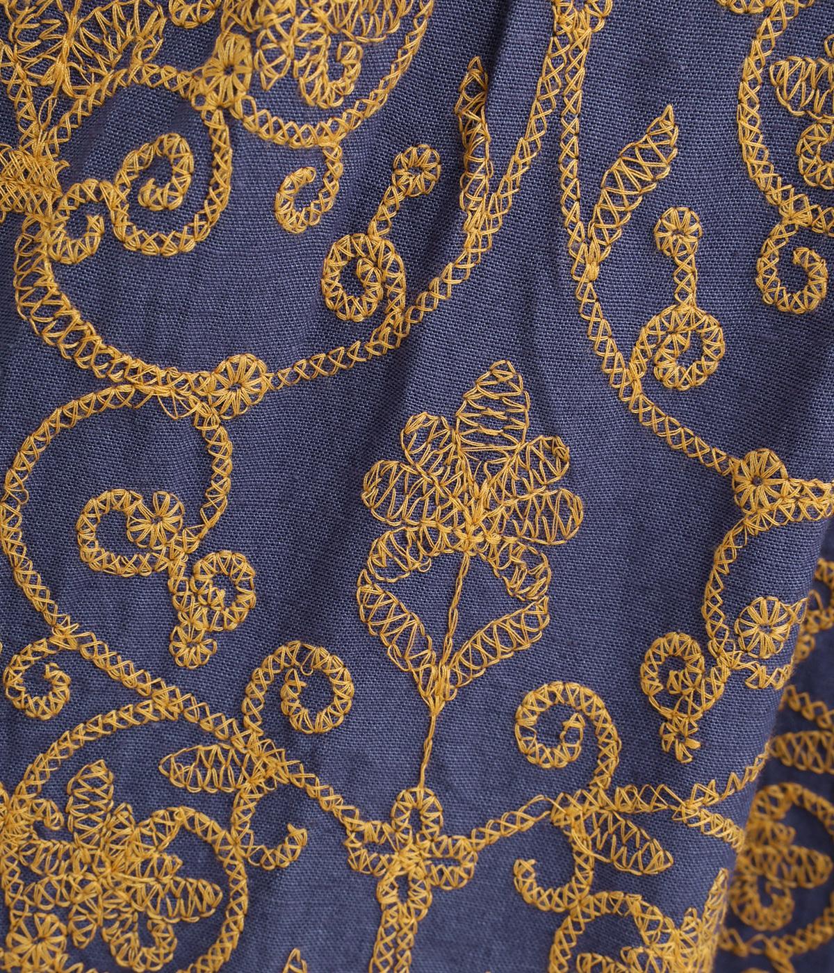コットンとレーヨン素材をメインにブレンドした心地よい生地です。裏地はコットン素材で肌当たりがやさしくなめらか。程よいボリューム感がスイートです。オリエンタル調の刺しゅうが特徴的。