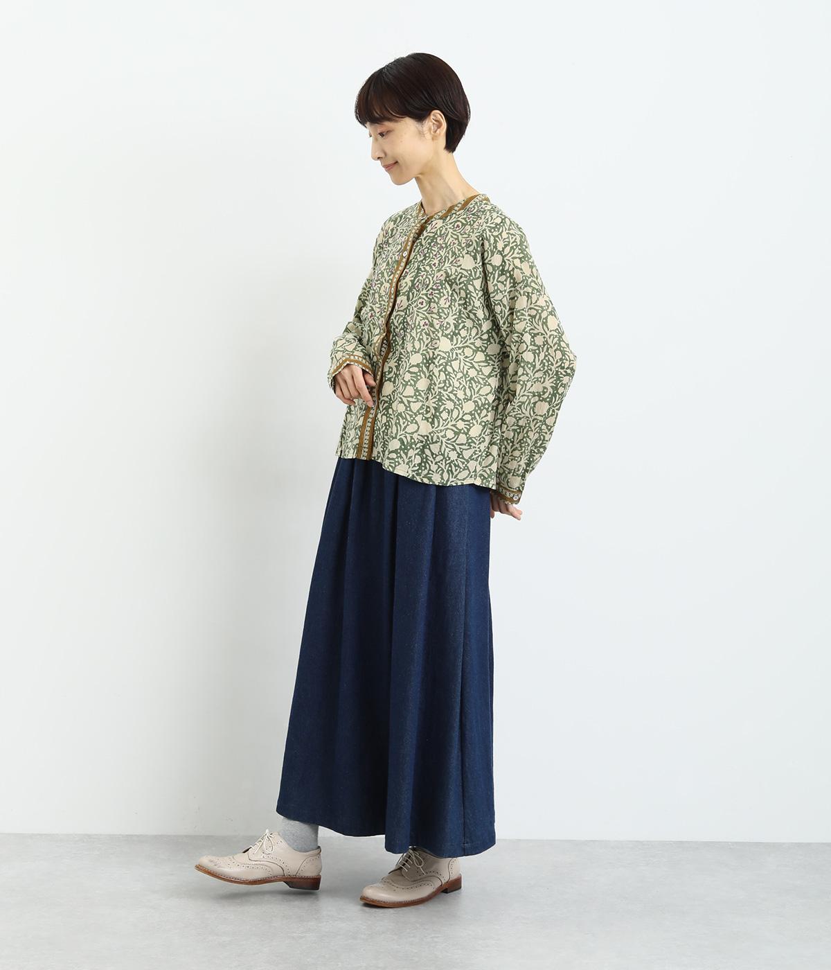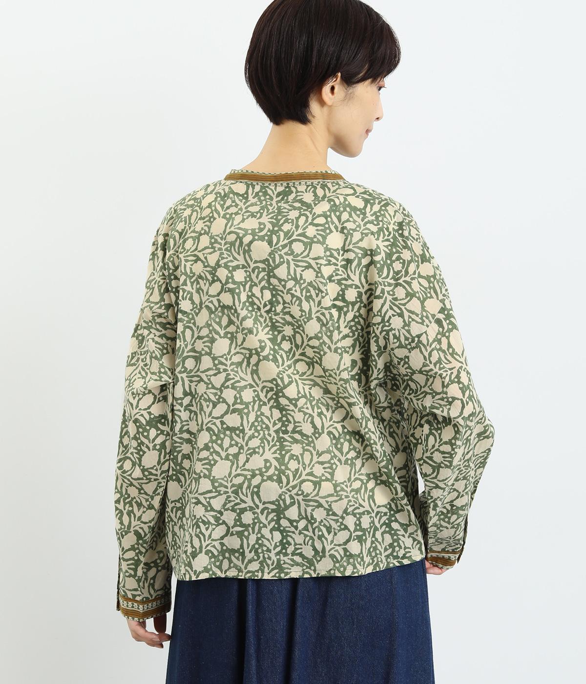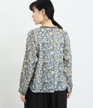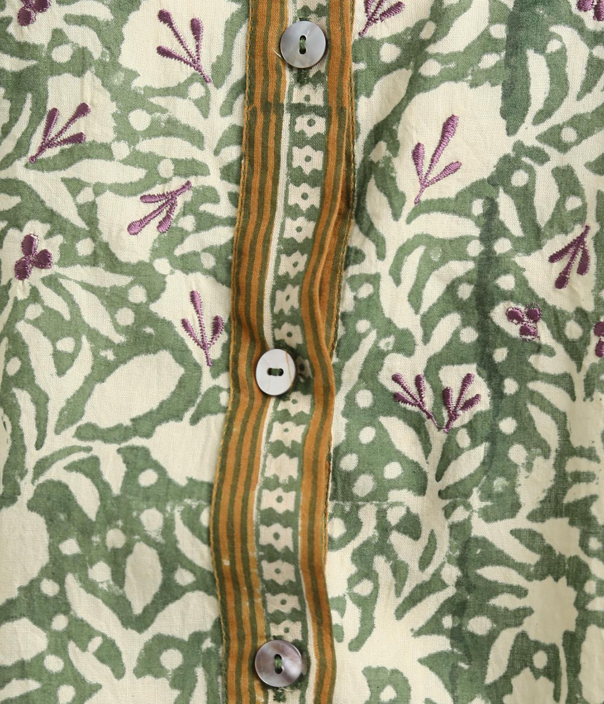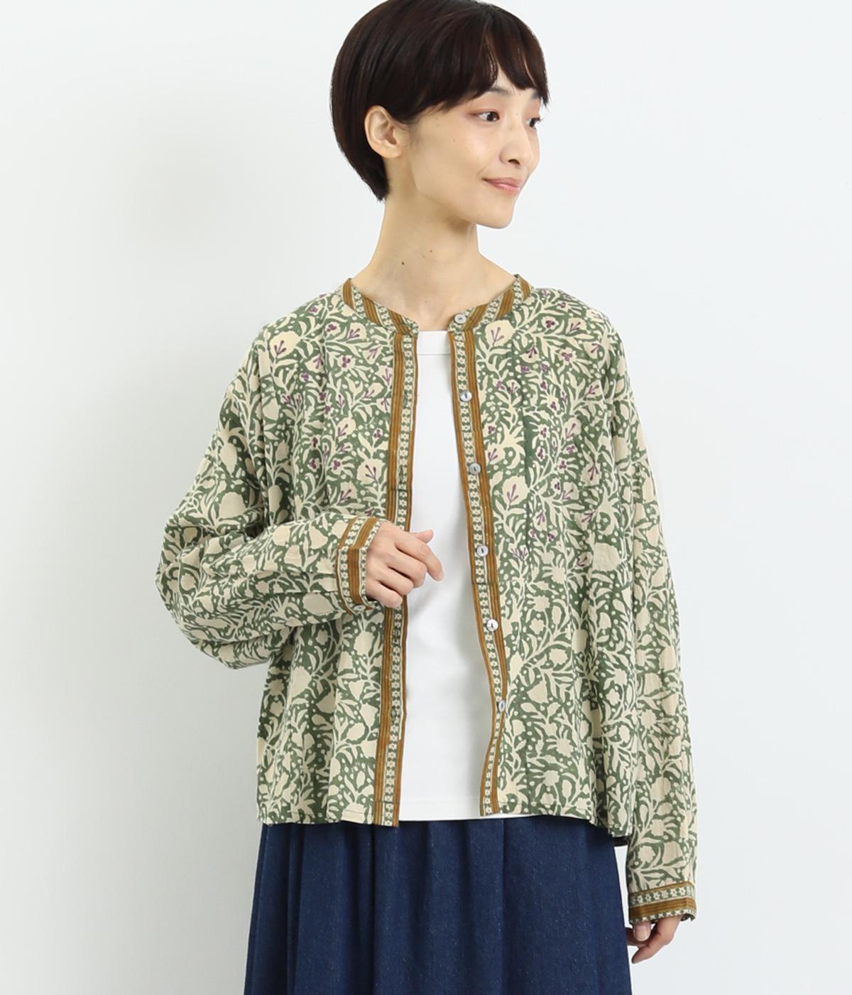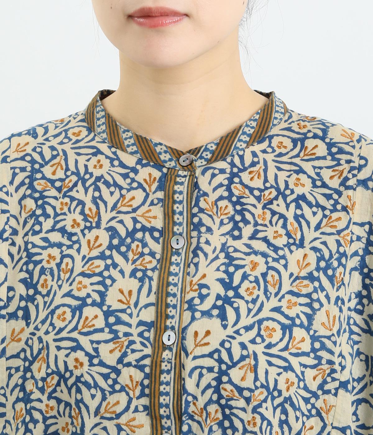 軽やかなコットン素材とぬくもりのあるブロックプリントでスイートな雰囲気が魅力。シェルボタンと小さな刺しゅうのアクセントが美しくあしらわれています。やさしい肌触りで着心地のよさも◎。