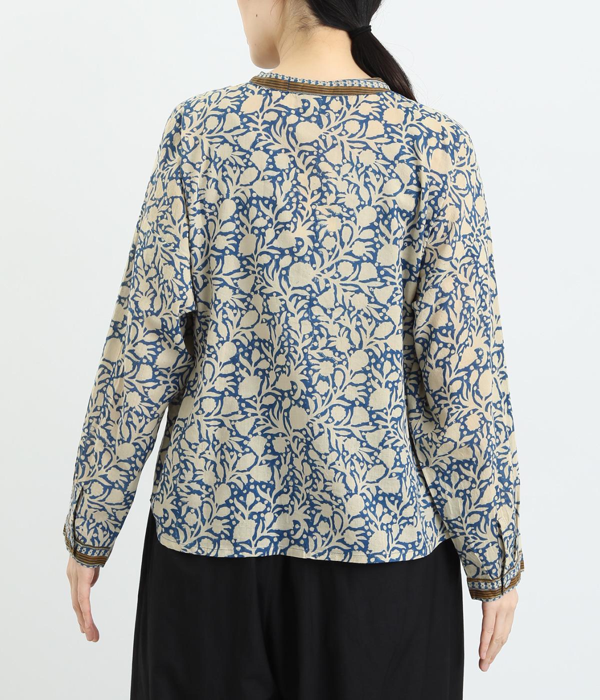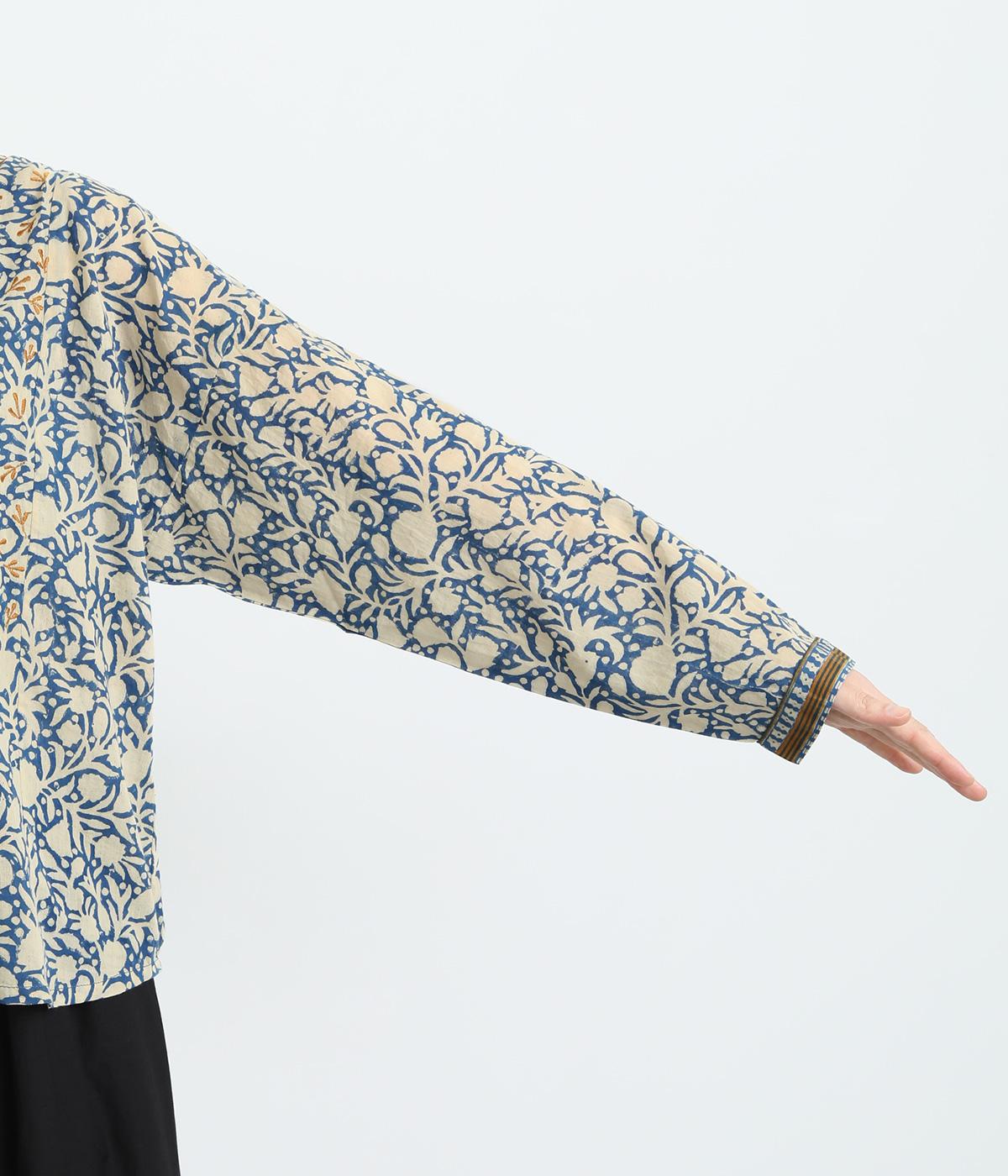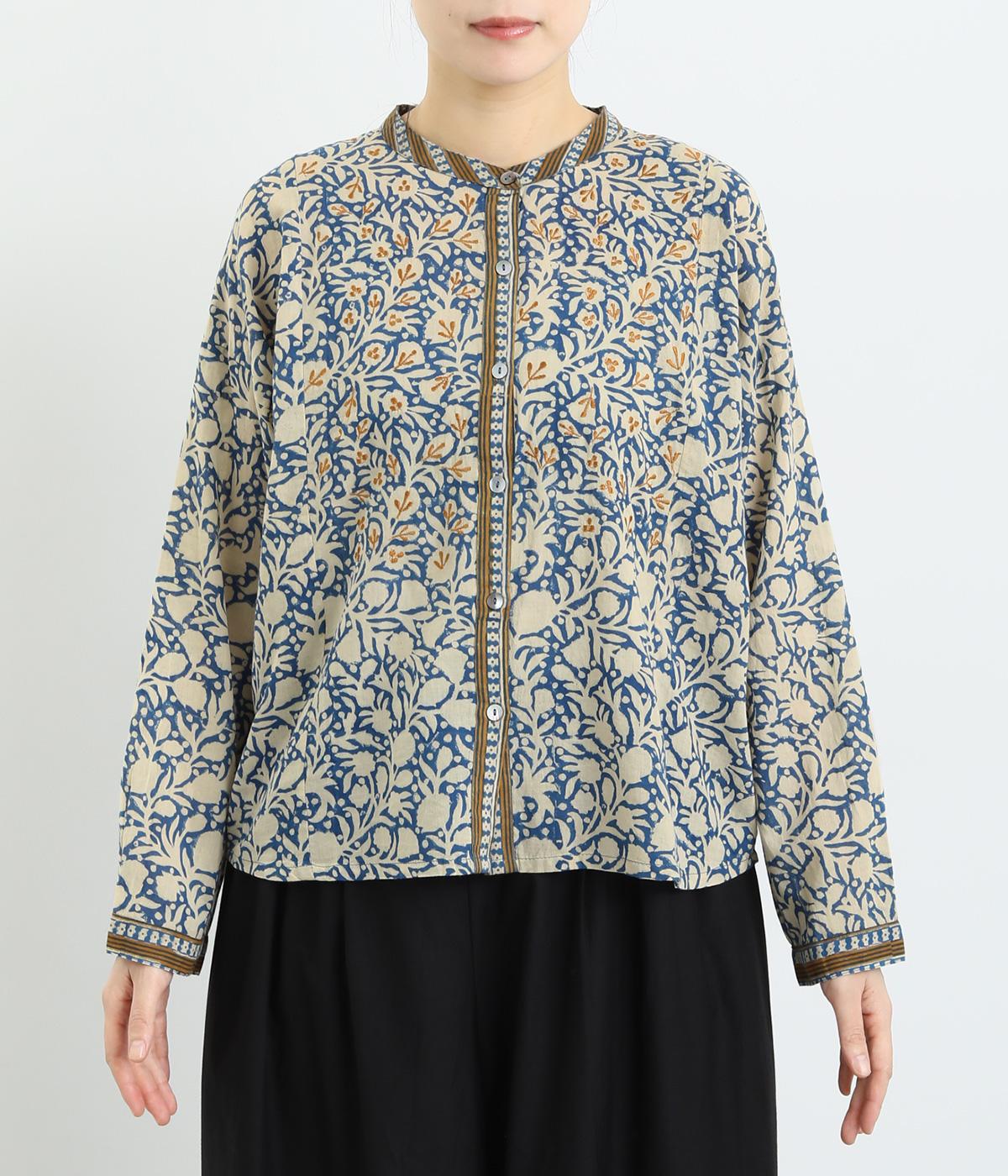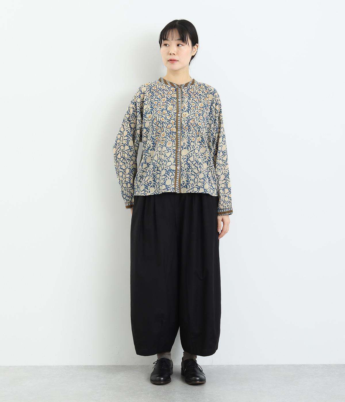 軽やかなコットン素材とぬくもりのあるブロックプリントでスイートな雰囲気が魅力。シェルボタンと小さな刺しゅうのアクセントが美しくあしらわれています。やさしい肌触りで着心地のよさも◎。