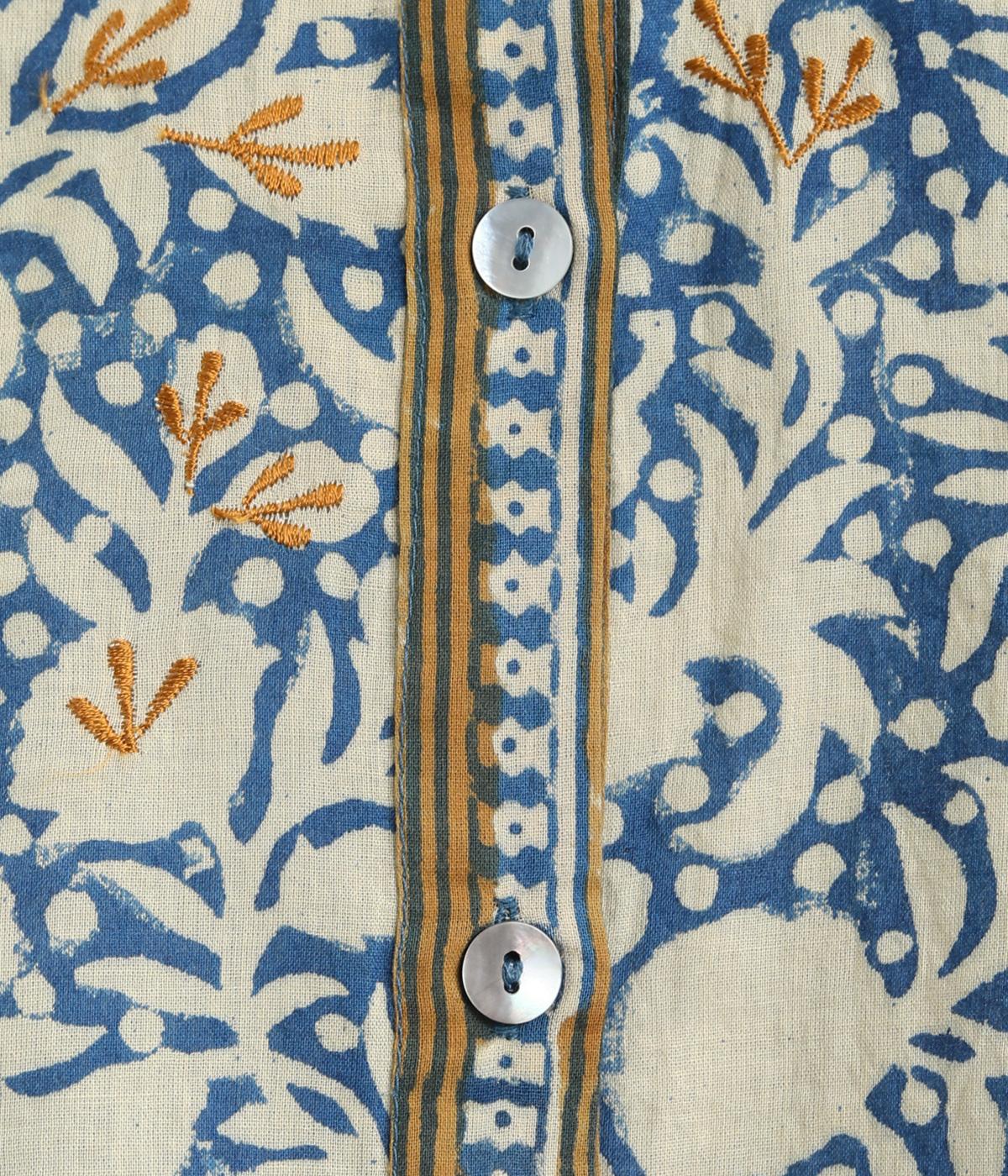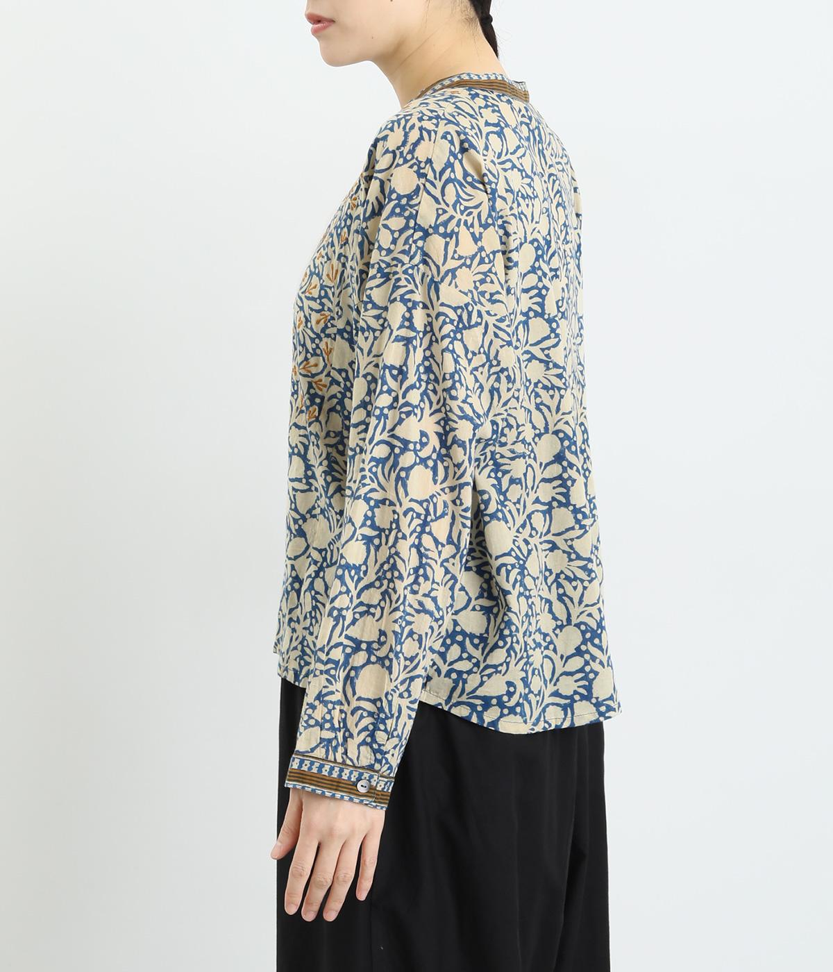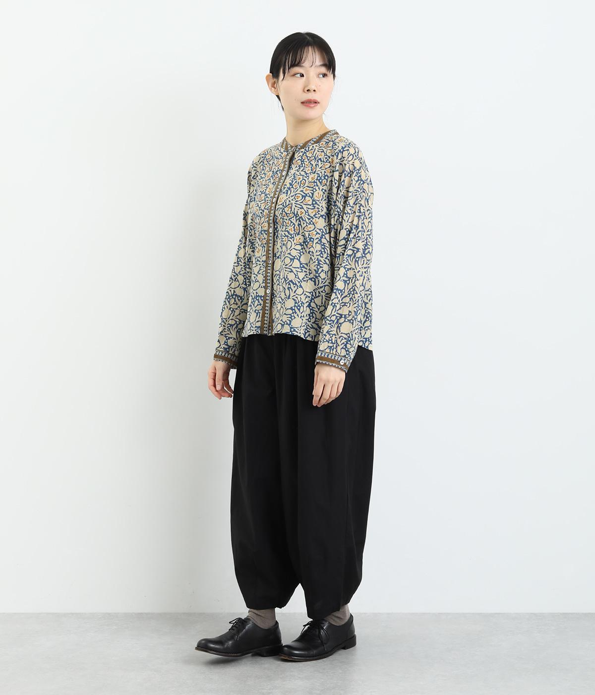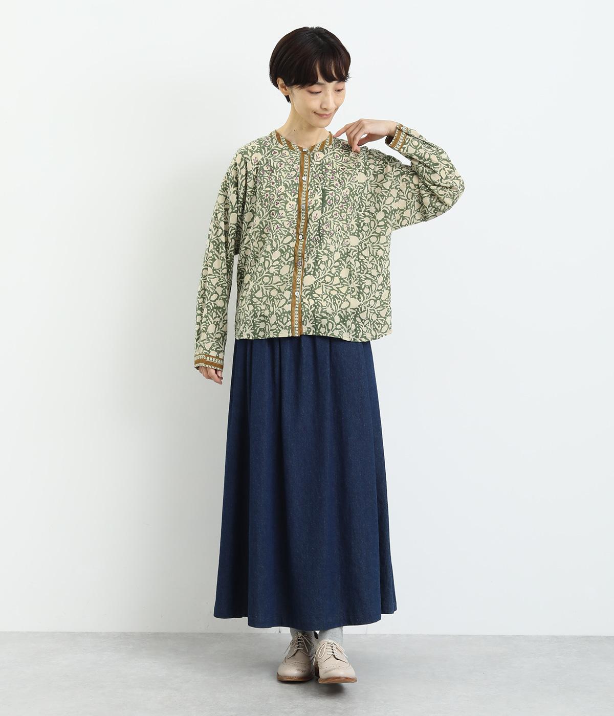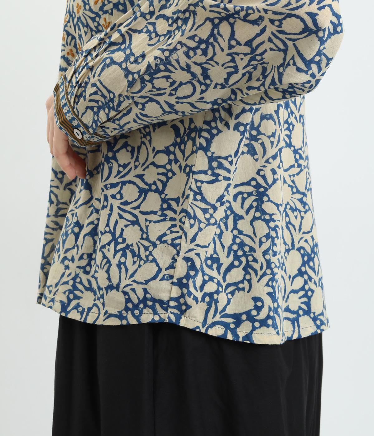 軽やかなコットン素材とぬくもりのあるブロックプリントでスイートな雰囲気が魅力。シェルボタンと小さな刺しゅうのアクセントが美しくあしらわれています。やさしい肌触りで着心地のよさも◎。