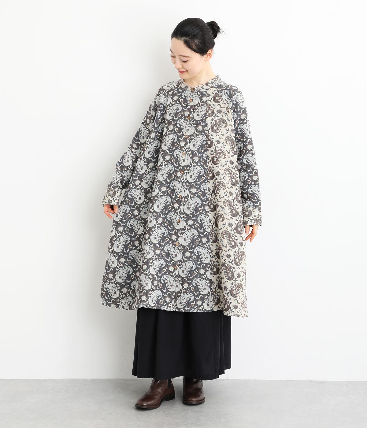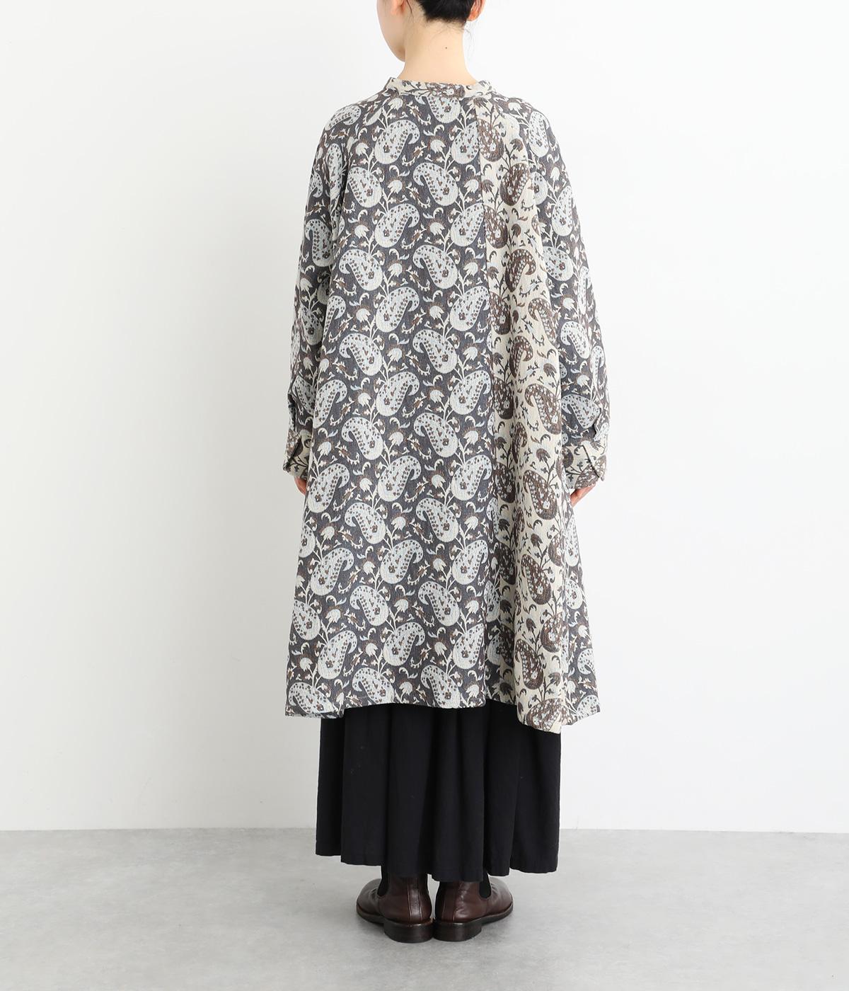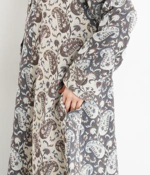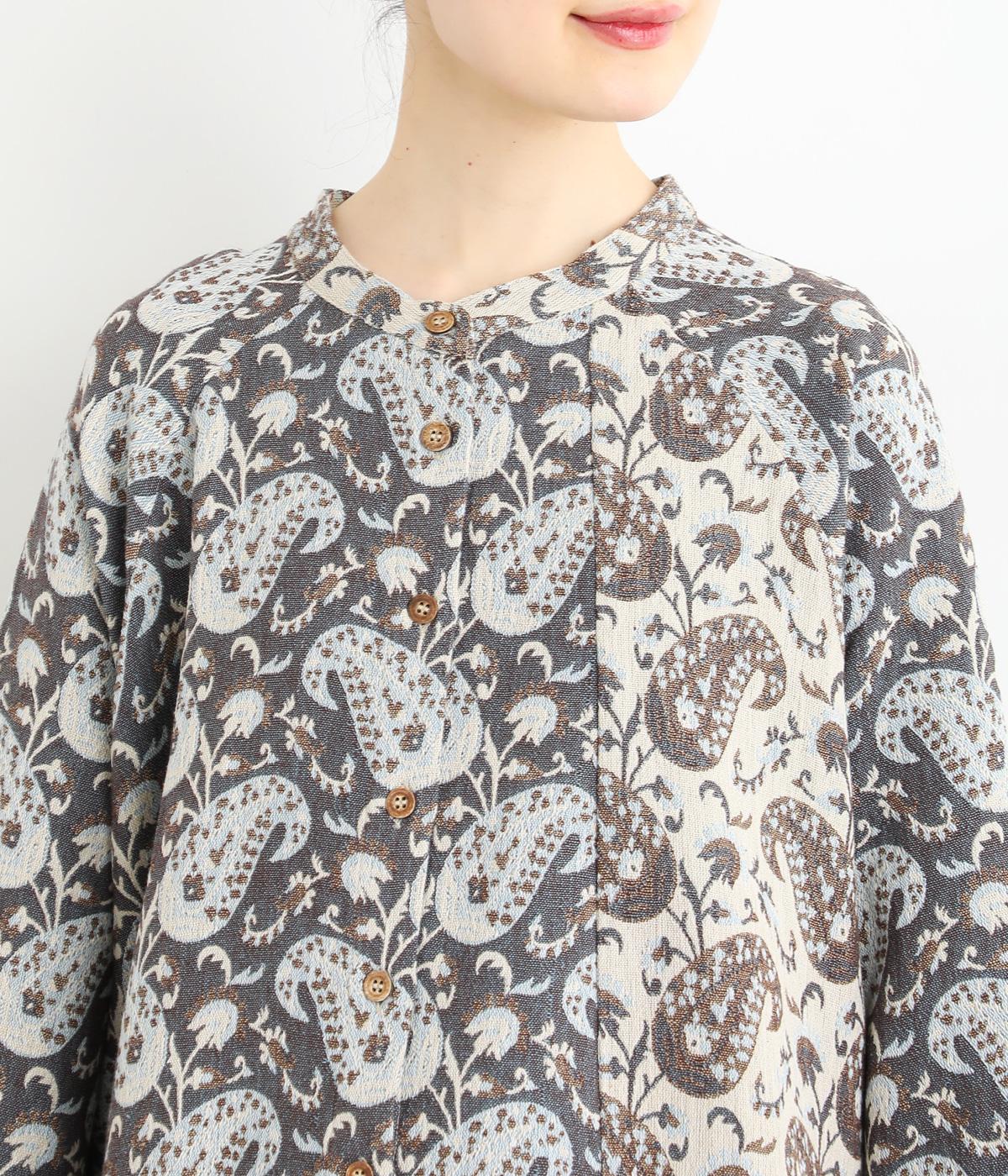 上品なペイズリー柄をたっぷりと使い、ゆるやかなラインで仕立てました。異なる色の生地でさりげなく施した切り替えが、着こなしに奥行きをつくります。小さめの木ボタンがアクセントになり、ナチュラルな装いとも相性ばつぐんです。