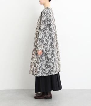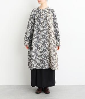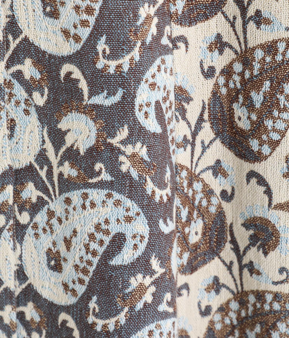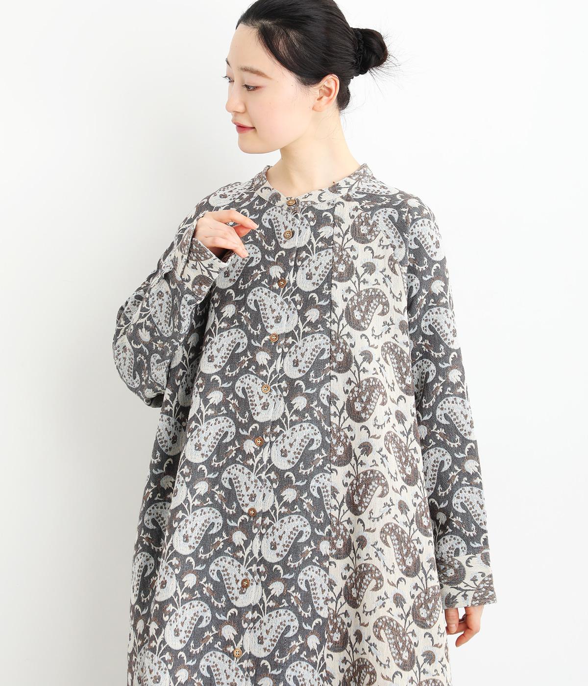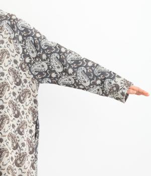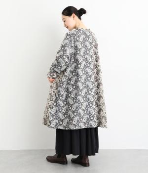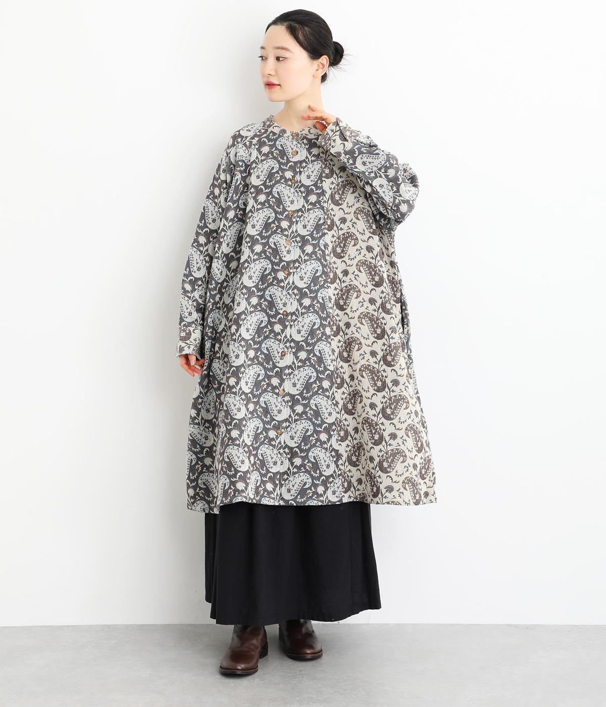 上品なペイズリー柄をたっぷりと使い、ゆるやかなラインで仕立てました。異なる色の生地でさりげなく施した切り替えが、着こなしに奥行きをつくります。小さめの木ボタンがアクセントになり、ナチュラルな装いとも相性ばつぐんです。