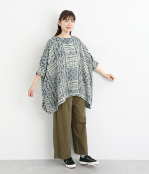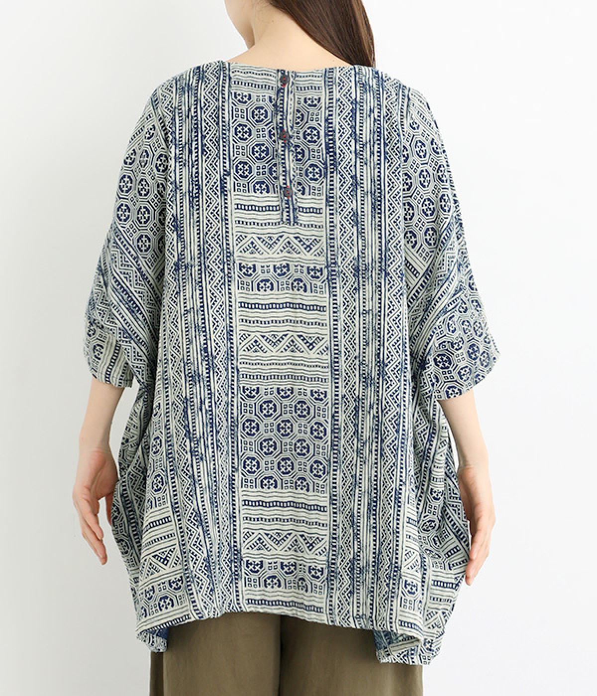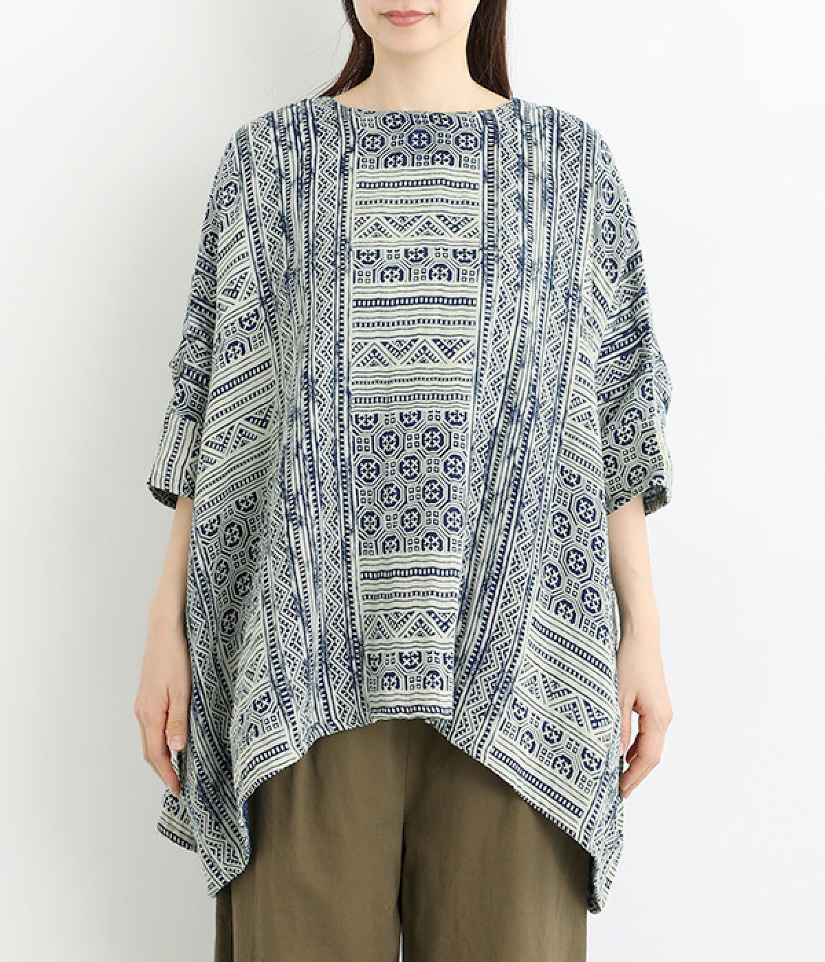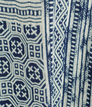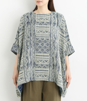 ふっくらやわらかなコットンダブルガーゼ仕立て。東南アジア山岳地域に居住する、モン族伝統の藍染プリントを施しました。染めの濃淡や滲みが、味わい深い表情を見せます。