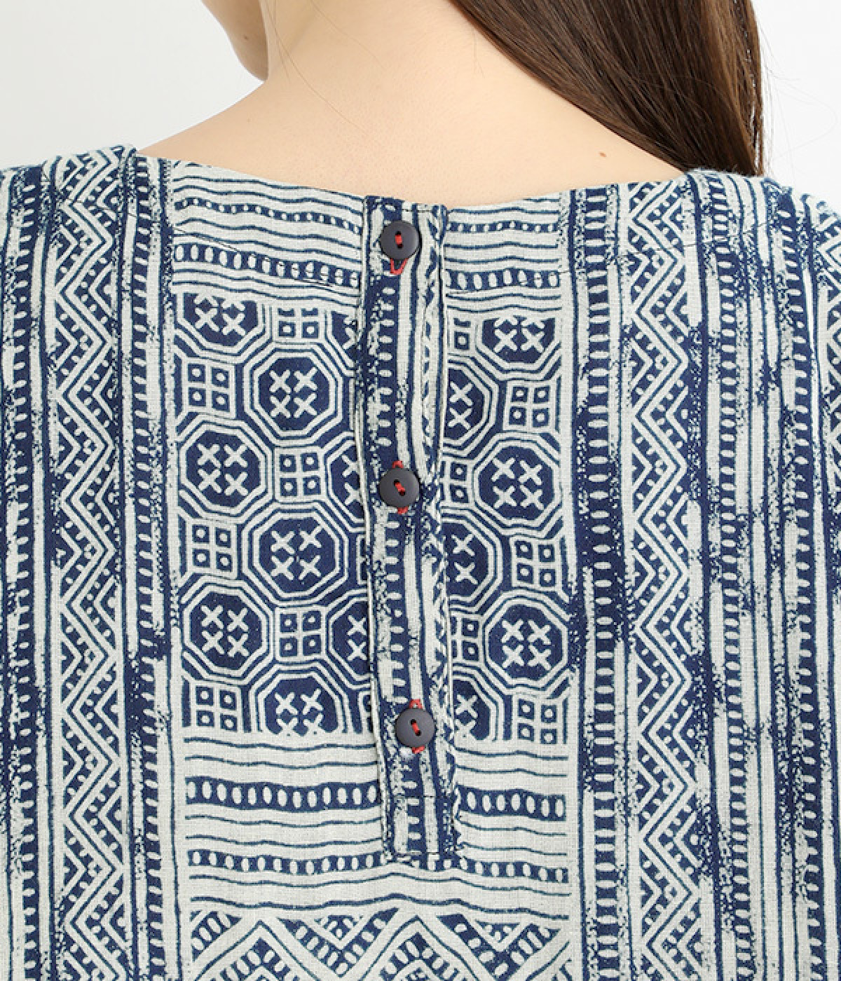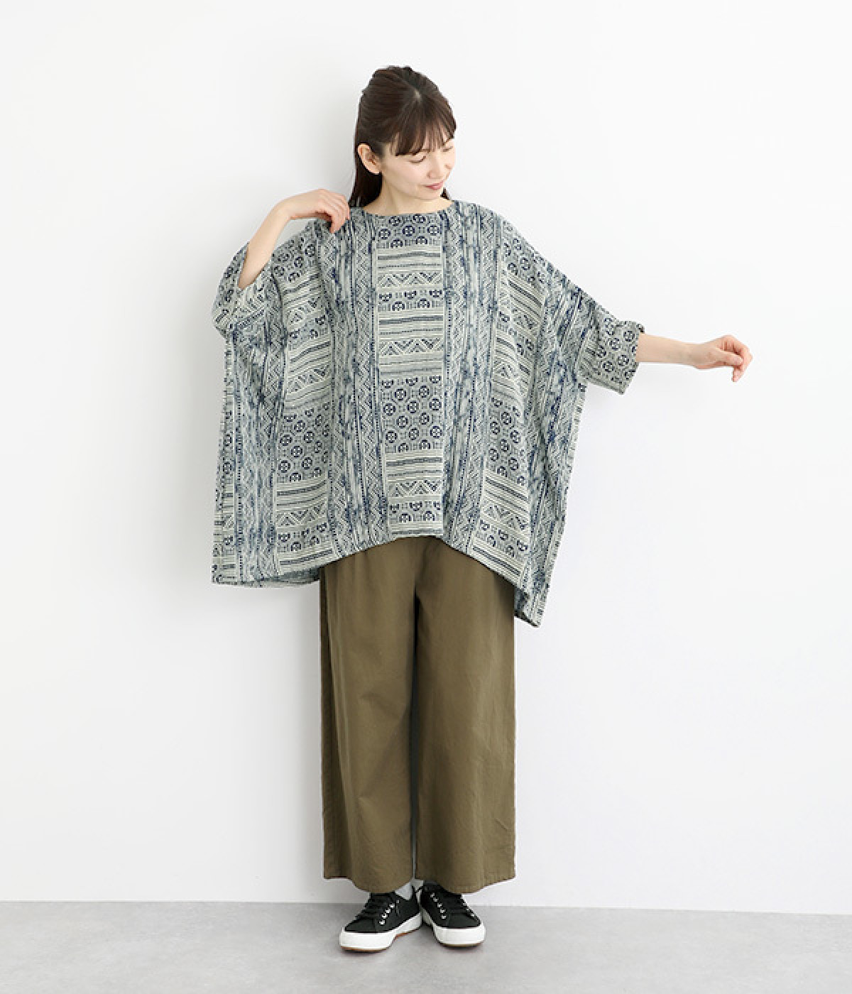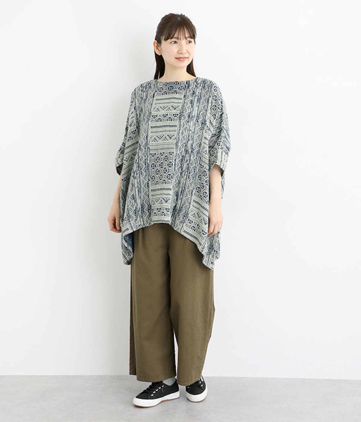 ふっくらやわらかなコットンダブルガーゼ仕立て。東南アジア山岳地域に居住する、モン族伝統の藍染プリントを施しました。染めの濃淡や滲みが、味わい深い表情を見せます。