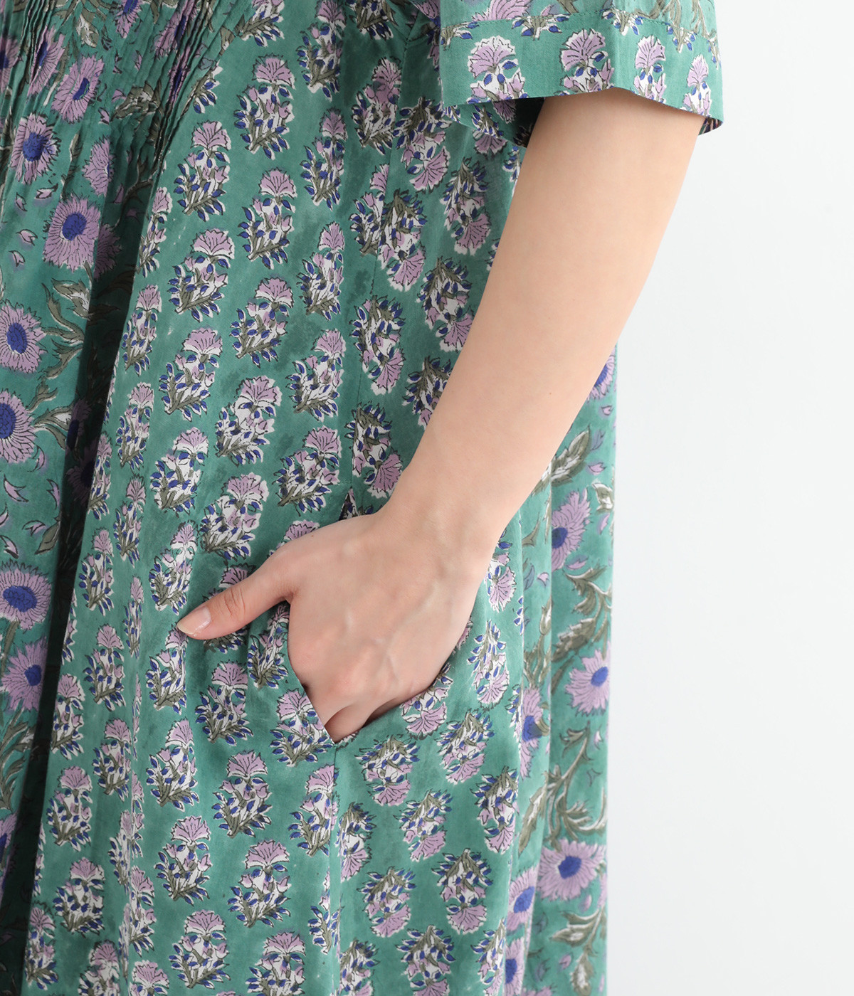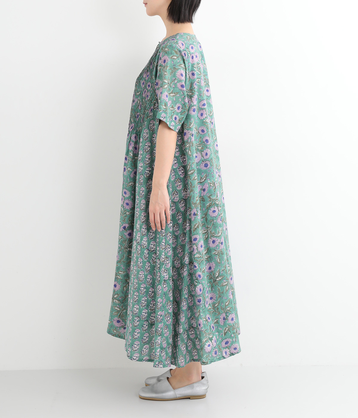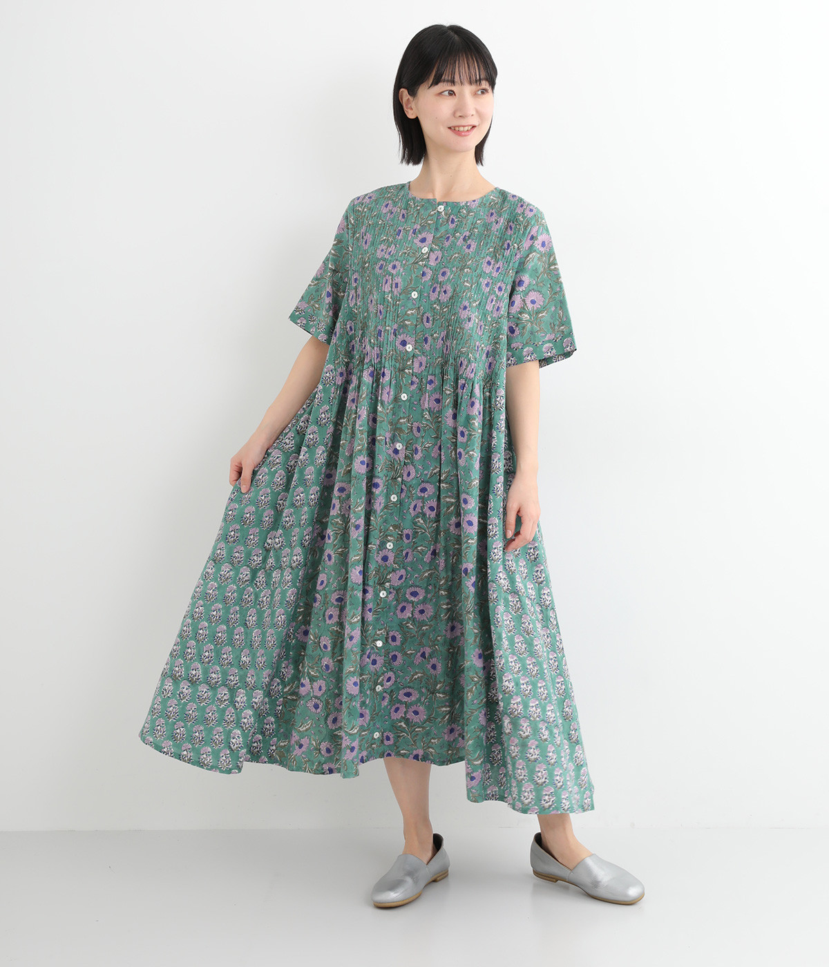 草木をモチーフにした2種類の柄を組み合わせたワンピース。インドのブロックプリントで表現された、手作業のぬくもり溢れる一枚です。繊細なピンタックがニュアンスを加え、表情豊かに。纏うだけで主役になれるアイテムです。