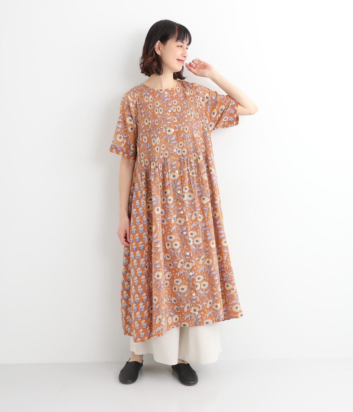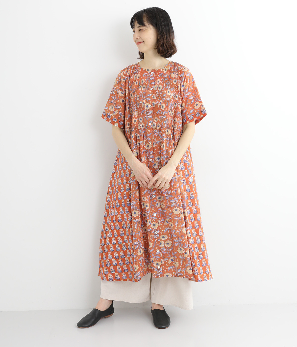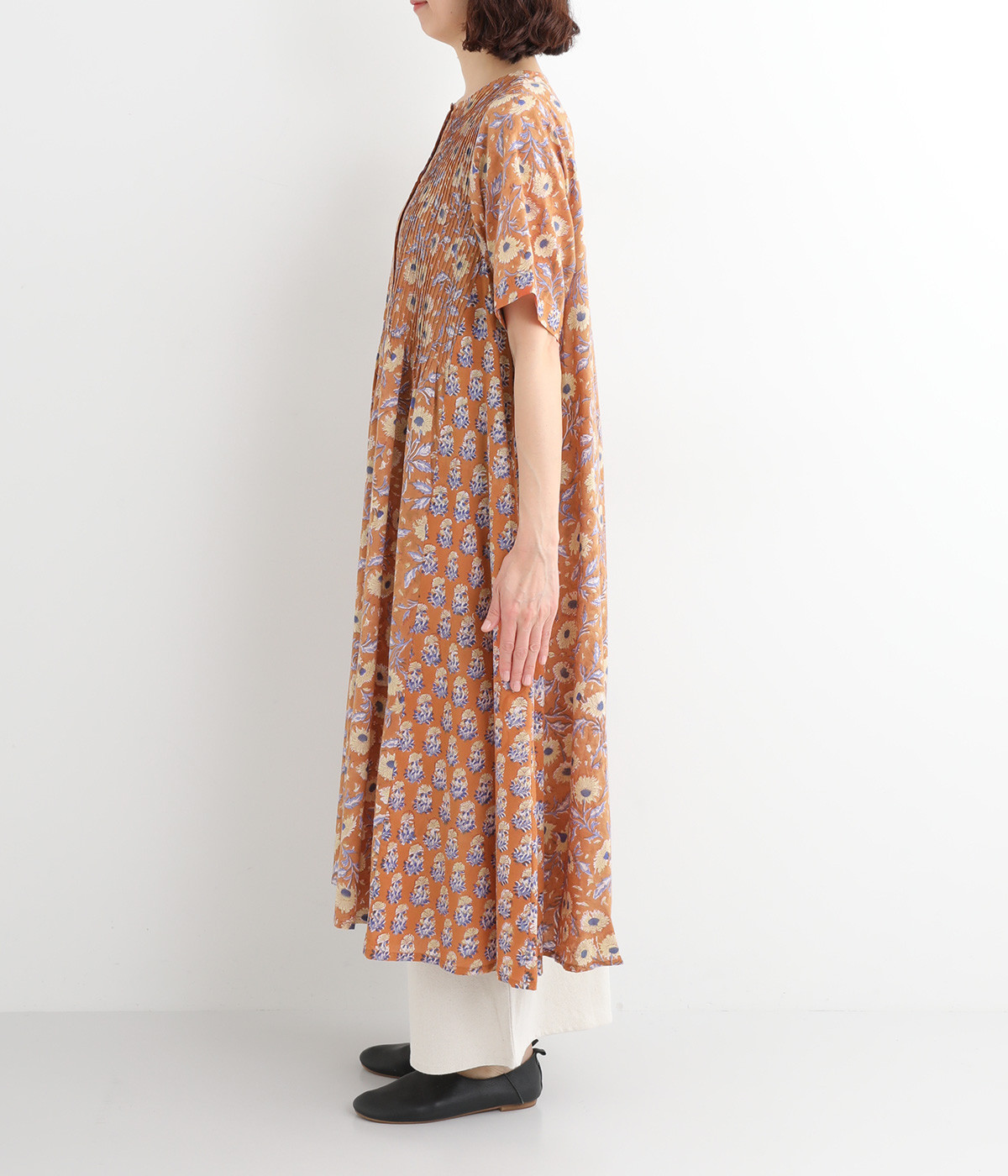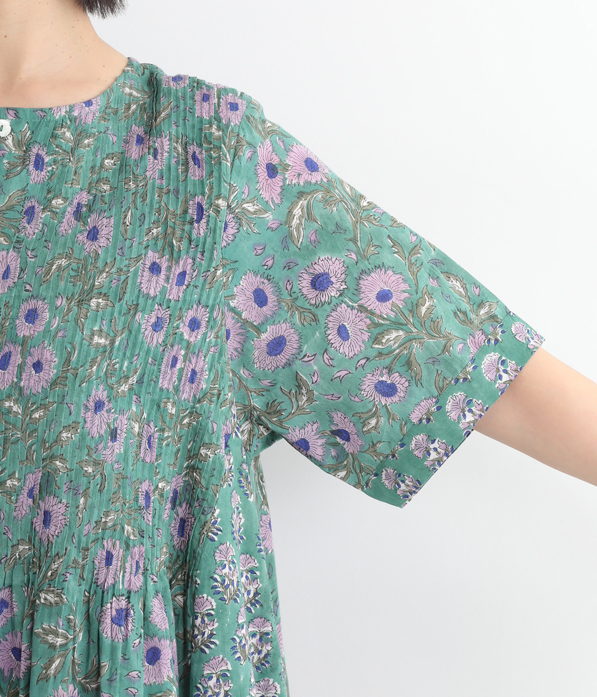 草木をモチーフにした2種類の柄を組み合わせたワンピース。インドのブロックプリントで表現された、手作業のぬくもり溢れる一枚です。繊細なピンタックがニュアンスを加え、表情豊かに。纏うだけで主役になれるアイテムです。