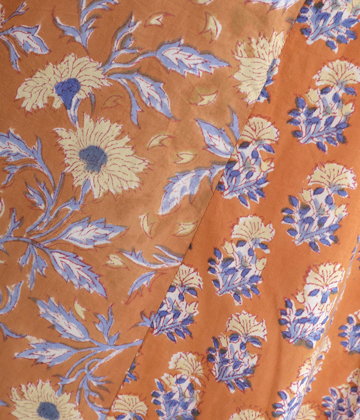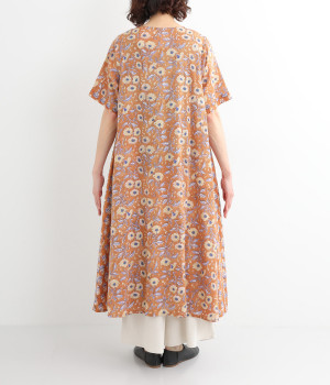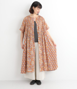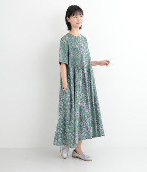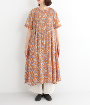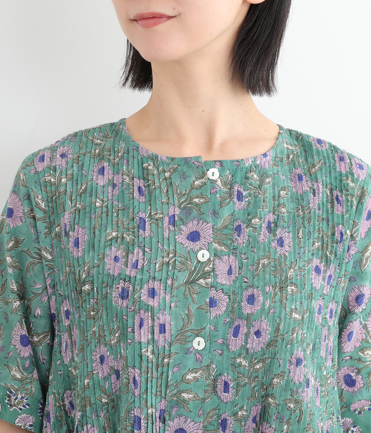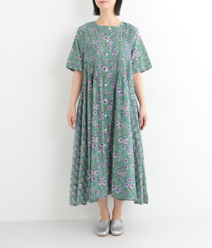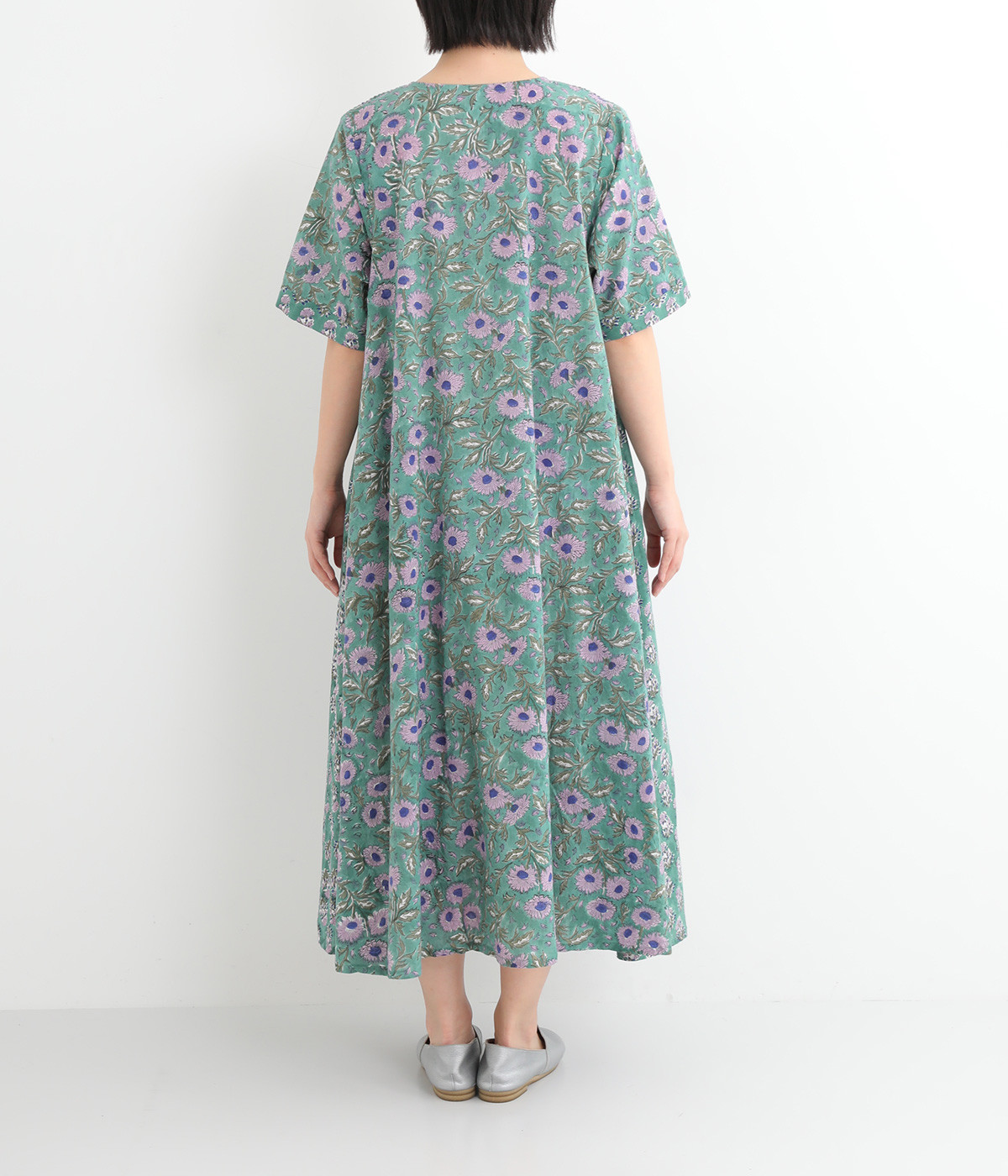 草木をモチーフにした2種類の柄を組み合わせたワンピース。インドのブロックプリントで表現された、手作業のぬくもり溢れる一枚です。繊細なピンタックがニュアンスを加え、表情豊かに。纏うだけで主役になれるアイテムです。