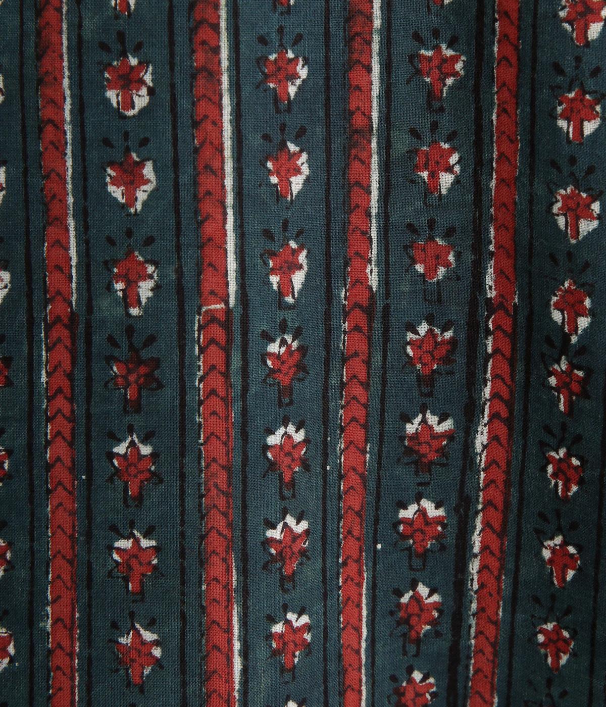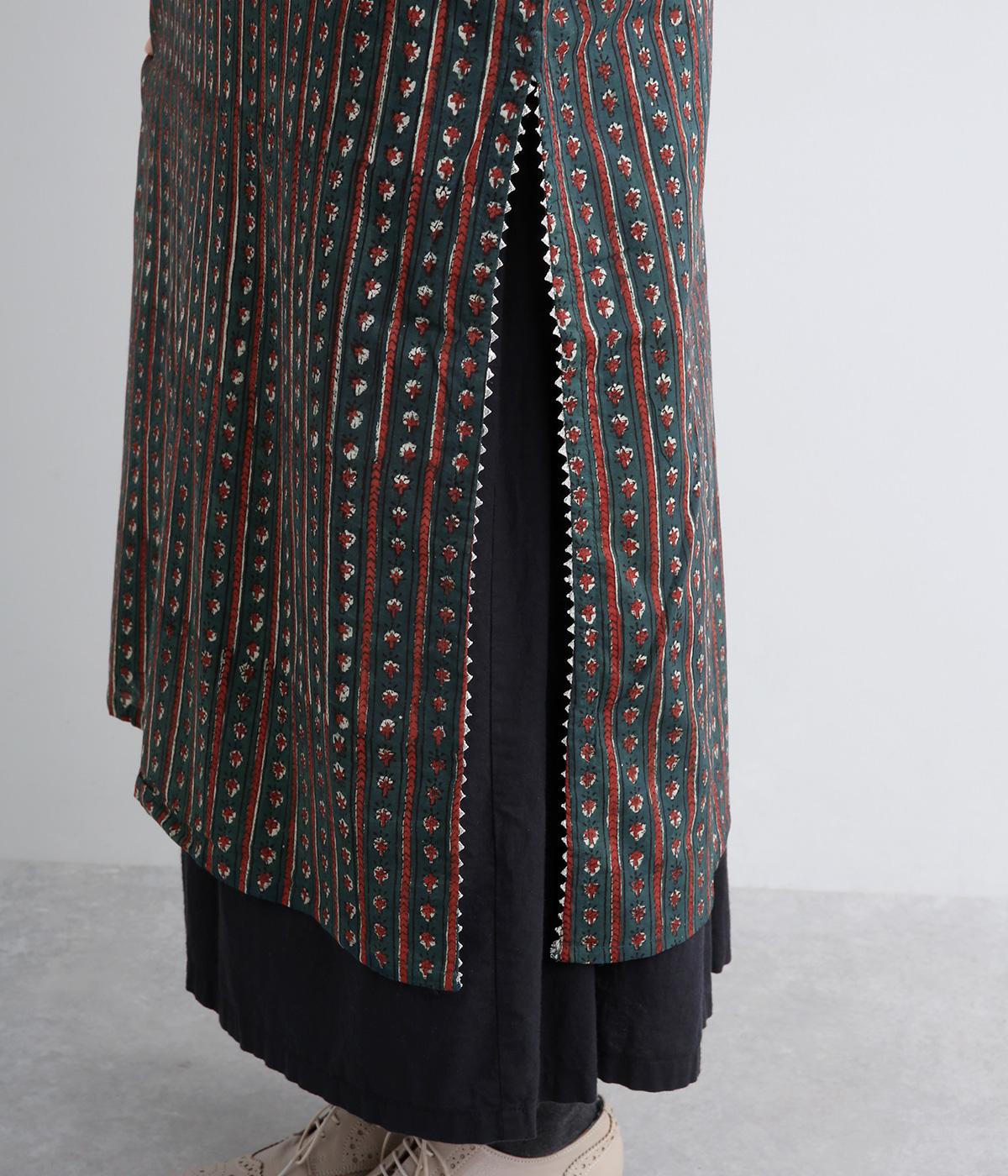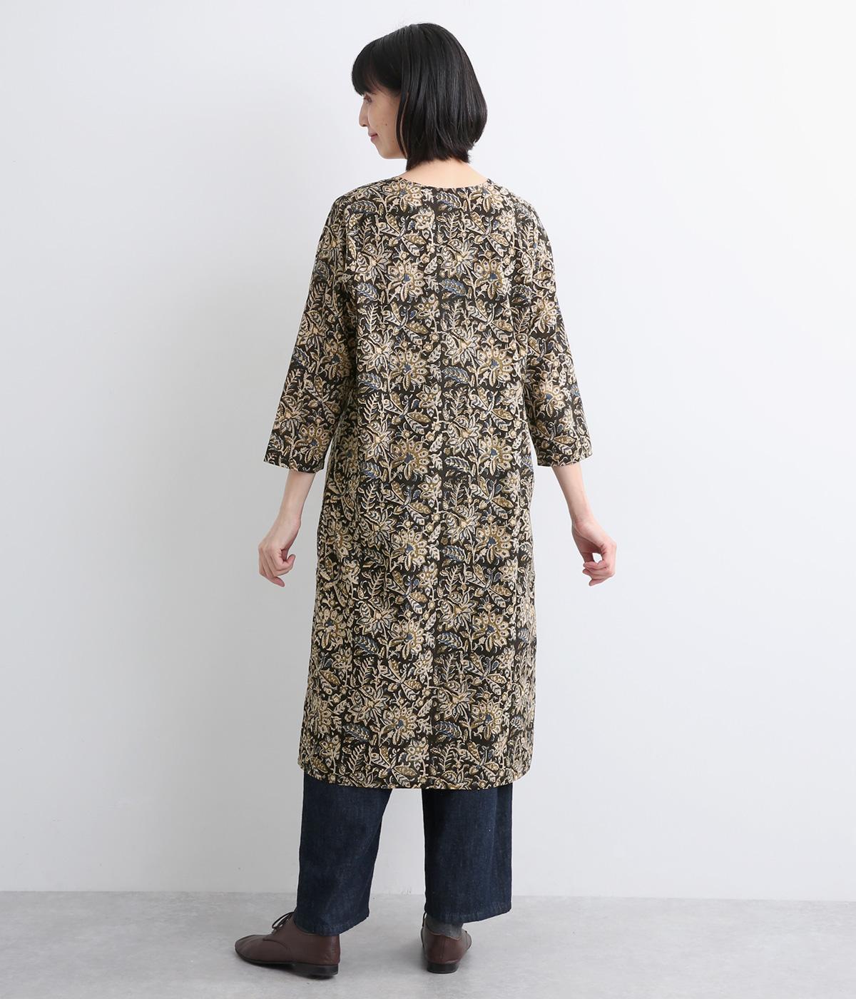 インド伝統の手紡ぎ、手織りのカディ生地で仕立てました。さらっとした肌ざわりのよさが魅力的。プリントは一版一色ずつ押して柄を作っていくインド伝統のブロックプリントを採用しています。