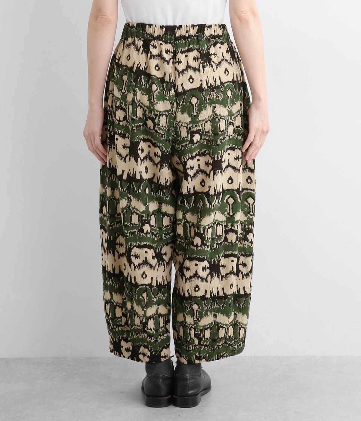 トラディショナルな雰囲気ただよう、イカット柄が印象的なパンツです。裾にダーツをあしらった、ゆったりシルエットでストレスフリーなはき心地。ウエストはお腹に心地よくフィットする総ゴム仕様です。