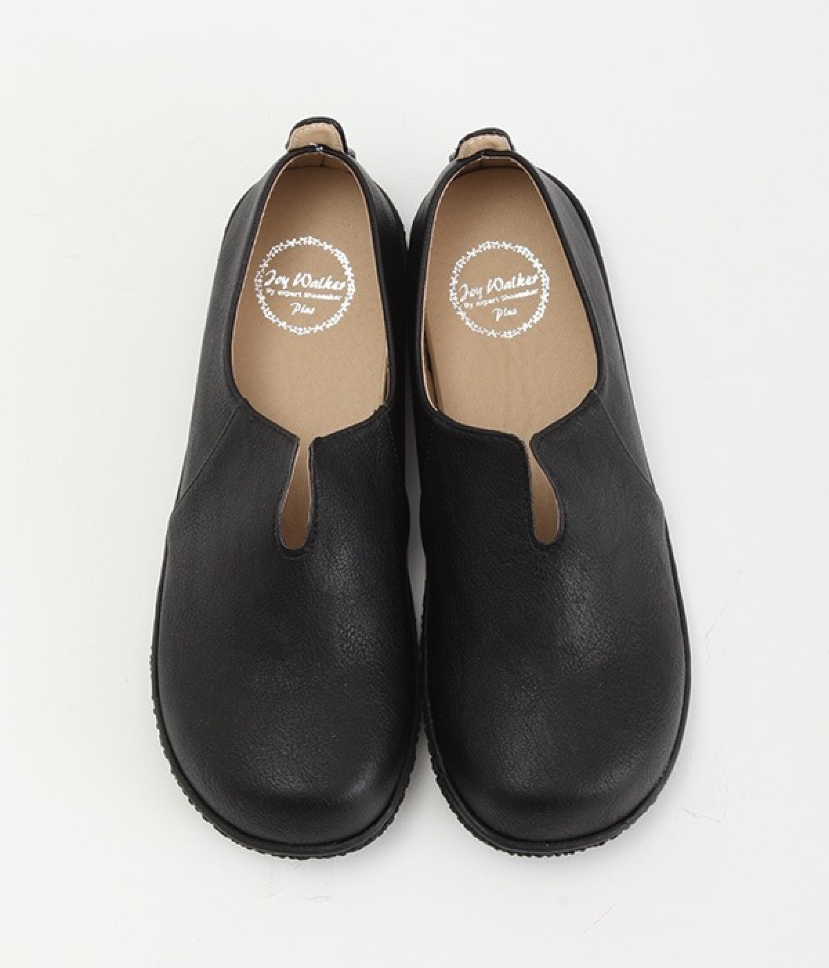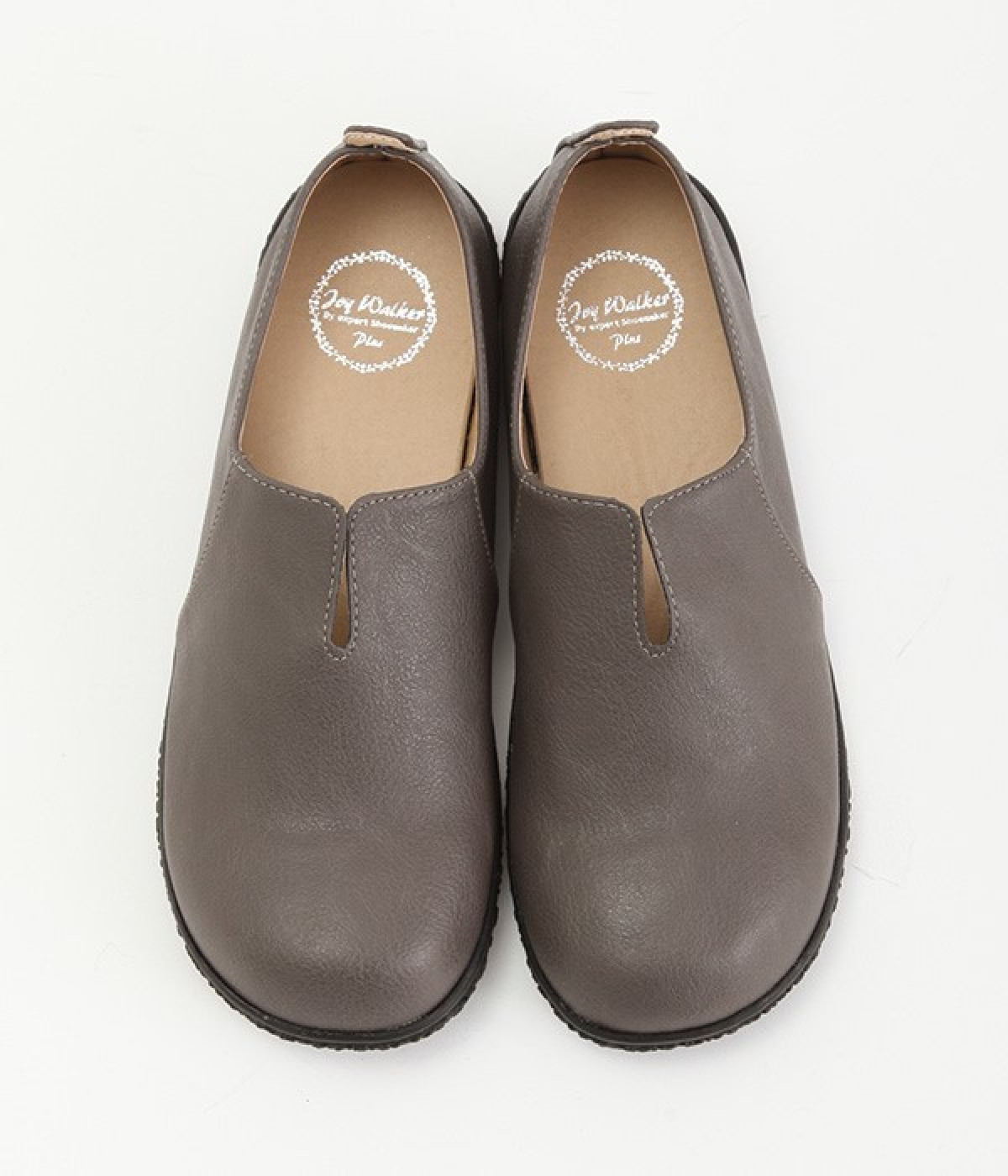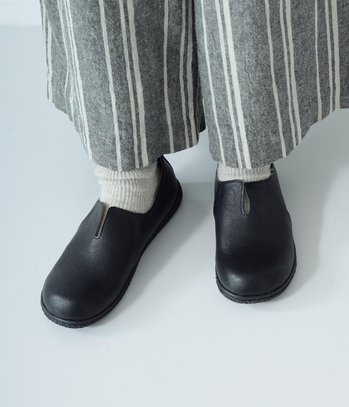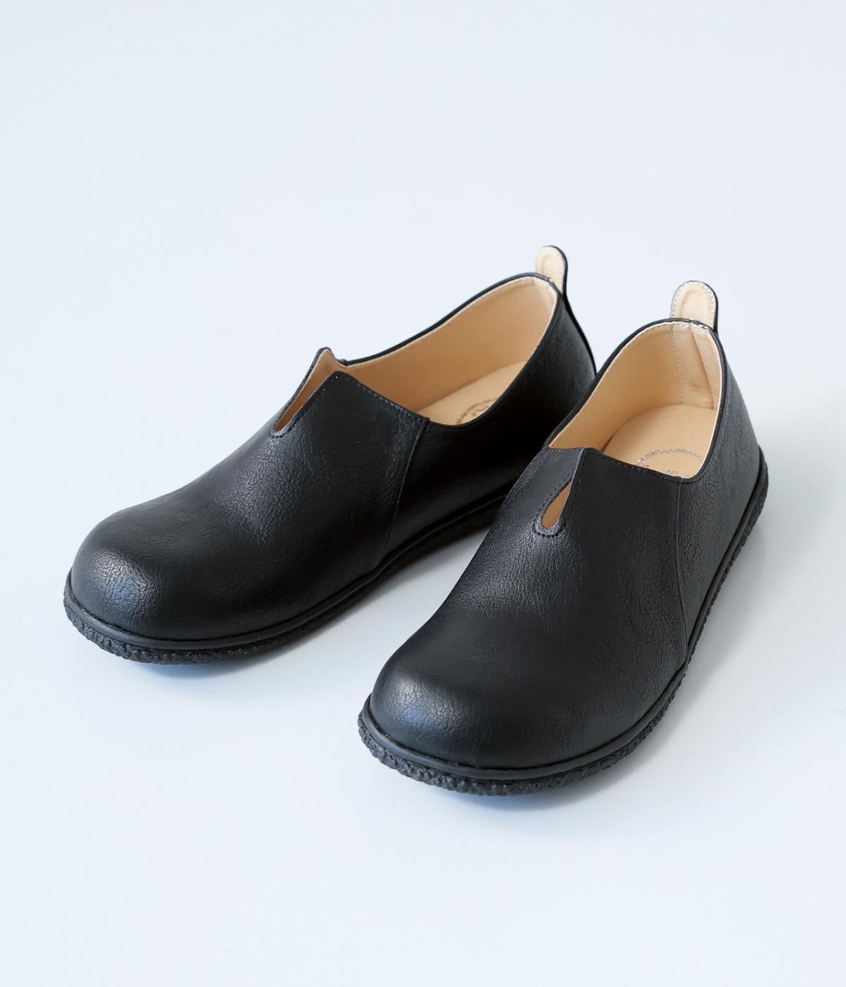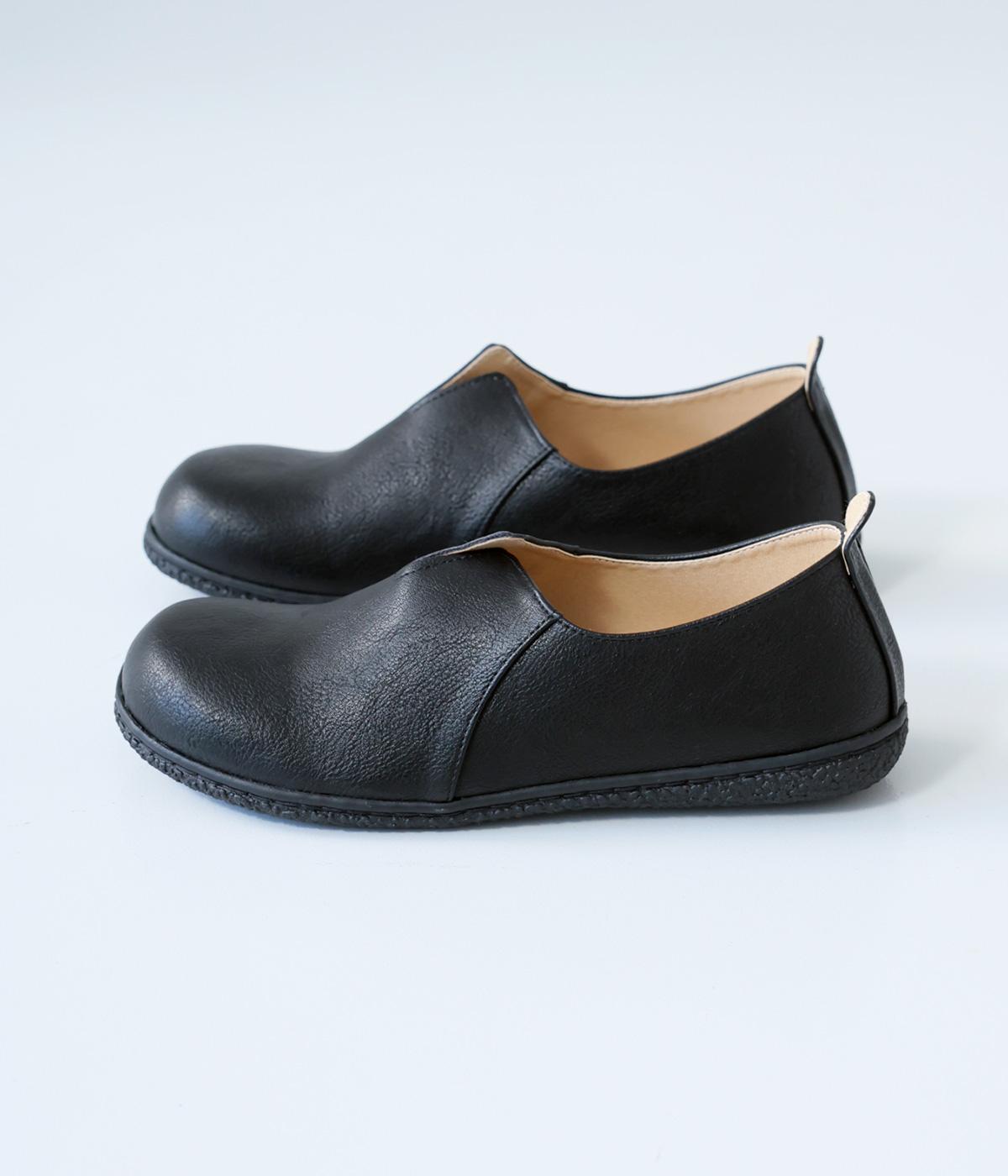 甲のVカットをアクセントにした、脱ぎ履き簡単なスリッポンシューズです。丸みのあるフォルムと無駄のないシンプルなデザインが上品で女性らしい足元を演出。カジュアルにもきれいめにも合わせやすく、さまざまなシーンで重宝します。