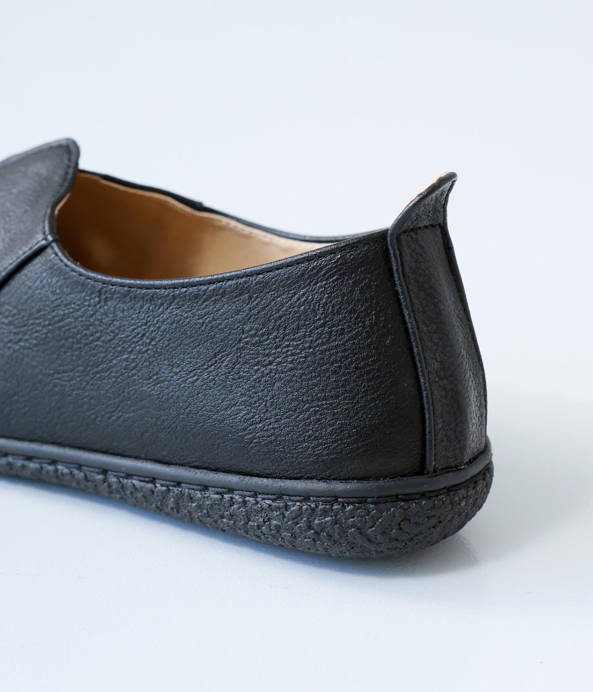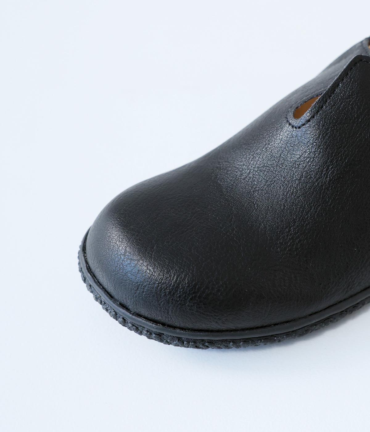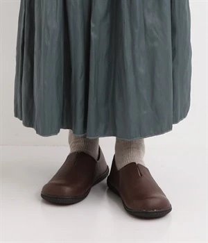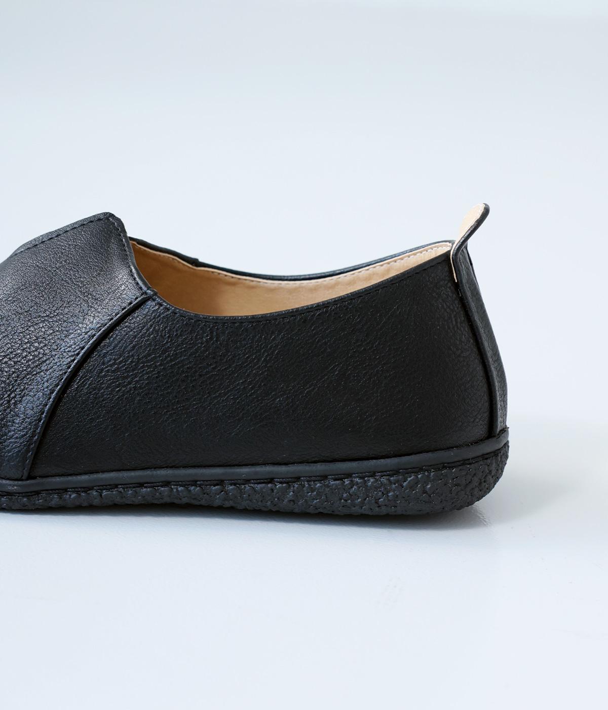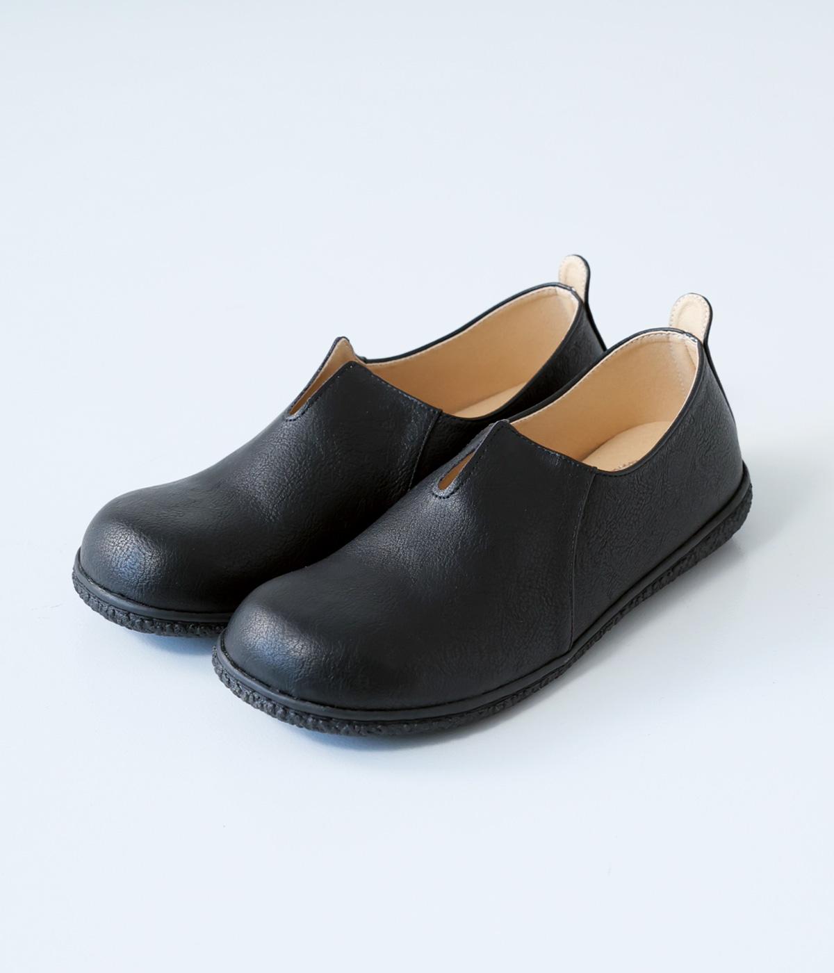 表面に細かなシボがあり、リアルレザーのような上品な見た目が魅力の合成皮革です。足の動きに合わせてやわらかくしなるので、歩きやすさも抜群。クッション性のあるインソールを使用しています。