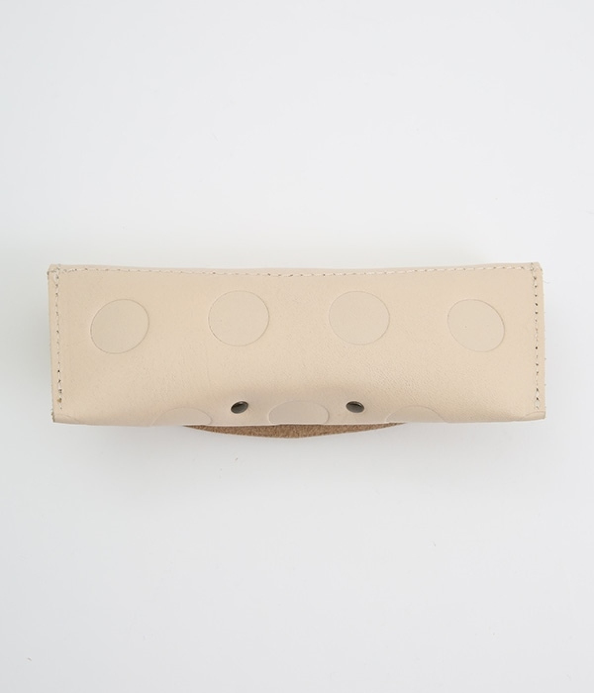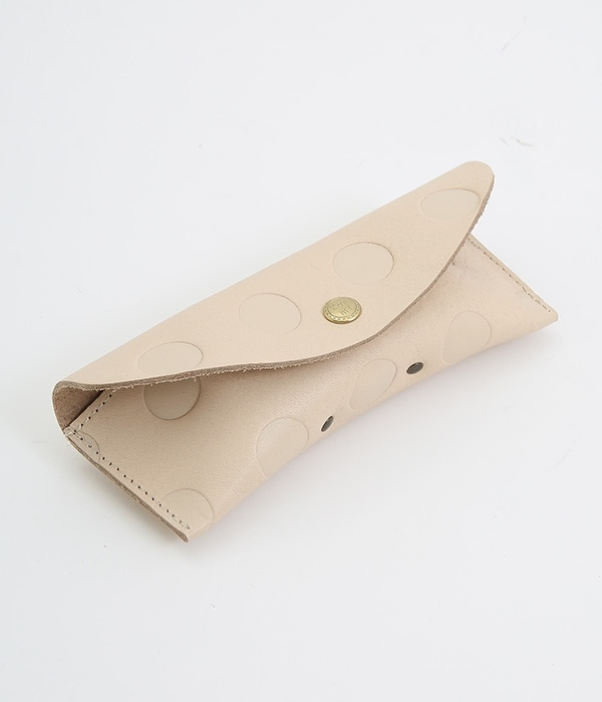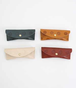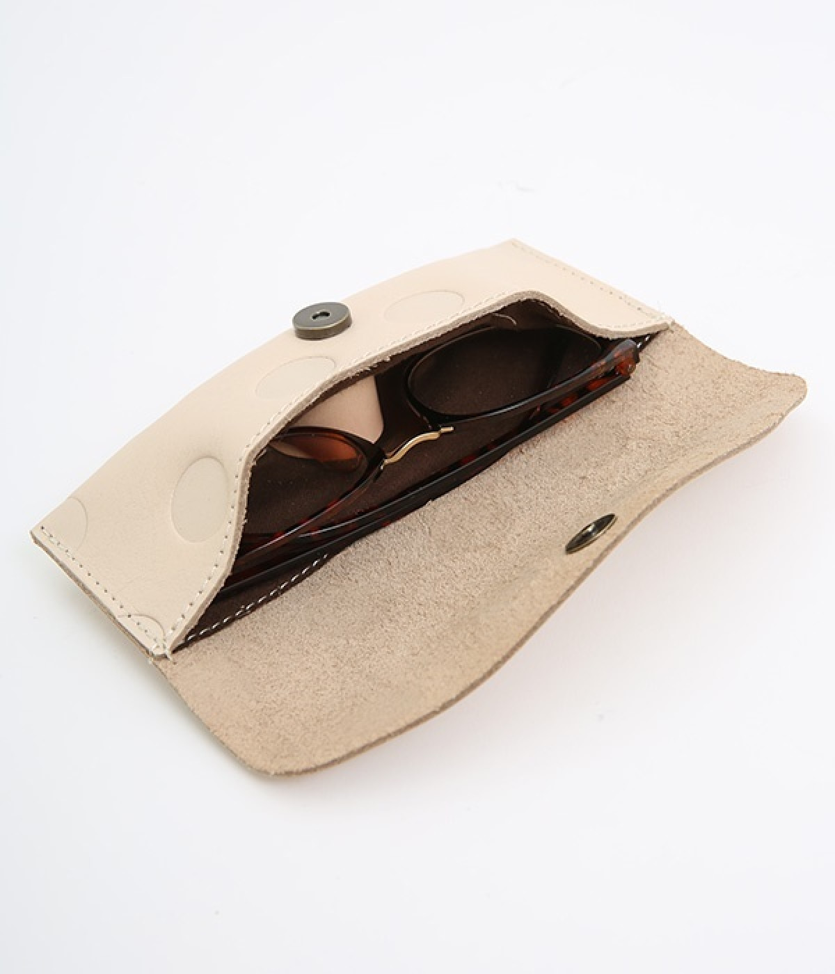 ドットがアクセントの上質な牛革を使用したメガネケースです。メガネをしっかりと守りながらも、かわいさも忘れない四角いシルエット。中の分厚いヌメ革の鼻当て部分にメガネをのせれば動きにくくなり、しっかりと安定して型崩れを防いでくれます。華奢なフレームでも安心のタフさがポイント。内側はやわらかな起毛素材で、大切なメガネをやさしく包み込みます。ボタンはマグネット式で、開け閉めもスムーズ。持ち運びにはもちろん、オフィスや読書机に置いてもサマになるレザーの豊かな表情も魅力です。実用性とデザインを兼ね備えた、生活を彩るアイテムです。