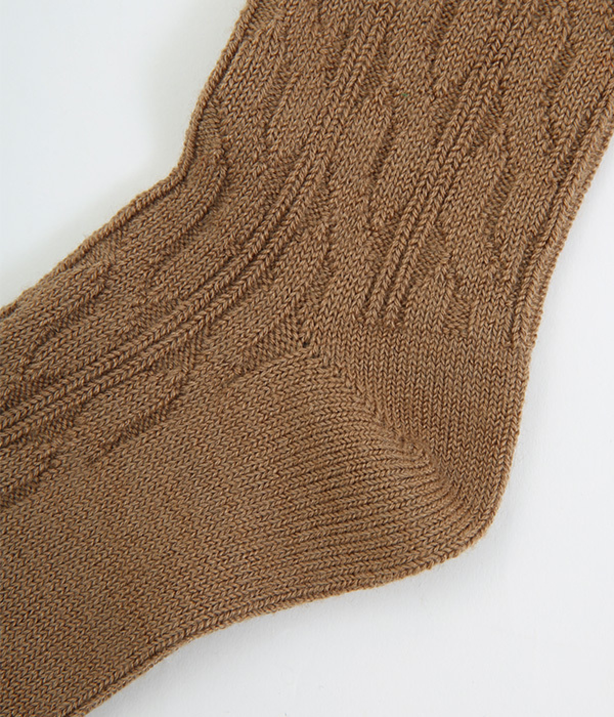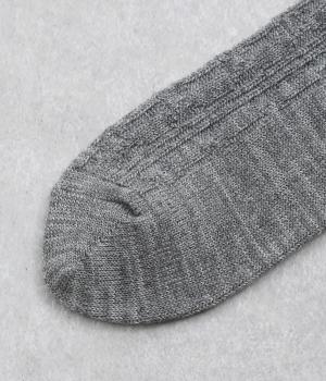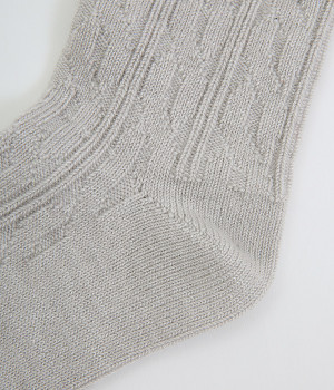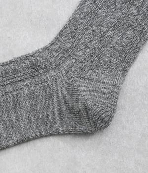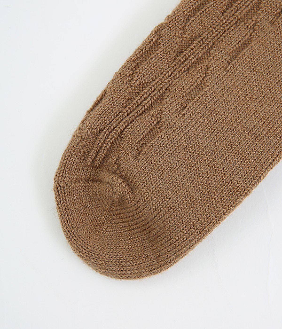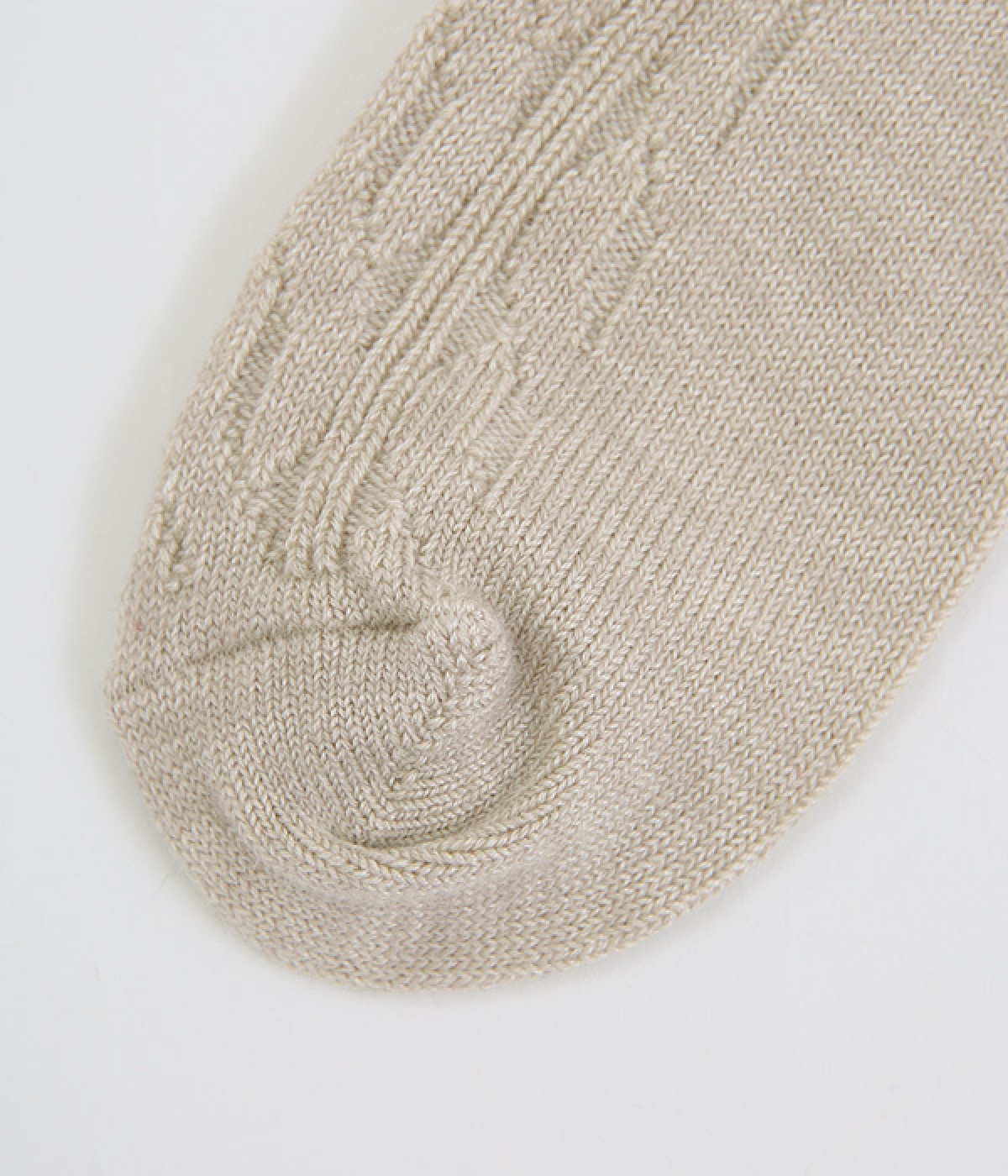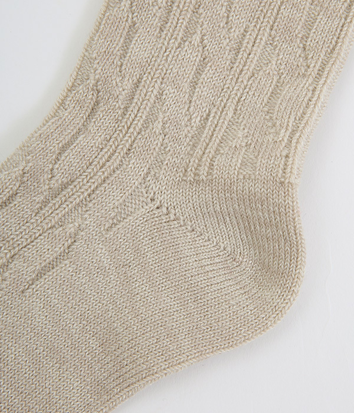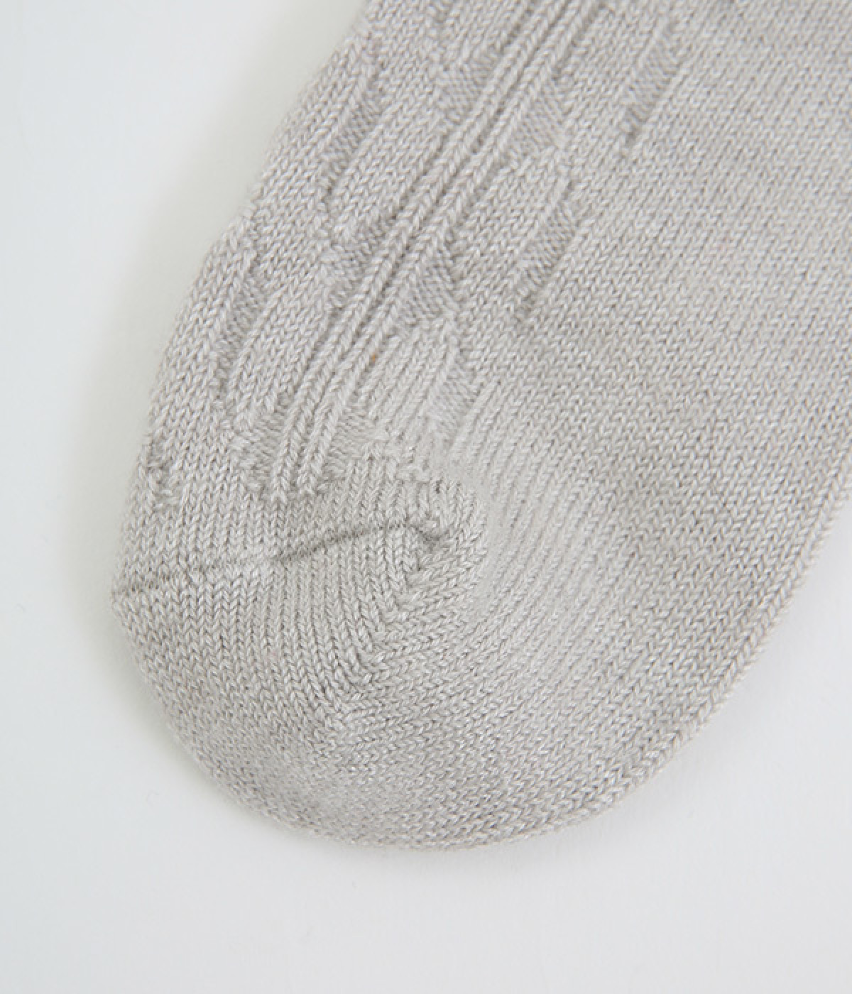チクチクしにくいコットンウールを使用。立体感のあるケーブル編みと繊細なリブの編みを組み合わせ、表情ゆたかに仕上げました。どんなシューズにも合わせやすい、ほどよい厚みもポイントです。