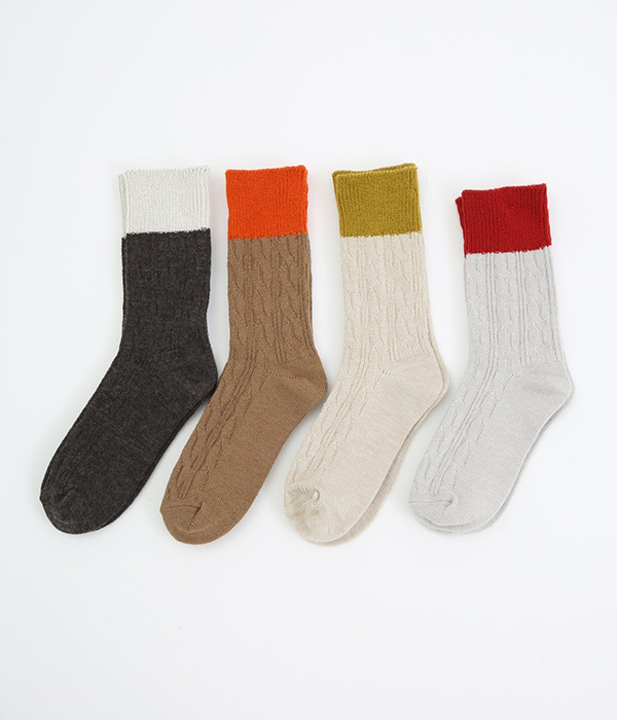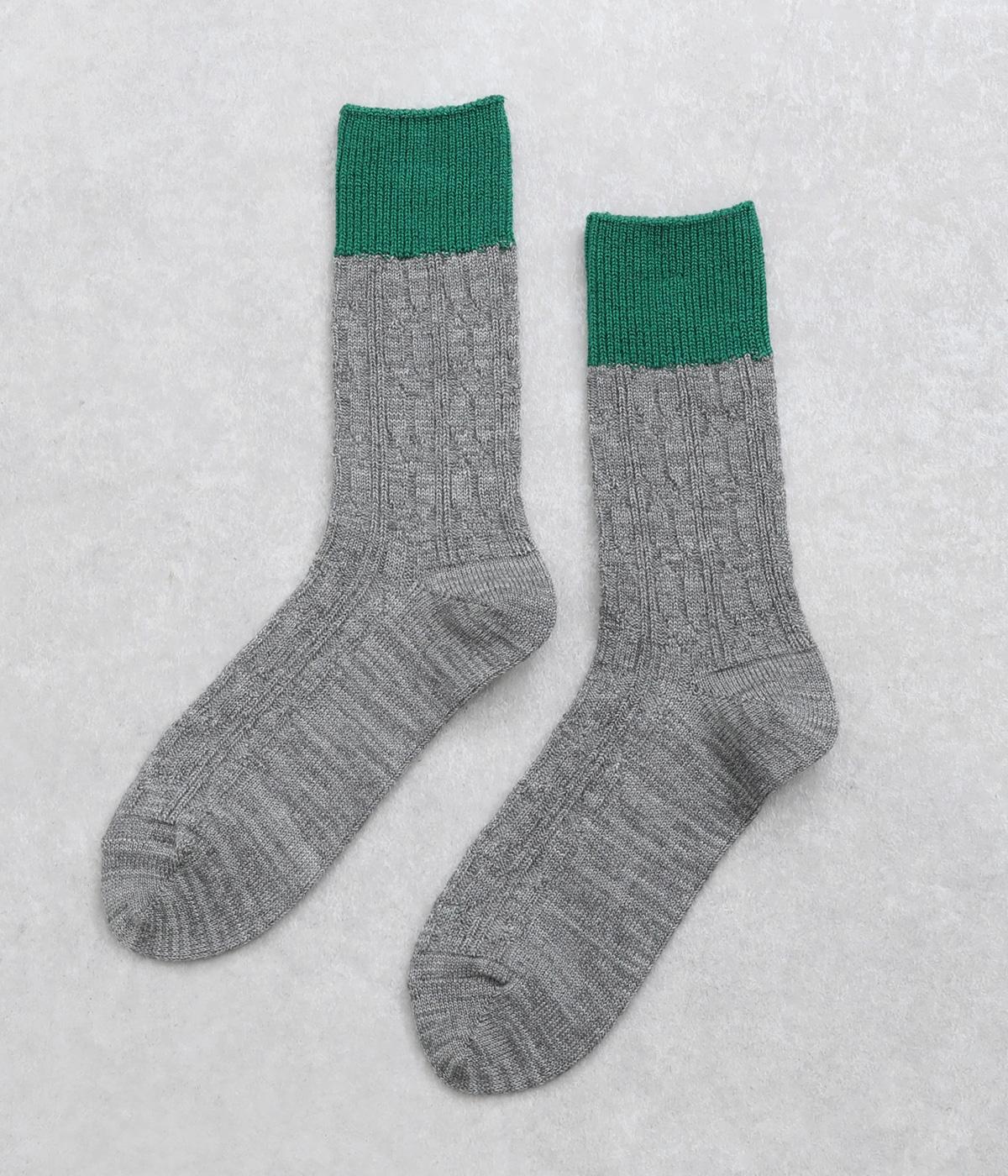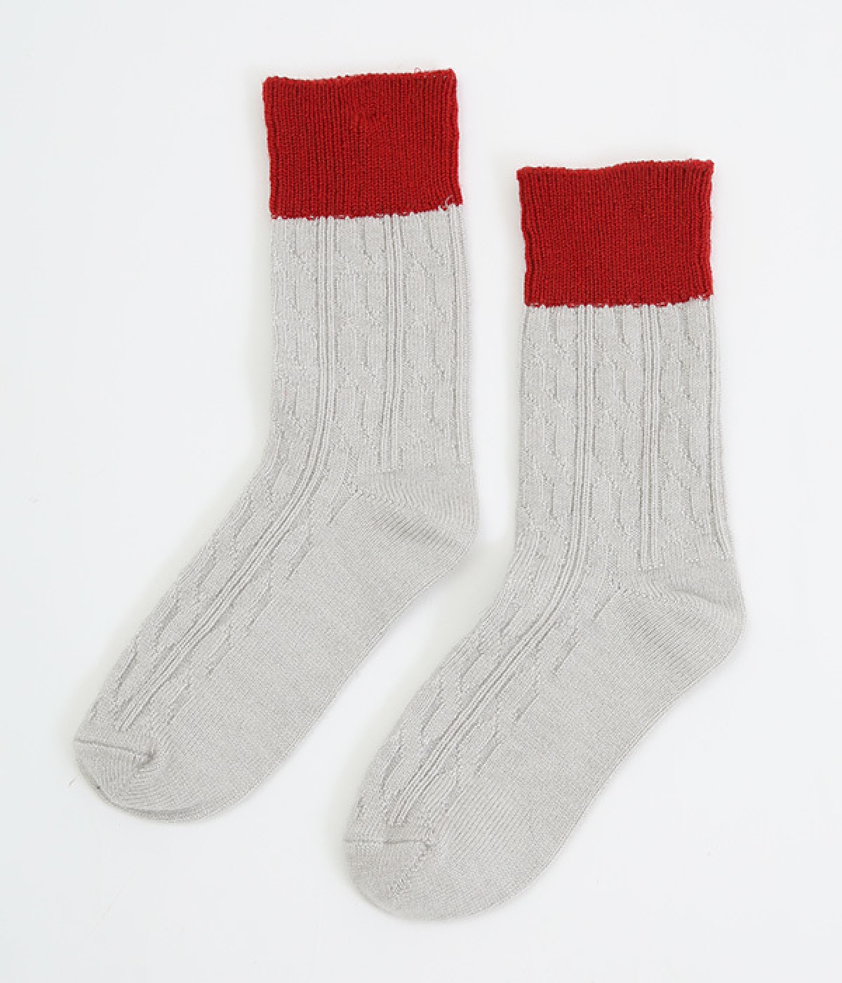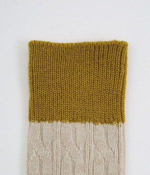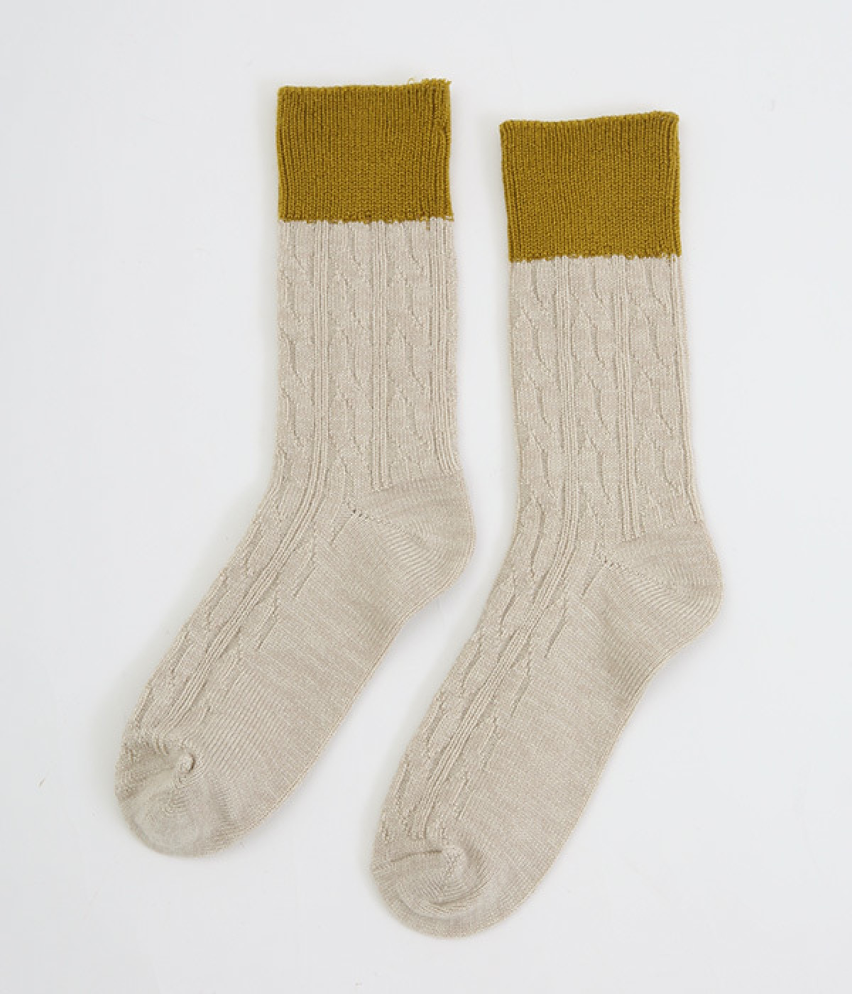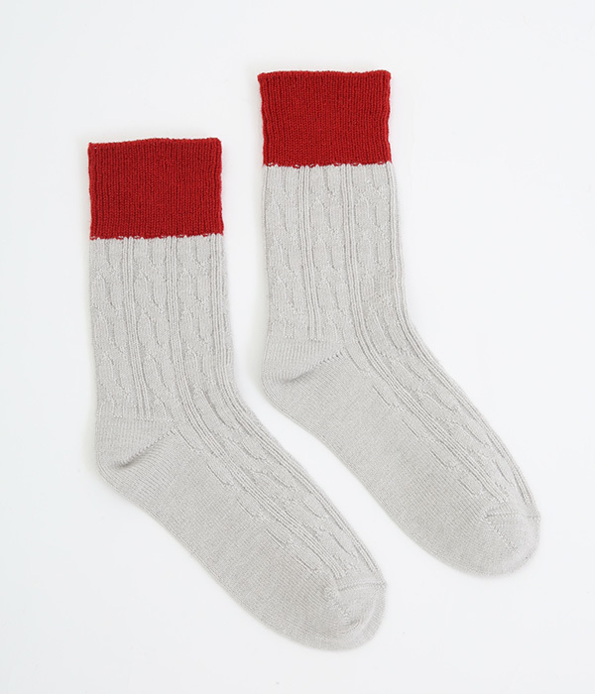 チクチクしにくいコットンウールを使用。立体感のあるケーブル編みと繊細なリブの編みを組み合わせ、表情ゆたかに仕上げました。どんなシューズにも合わせやすい、ほどよい厚みもポイントです。