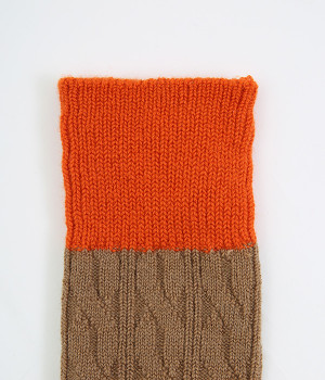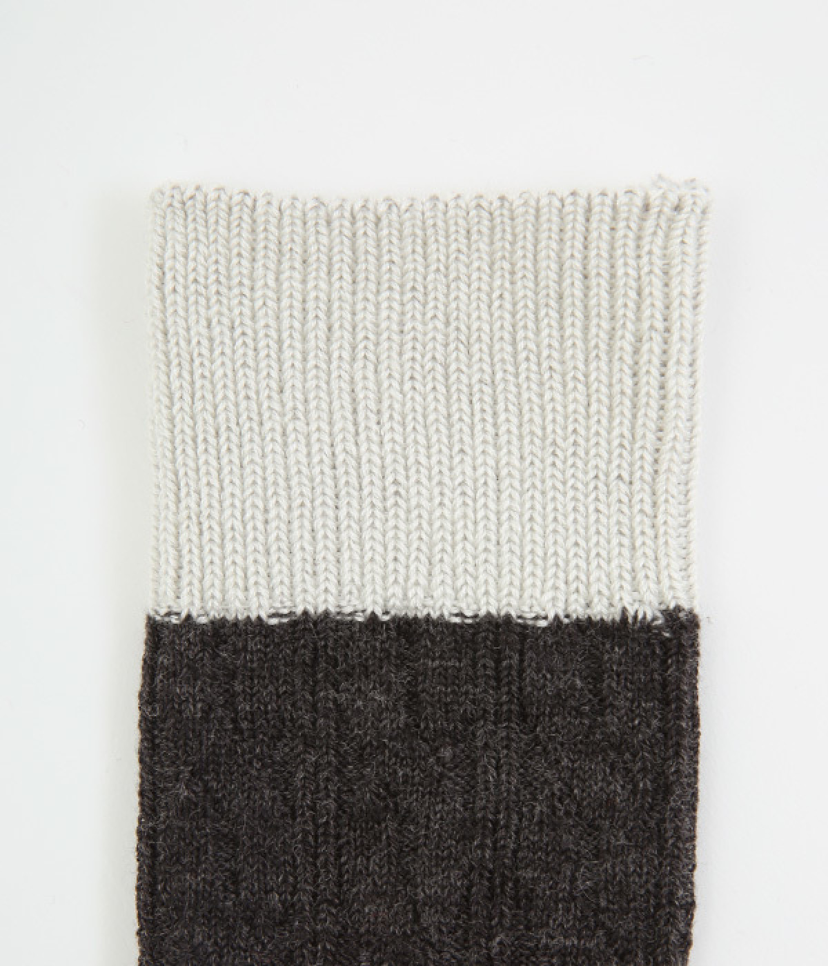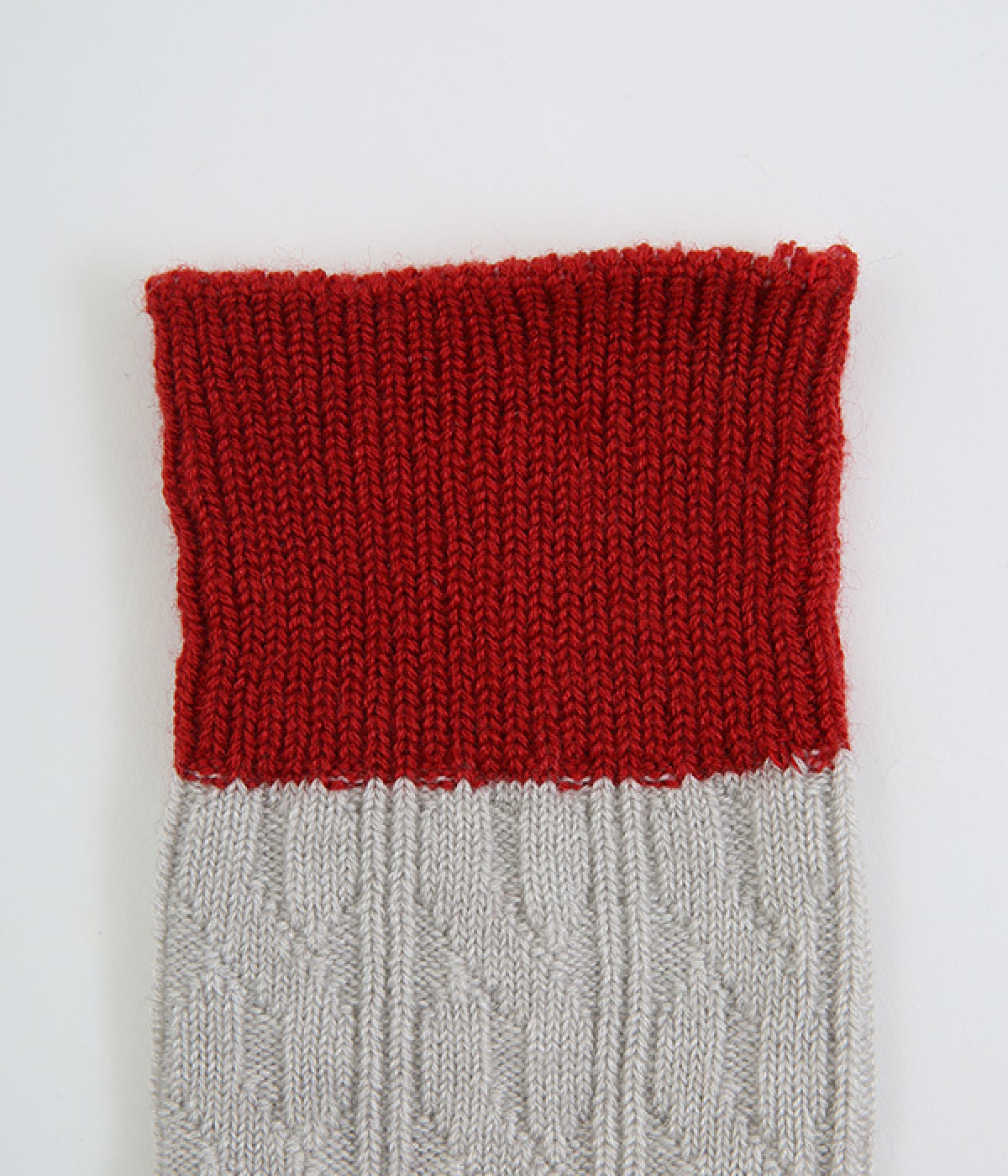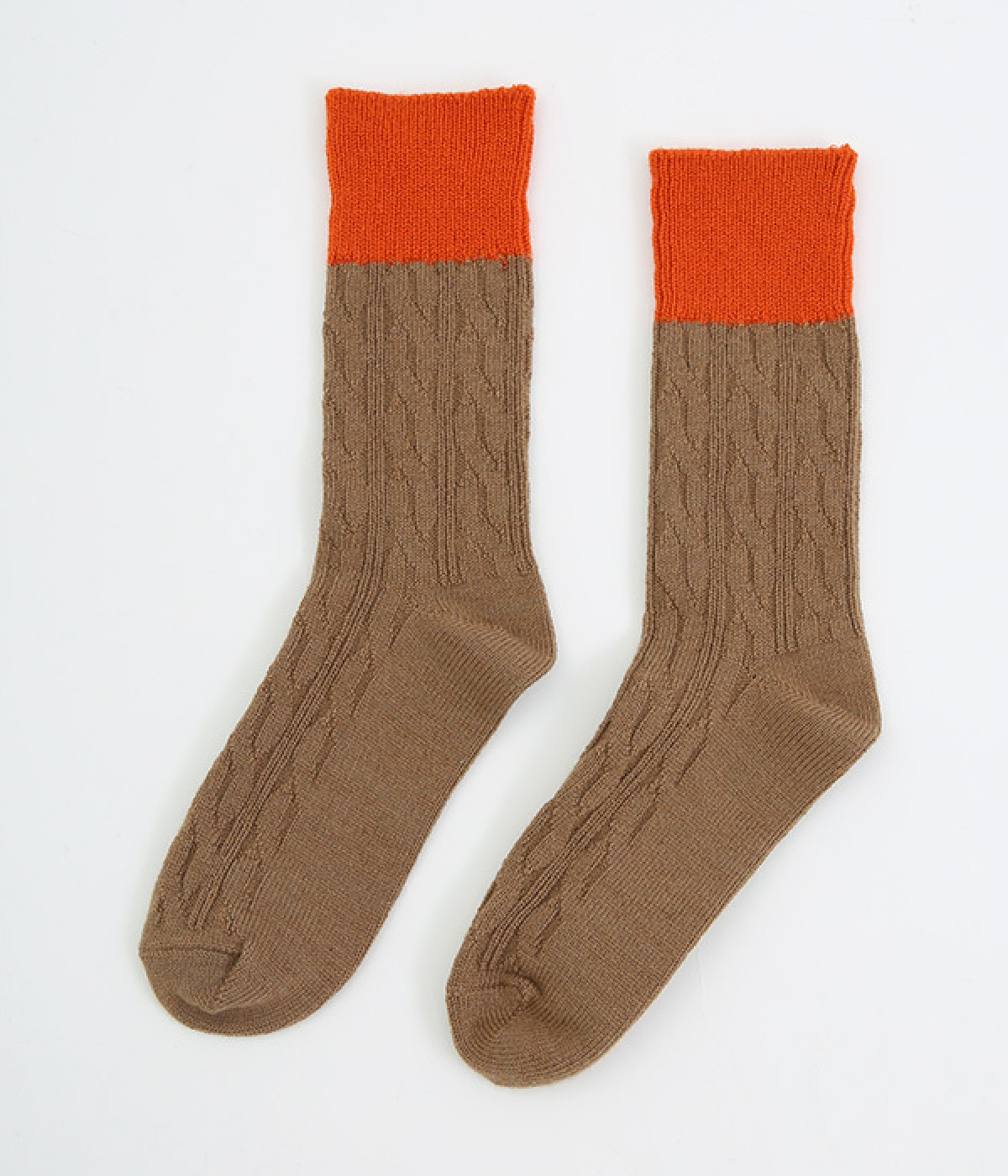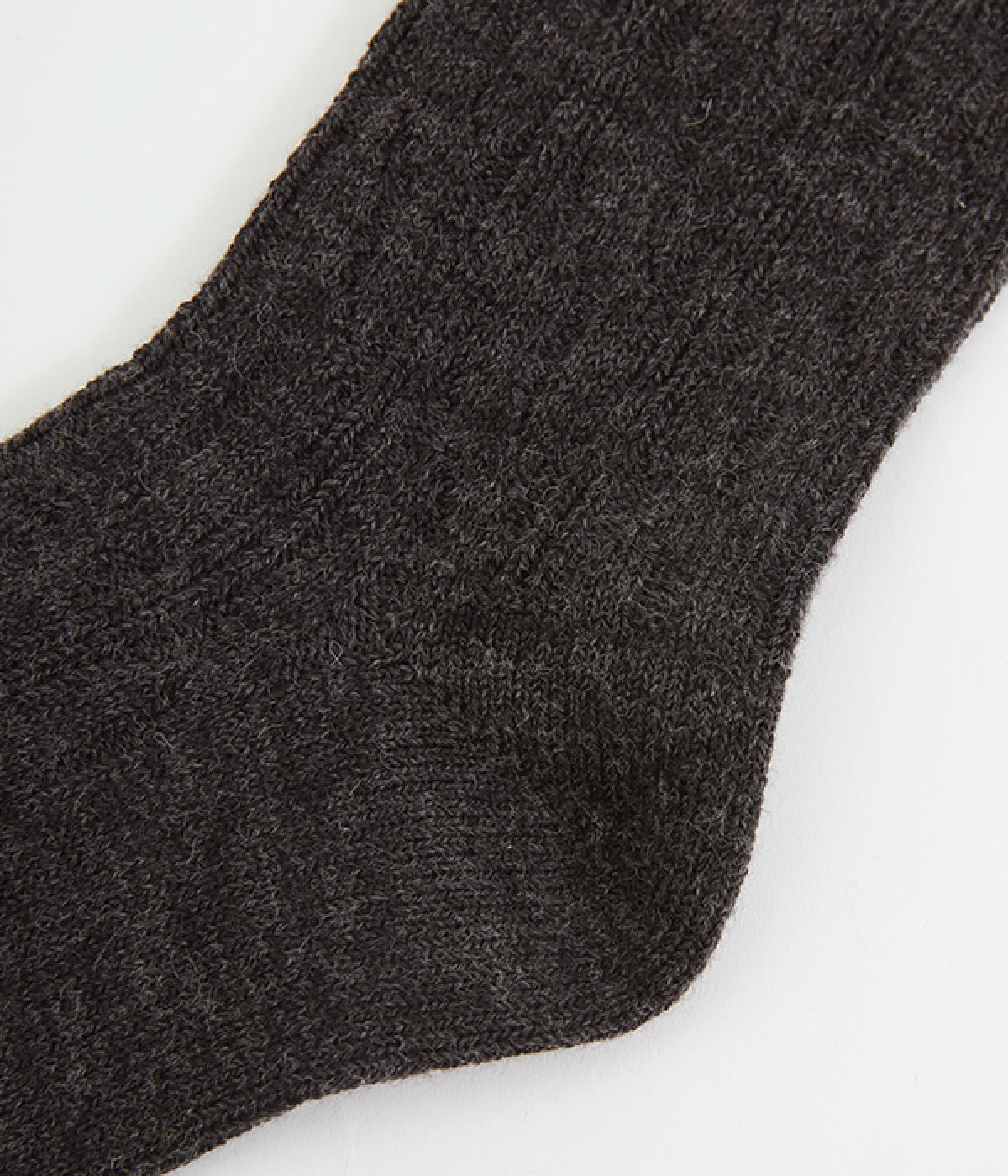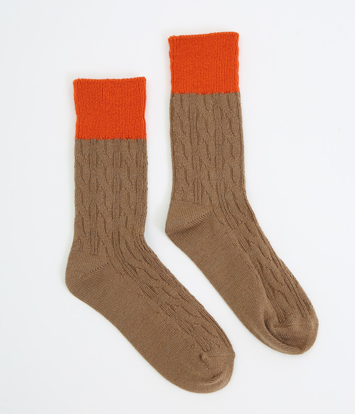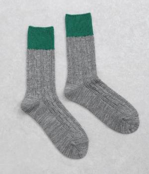 チクチクしにくいコットンウールを使用。立体感のあるケーブル編みと繊細なリブの編みを組み合わせ、表情ゆたかに仕上げました。どんなシューズにも合わせやすい、ほどよい厚みもポイントです。