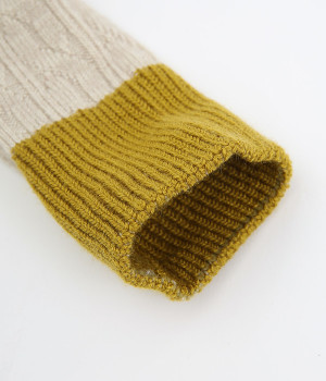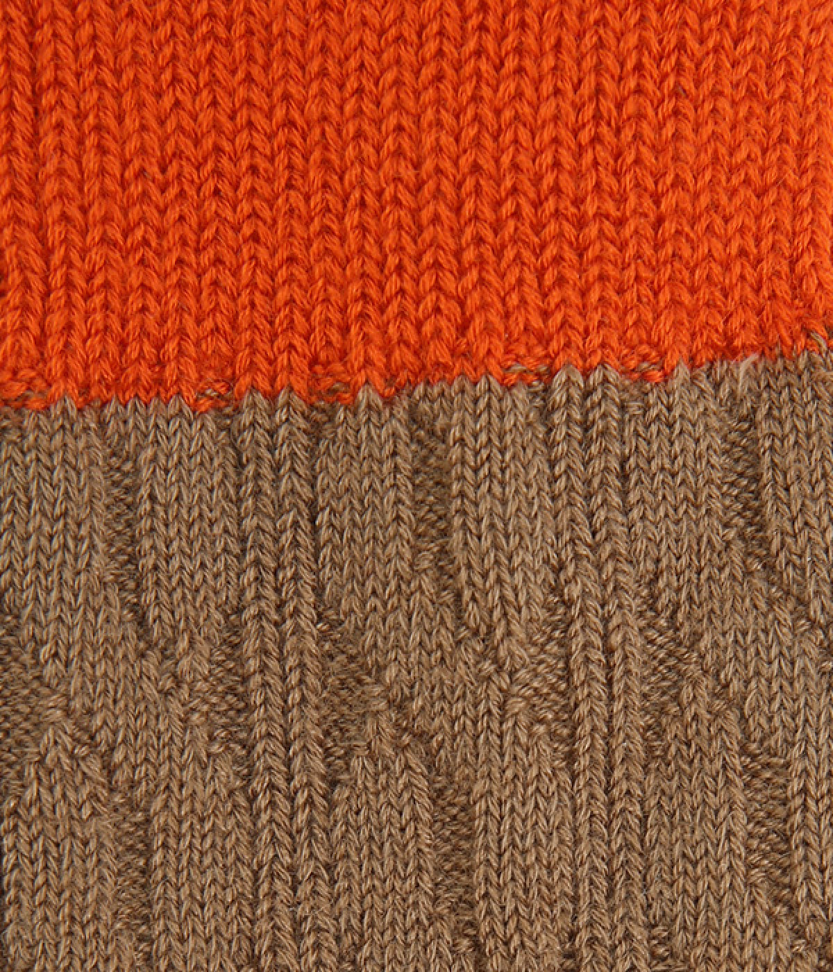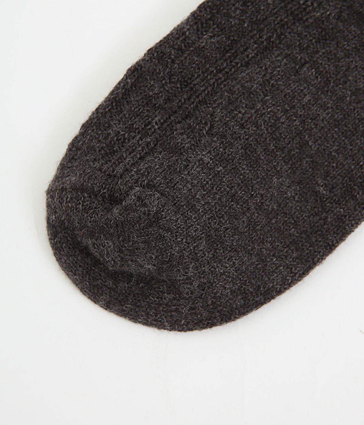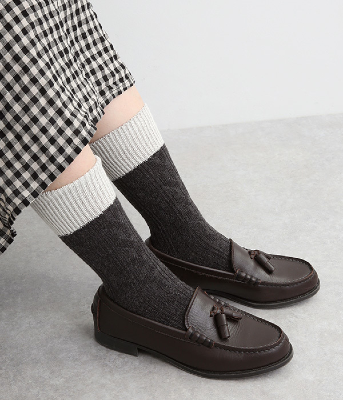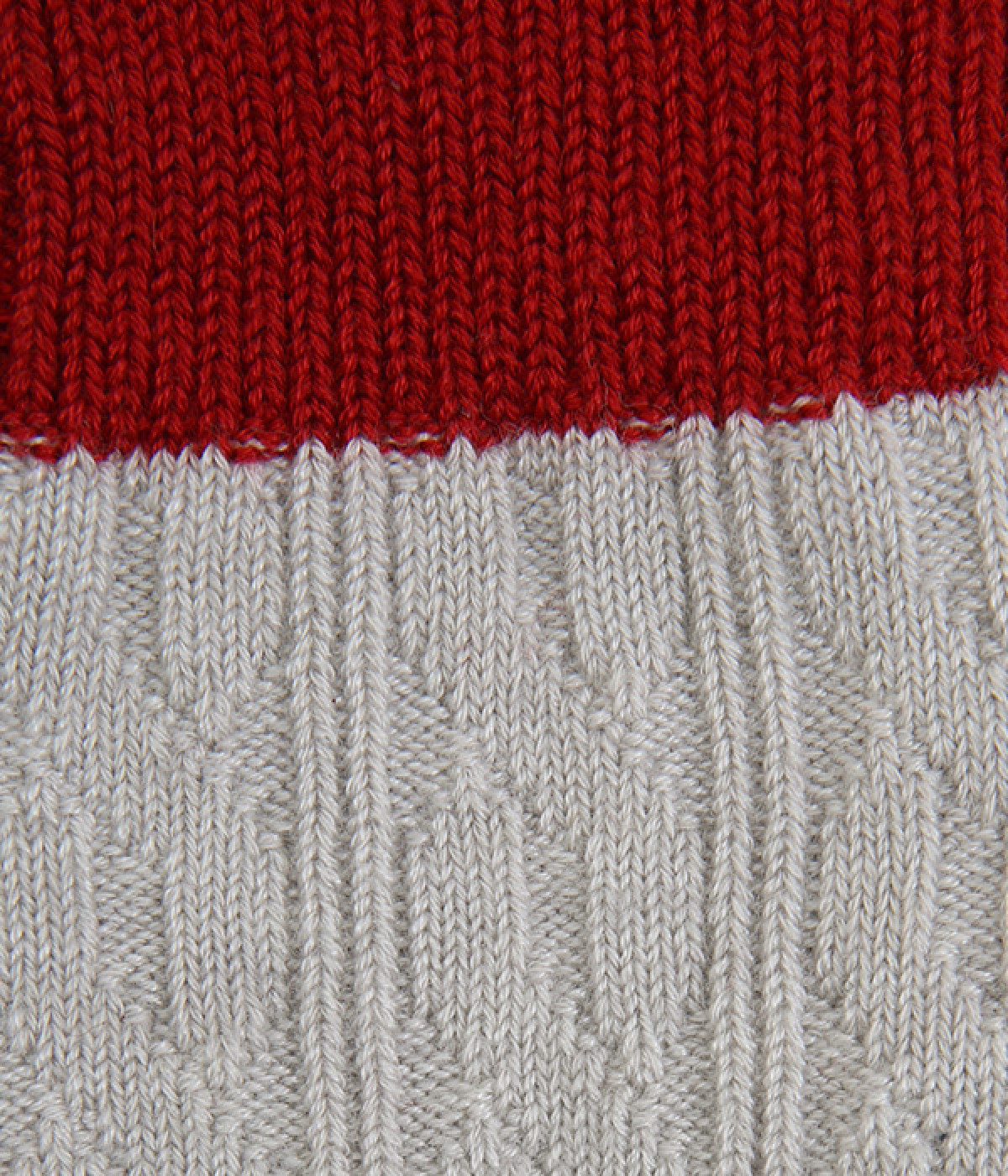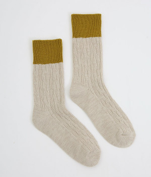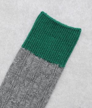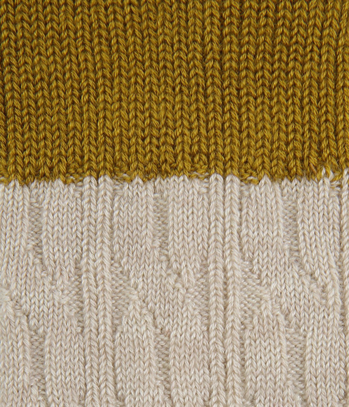チクチクしにくいコットンウールを使用。立体感のあるケーブル編みと繊細なリブの編みを組み合わせ、表情ゆたかに仕上げました。どんなシューズにも合わせやすい、ほどよい厚みもポイントです。