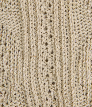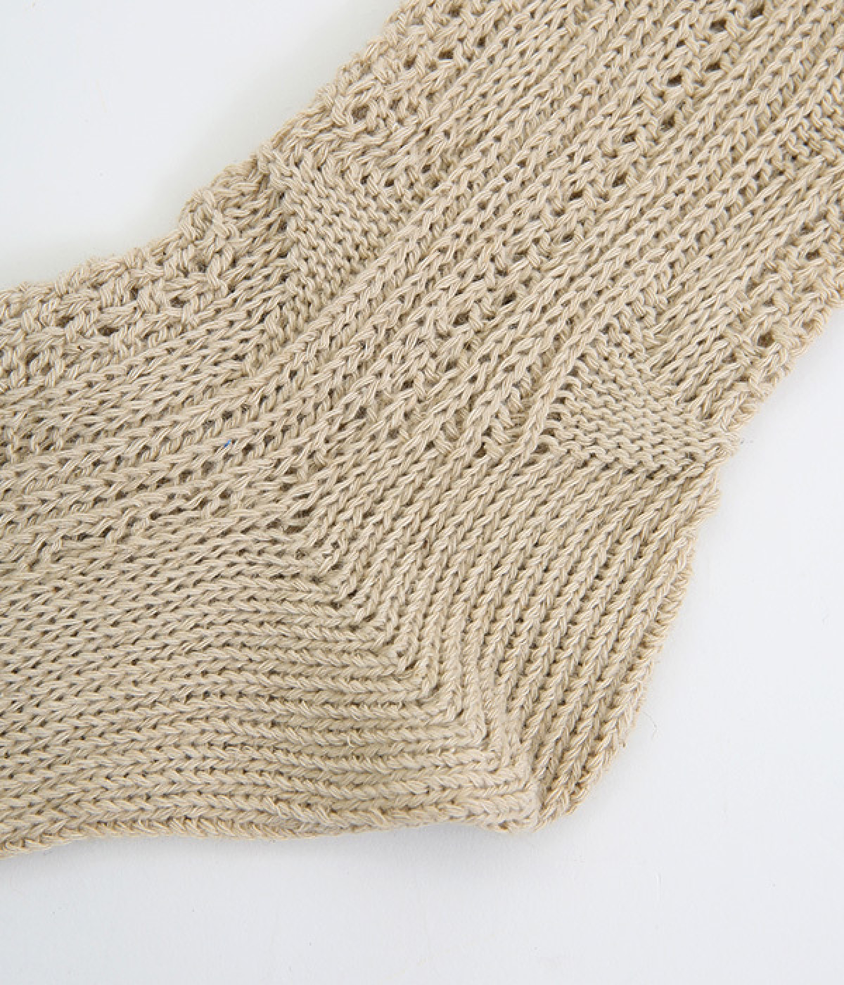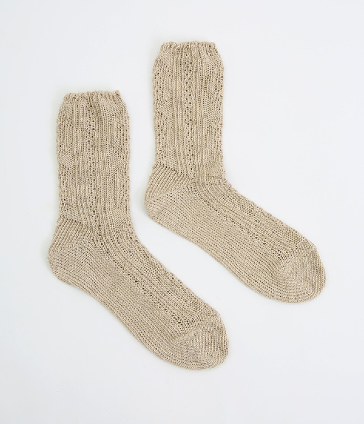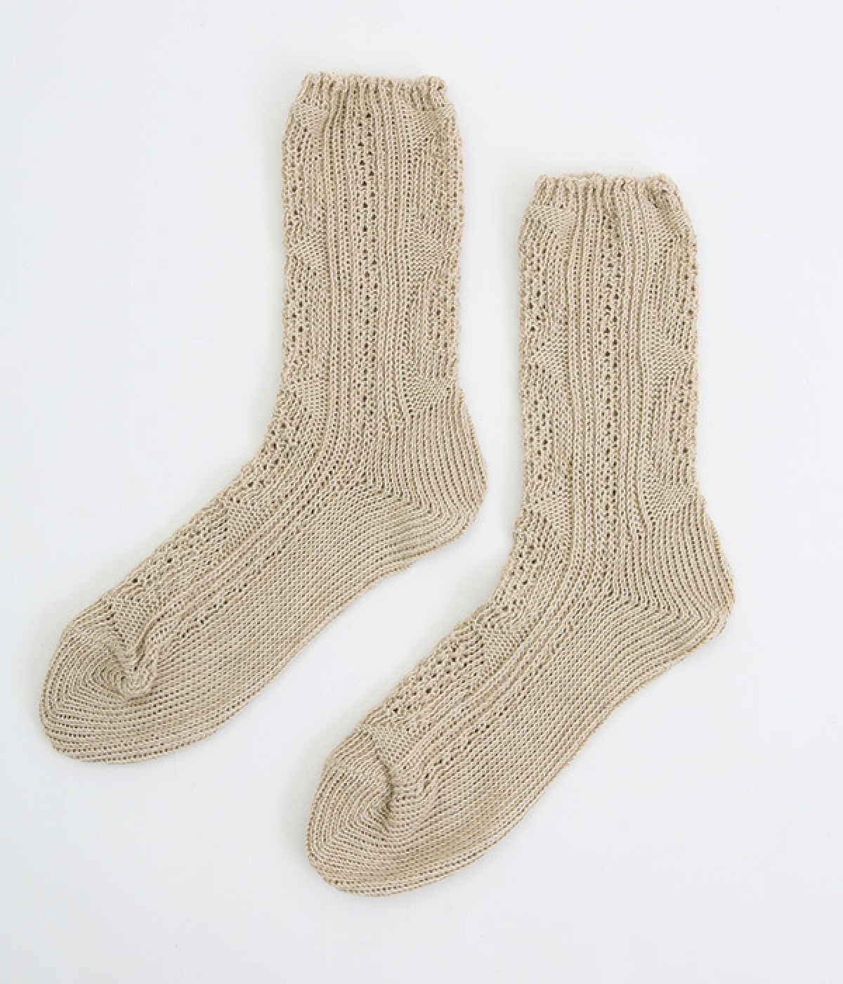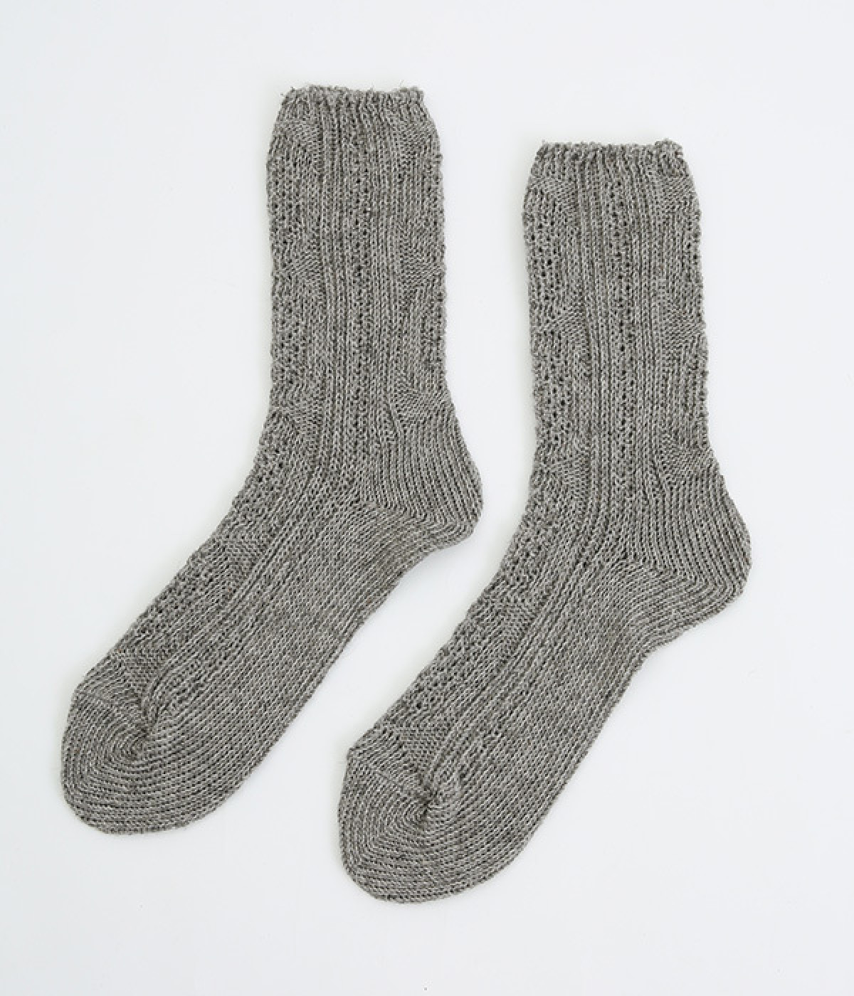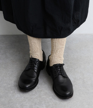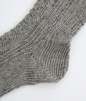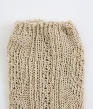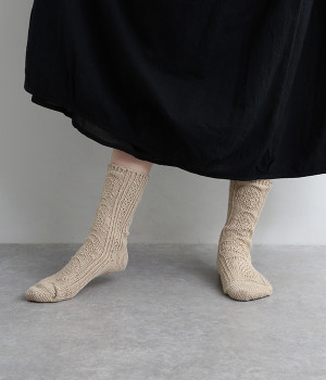 アランセーターをイメージしたざっくりとした透け感がある編み柄のソックスです。ナチュラルな風合いが楽しめるコットン&リネンの糸で弾性糸を使用せず、ゆったりと編み立てました。締めつけをほとんど感じない優しい履き心地が魅力です。ナチュラルな装いにも相性が良く、スニーカーやローファーにはもちろん、サンダルに合わせても◎。おうち時間からお出かけまで大活躍な一足です。